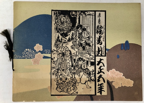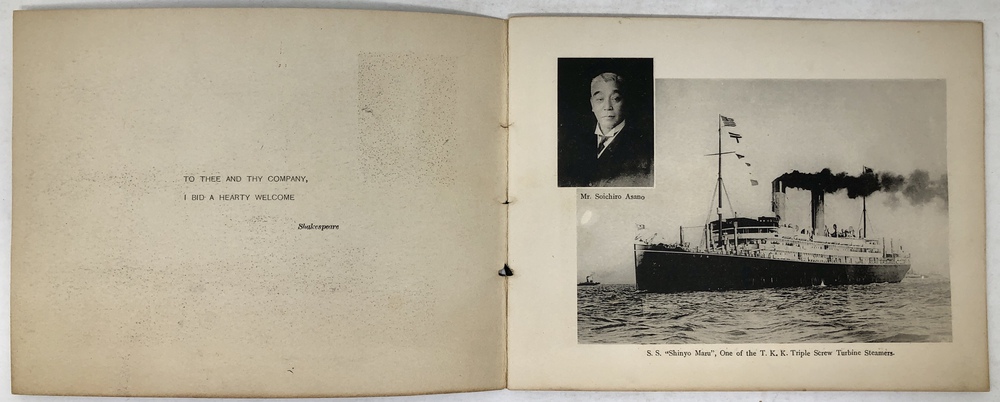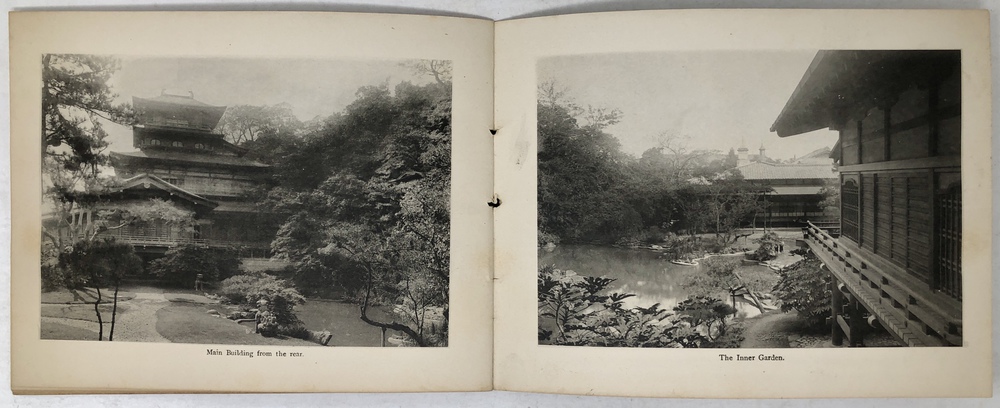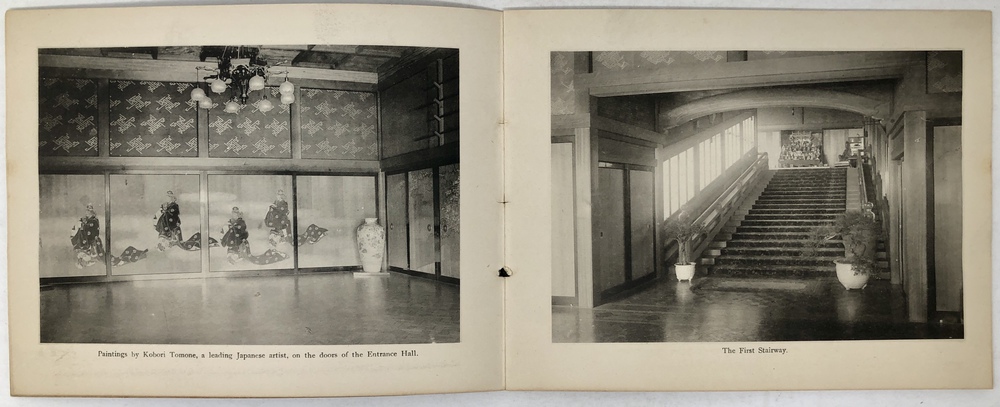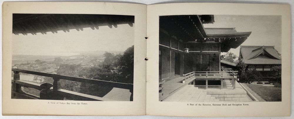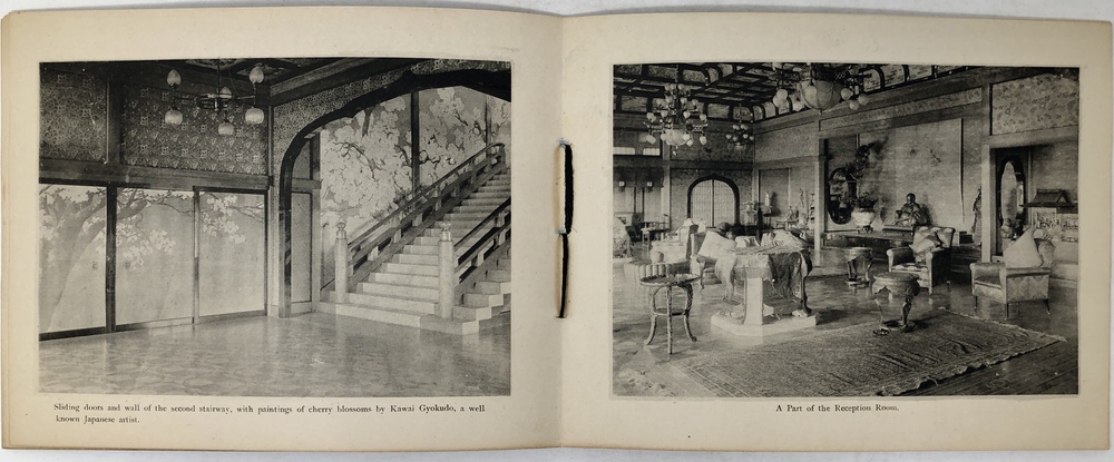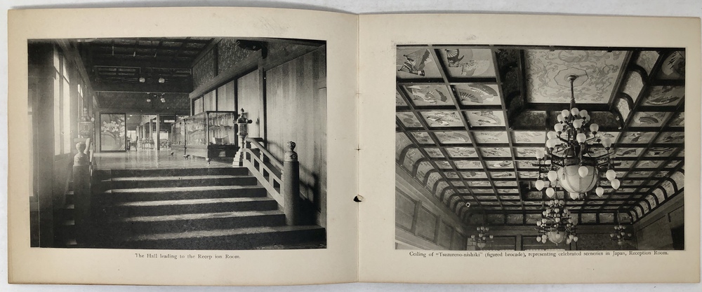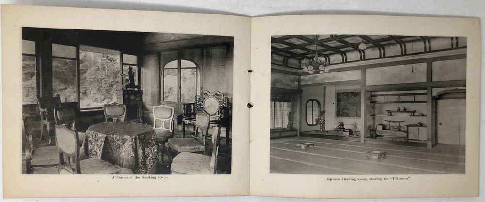 このブックレットは、東洋汽船会社社主の浅野総一郎が、自社の一等船客として来日した外国人をもてなすために東京三田に建てた壮大な邸宅である紫雲閣を英文と写真で紹介したものです。浅野総一郎が東洋汽船を創立したのは、当然ビジネスとしての営利追求があったことは確かですが、同時に特にアメリカを中心とした諸外国と日本との友好、親善を深めることも大いにその目的であったと言われていて、そのことを裏付けるように、浅野は資材を投じて、自社船で来日した外国人を歓待するための邸宅として紫雲閣を建てました。外国人観光客を迎えるためという目的に沿うように、天井、柱、階段、襖、欄間といったあらゆる要素に当時最高水準の技術を惜しみなく投入し、日本美術の趣向を凝らした内装、外装で豪華に飾るとともに、内部には多くの日本美術品が飾られていました。現代の視点から見るとやや過剰とも思える装飾が施された紫雲閣は、東洋汽船で来日する外国人観光客の名物にもなっていたようで、当時来日した外国人観光客が残したガイドブックや、パンフレットには浅野による招待状が挟み込まれていたり、紫雲閣を訪ねた際の感想を記した記述がみられるなど、浅野の目的は一定の成果を上げていたのではないかと思われます。このブックレットは、紫雲閣の内部と外部の見所を写真と英文で案内したもので、戦災によって焼失してしまった紫雲角の在りし日の姿を知ることができる大変貴重なものです。おそらくは、東洋汽船の一等船客に招待状と一緒に配られたものか、あるいは紫雲角を訪れた際に記念に配られたものではないかと思われます。