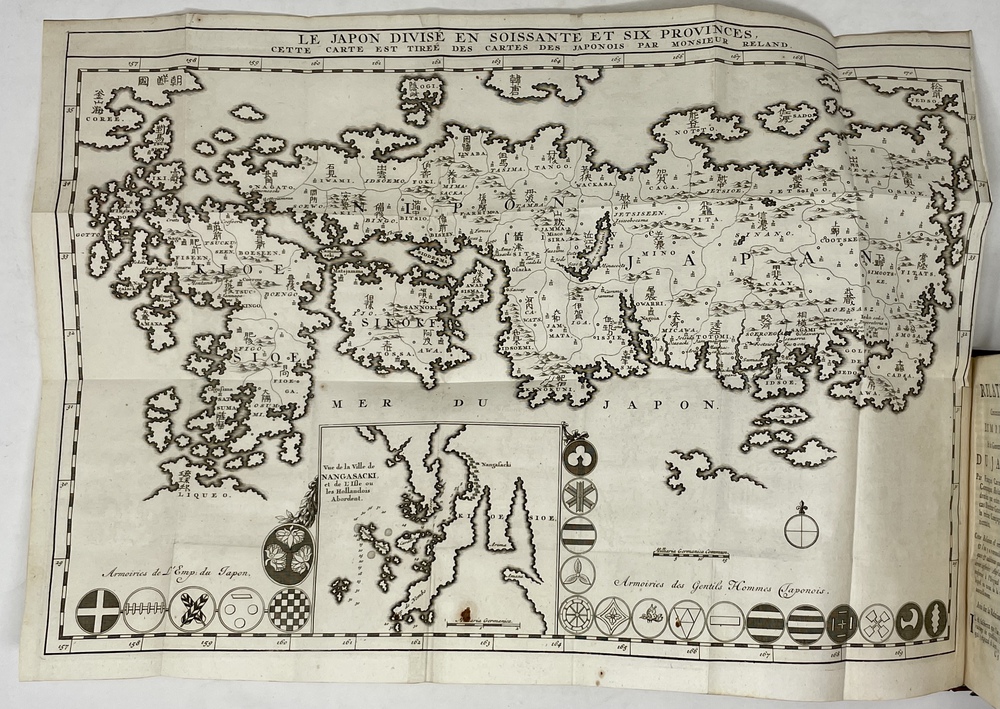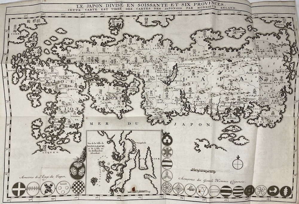 この記事、並びに本書に収録されている日本関係記事全体を補うために、第3巻には東洋学者レーラント(Adriaan Reland, 1676 - 1718)がある日本の地図(石川流宣言による日本図)をもとに発表したばかり「日本帝国図(Imperium Japonicum)」の改変版である「66か国に分かれたる日本図(Le Japon divisé en Soissante et six provinces)」が収録されています。この地図は、1691年に石川流宣が刊行した「大日本国大絵図」に基づいて作成されたもので、原図をただそのまま翻刻するのではなく、本図中央下に見られるように長崎湾付近を描いた図を挿入しているほか、主要な大名家の家紋と思しき紋章を多数掲載しています。この図は、原図となった石川流宣の「大日本国大絵図」が、地理学的な意味での正確性よりも、ある程度デフォルメを施して日本全体を描くことを優先した地図であったことから、西洋製の日本図の精度としてはそれ以前にすでに製作されていた地図よりも後退することになってしまったことは否めませんが、各国(藩)名が漢字でそのまま記されていることから、地名の理解という点ではこれまでの西洋性に本図にはない大きな特徴を持っています。この非常に特徴的な地図は、ヨーロッパでも好評を博したようで、本書刊行以降も様々な形で繰り返し再販されています。なお、本書が刊行された1715年と同年に単独地図としてレーラント自身が出版した地図と、本図のいずれが初版に該当するものかについては、長らく議論が続いていました(ジェイソン・C・ハバード『世界の中の日本地図』2018年、柏書房(日本語版)、314-320頁参照)が、本書テキストにおいて、はっきりと「レーラントの地図」と記されていますので、ここから、やはりレーラント自身によるものが先行する図であったことが明らかになると思われます。