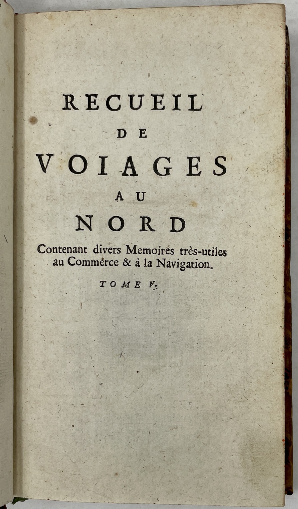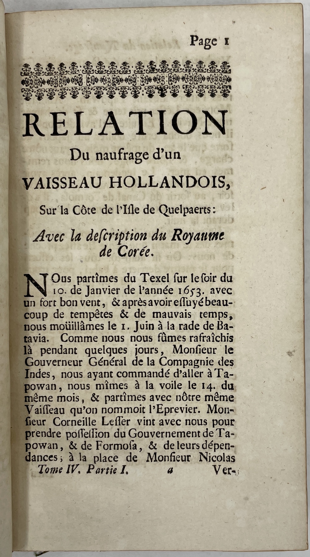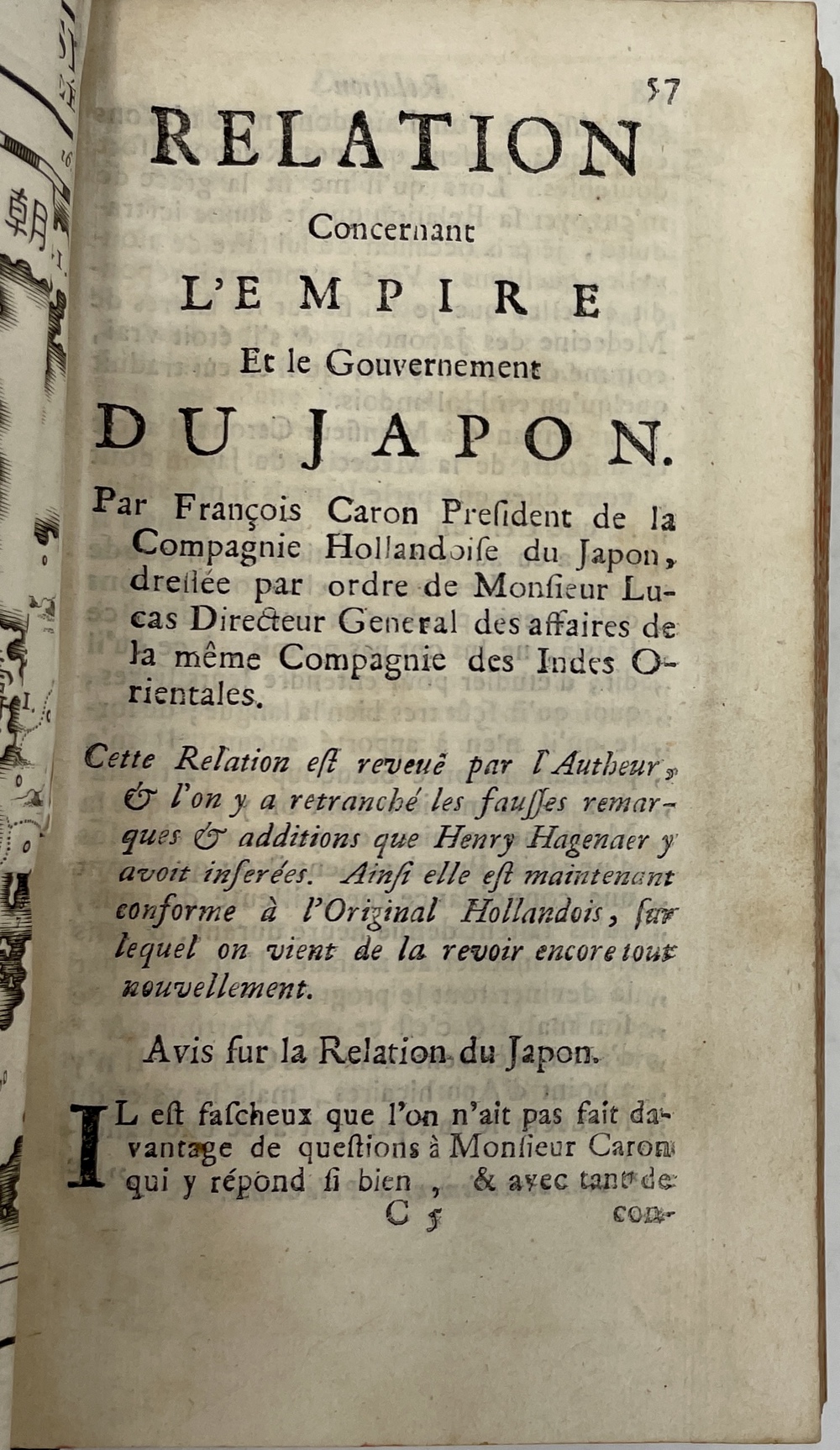 本書は、フランスの著述家、出版人であったバーナード(Jean Frederic Bernard, 1680 – 1744)が編集した『北方探検記』第3巻から第6巻にあたるもので、初期オランダ商館長として多大な貢献をなしたカロン「日本大王国志」をはじめ、カロンが後年使えたフランスにおいて、コルベールの命によって著した「日本との通商関係樹立のための覚書」、オランダ人フリースによる現在の北海道付近の航海の記録である「蝦夷発見記」、13年もの間朝鮮に抑留された後に日本へと脱走して帰国したオランダ人ハメルが記した「朝鮮幽囚記」等々、日本に関係する極めて重要な記述が多数収録されている非常に重要な文献です。