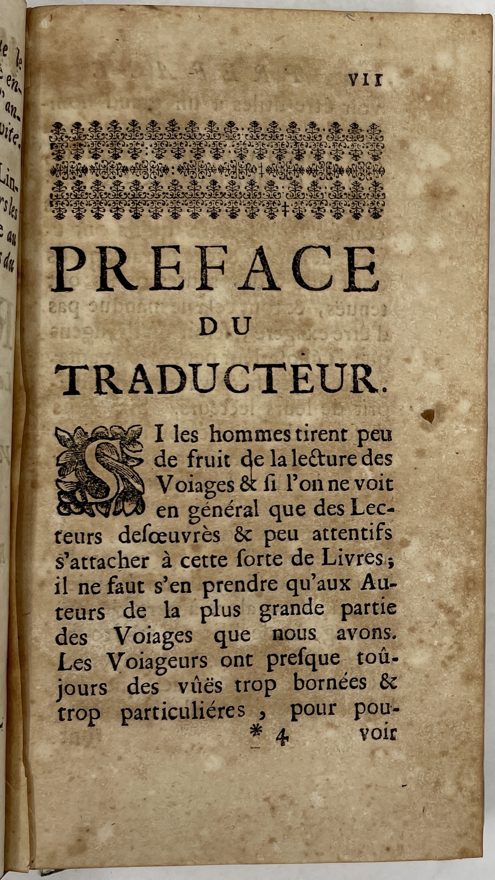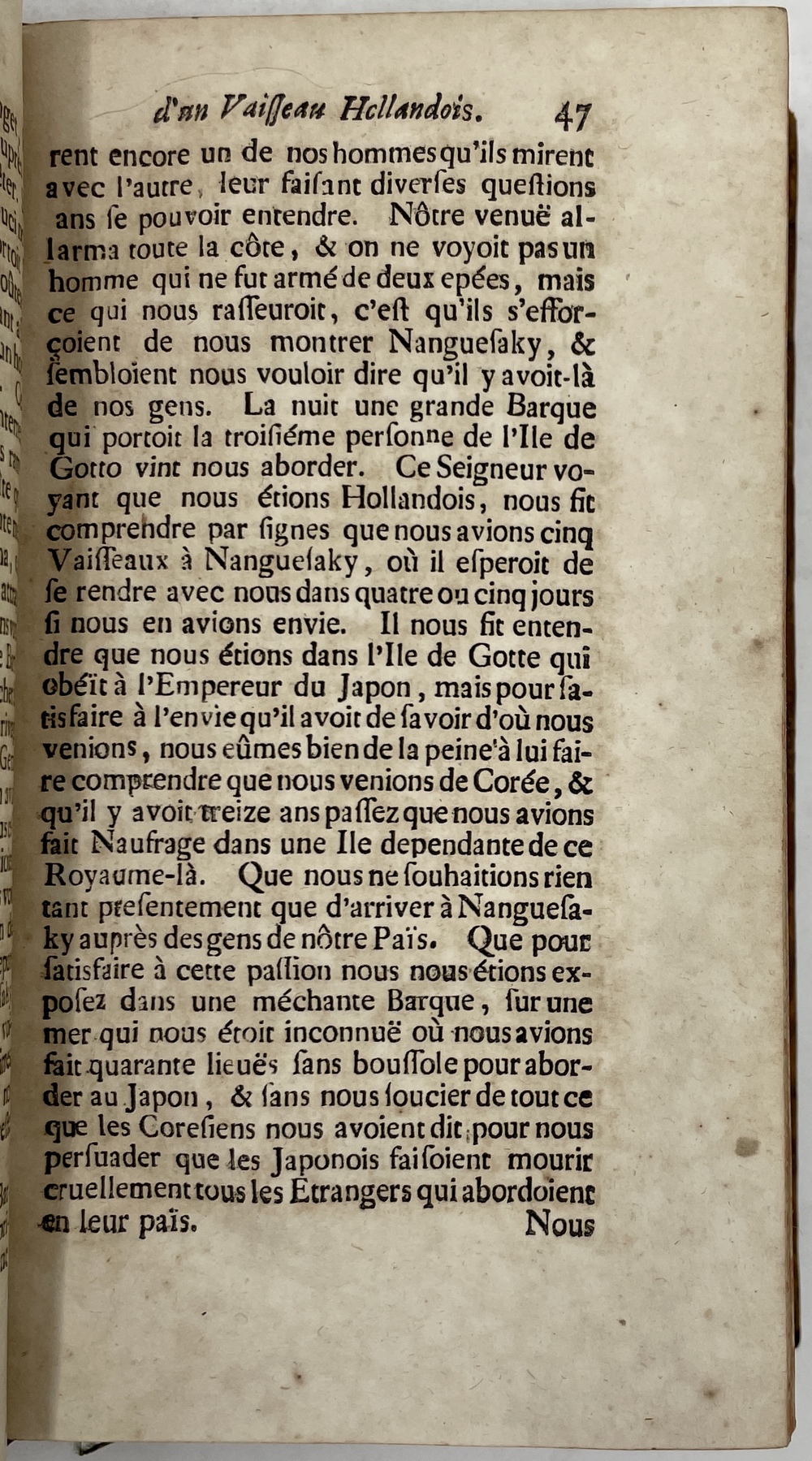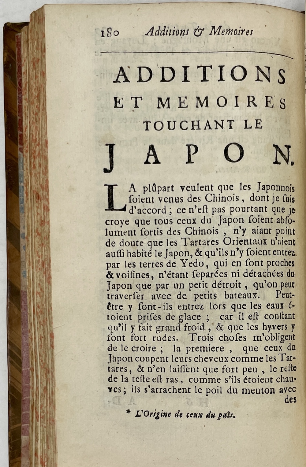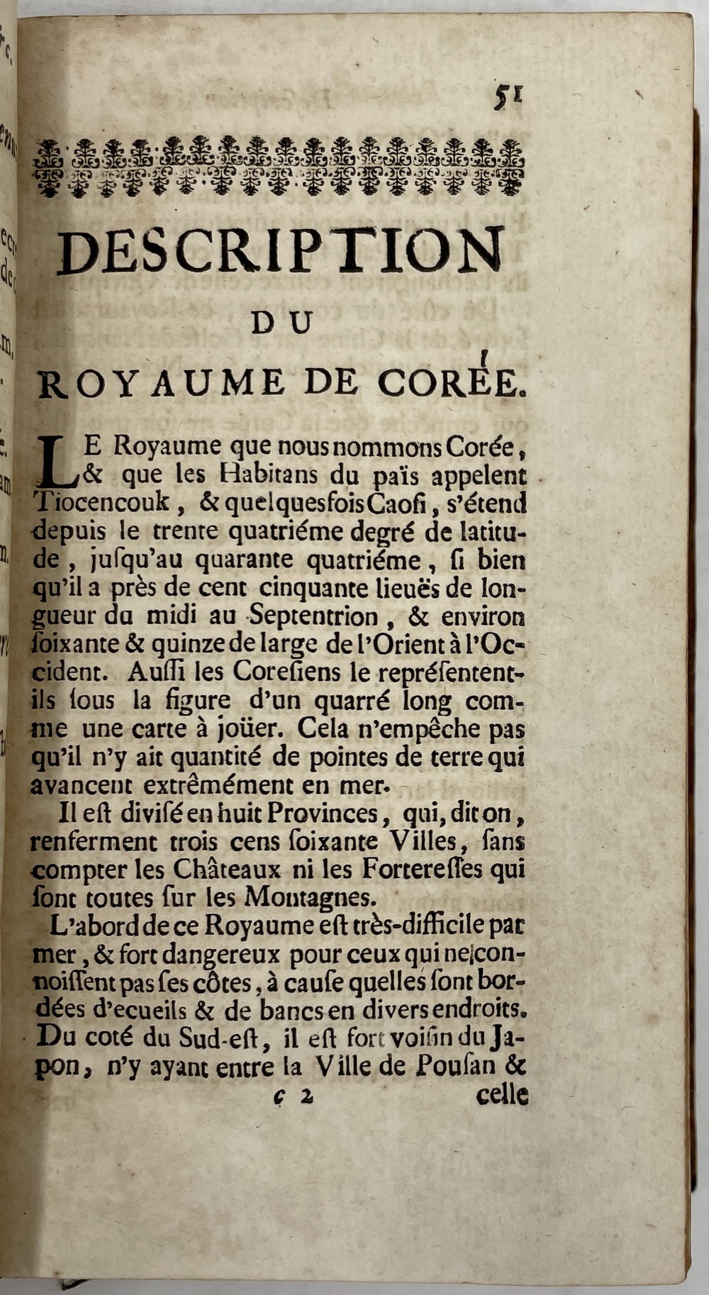 本書は、フランスの著述家、出版人であったバーナード(Jean Frederic Bernard, 1680 – 1744)が編集した『北方探検記』第3巻から第6巻にあたるもので、初期オランダ商館長として多大な貢献をなしたカロン「日本大王国志」をはじめ、カロンが後年使えたフランスにおいて、コルベールの命によって著した「日本との通商関係樹立のための覚書」、オランダ人フリースによる現在の北海道付近の航海の記録である「蝦夷発見記」、13年もの間朝鮮に抑留された後に日本へと脱走して帰国したオランダ人ハメルが記した「朝鮮幽囚記」等々、日本に関係する極めて重要な記述が多数収録されている非常に重要な文献です。