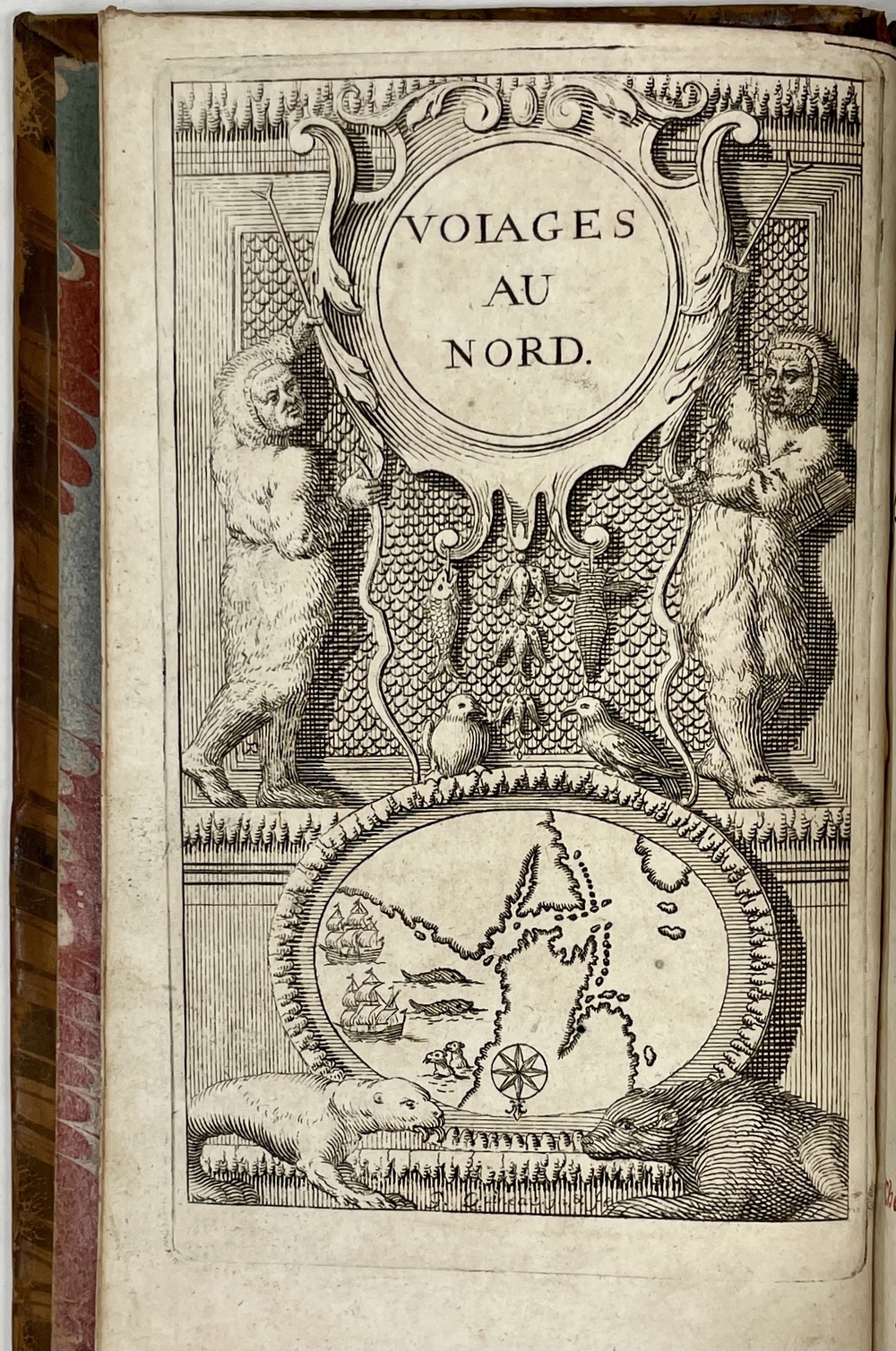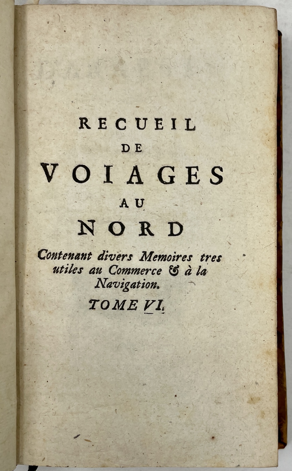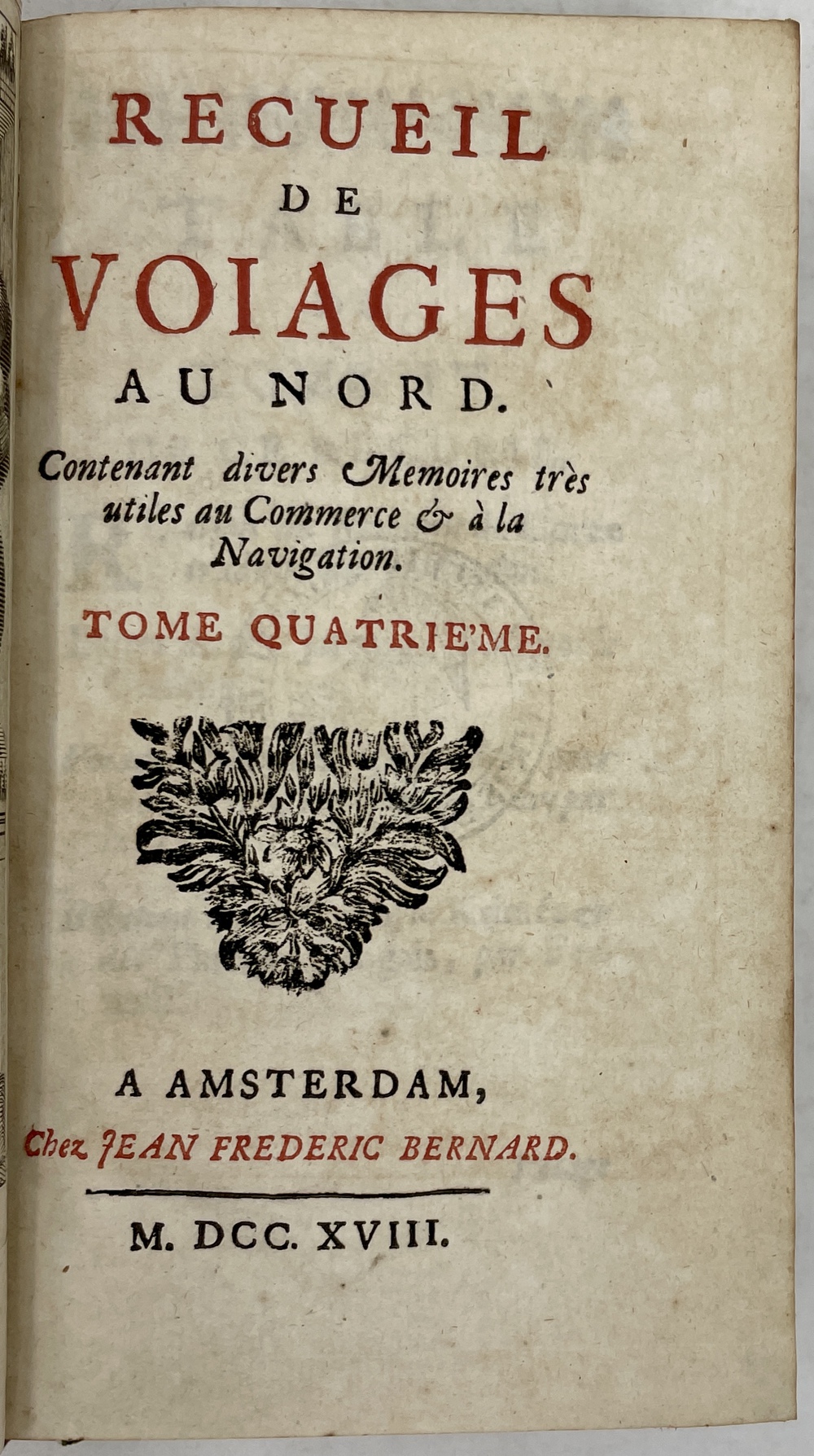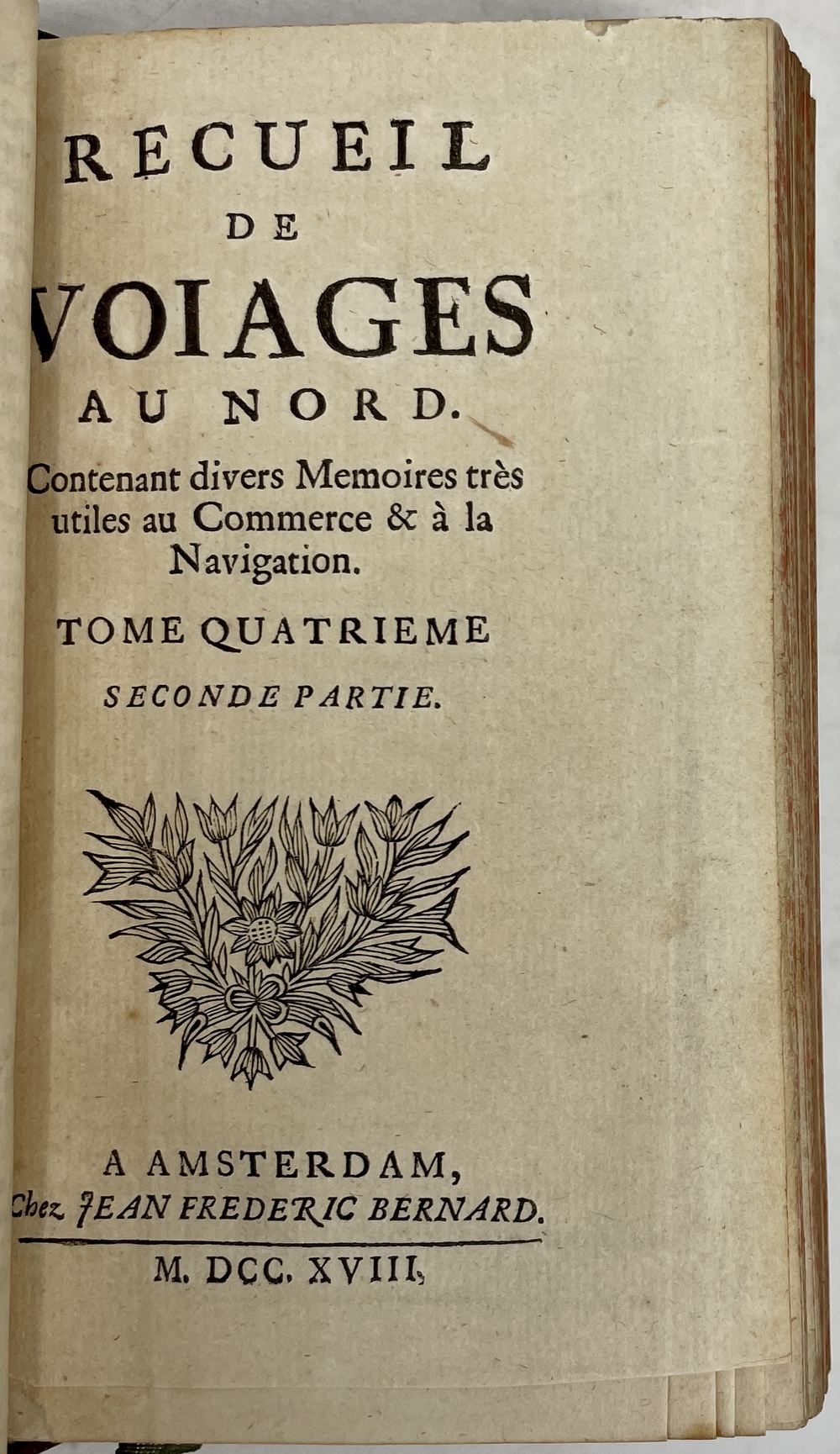 バーナードは、『偶像崇拝の国々の宗教文化と儀式(Cérémonies et coutumes religieuses de tous les peuples du monde. 1723-27)』の執筆者としても知られるように、世界各国の風習、文化に強い関心を持っていたものと思われます。また、1725年にはコメリン(Isaac Commelin, 1598 - 1676)の『東インド会社の起源と発展(Begin ende voortgangh van de Vereenighde Nederlantsche Geoctroyeerde Oost-Indische Compagnie, 2 vols. Amsterdam. 1644 / 1645 / 1646.)』のフランス語訳(Recueil des voiages qui ont servi à l'établissement et aux progrès de la Compagnie des Indes Orientales, formé dans les Provinces Unies des Pais-bas. 7 vols. Amsterdam, 1702-1707)の出版も行っています。バーナードが、ヨーロッパにとって特に未解明であった北方海域について、当時最新の知見を集成すべく刊行したのが本書『北方探検記』です。ユーラシア大陸を北東に向けて航海して直接アジアに到達しようとする北東航路、またアメリカ大陸の北西を直接アジアに到達しようとする北西航路の開拓は、大航海時代の後発国であるオランダ、イギリス、フランスにとっての彼岸で、16世紀末以降、様々な試みがなされて続けていましたが、この北東航路と北西航路の実現のためには、ユーラシア大陸とアメリカ大陸の「北方」、ならびに両大陸の間に位置する海域の地理情報の把握が必要不可欠でした。バーナードによる『北方探検記集』はこうした情報を提供するために編纂されたものと思われ、刊行直後から好評を博し、多くの海賊版や異本、後年の続編が出されるなど、多くの人々に読まれたことがわかっています。本書は、1715年にアムステルダムで最初に3巻本として刊行され、1718年に続刊として第4巻から第6巻を刊行し、本書にあたる全6巻構成となりました。この企画は、それ以降も版を重ねると同時に第7巻以降も刊行され、最終的には構成を変更しながら全10巻にまで拡張されています。本書は、特に日本関係記事を多数収録している点において、注目に値すべき文献です。