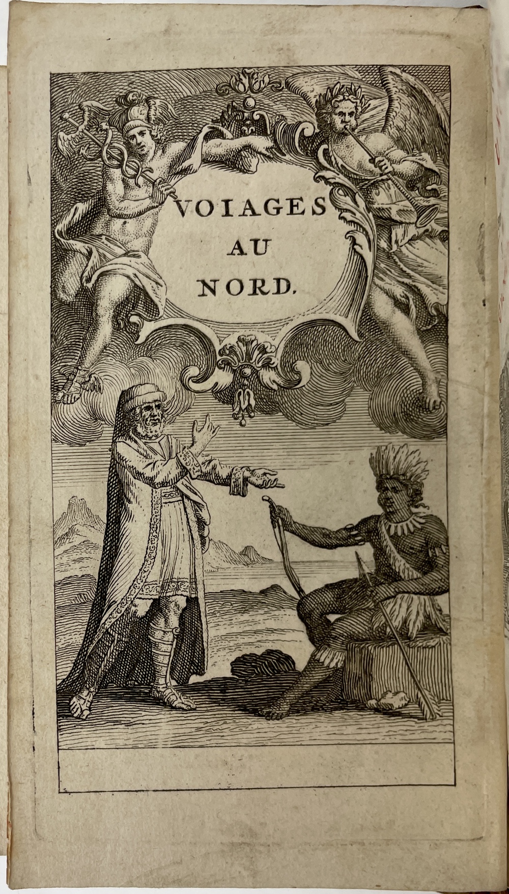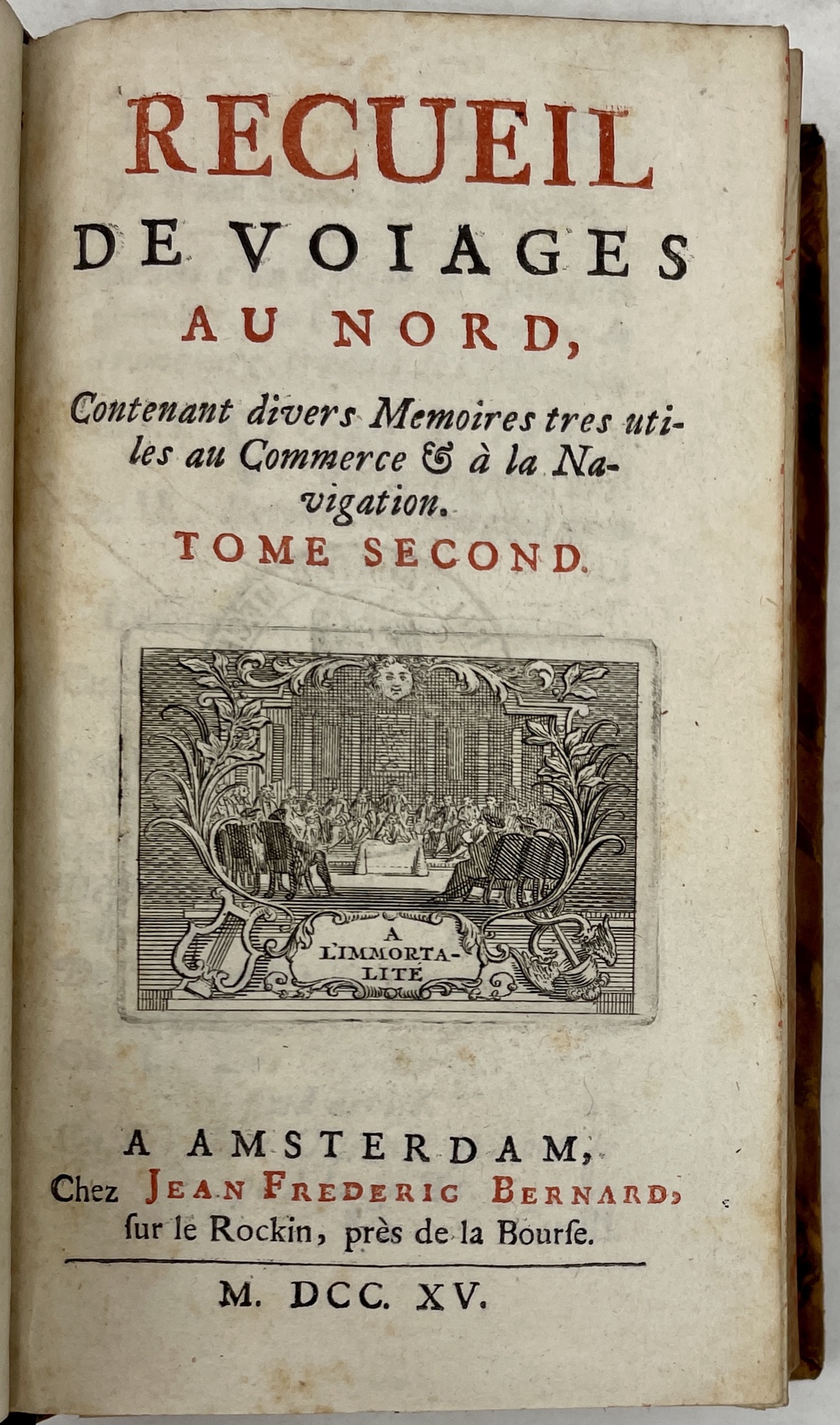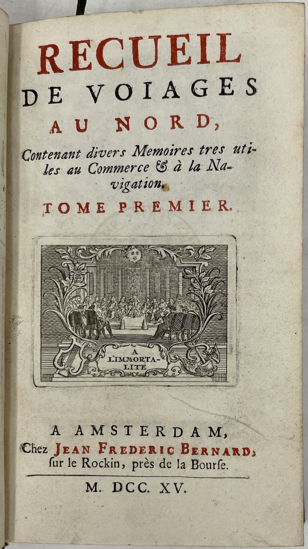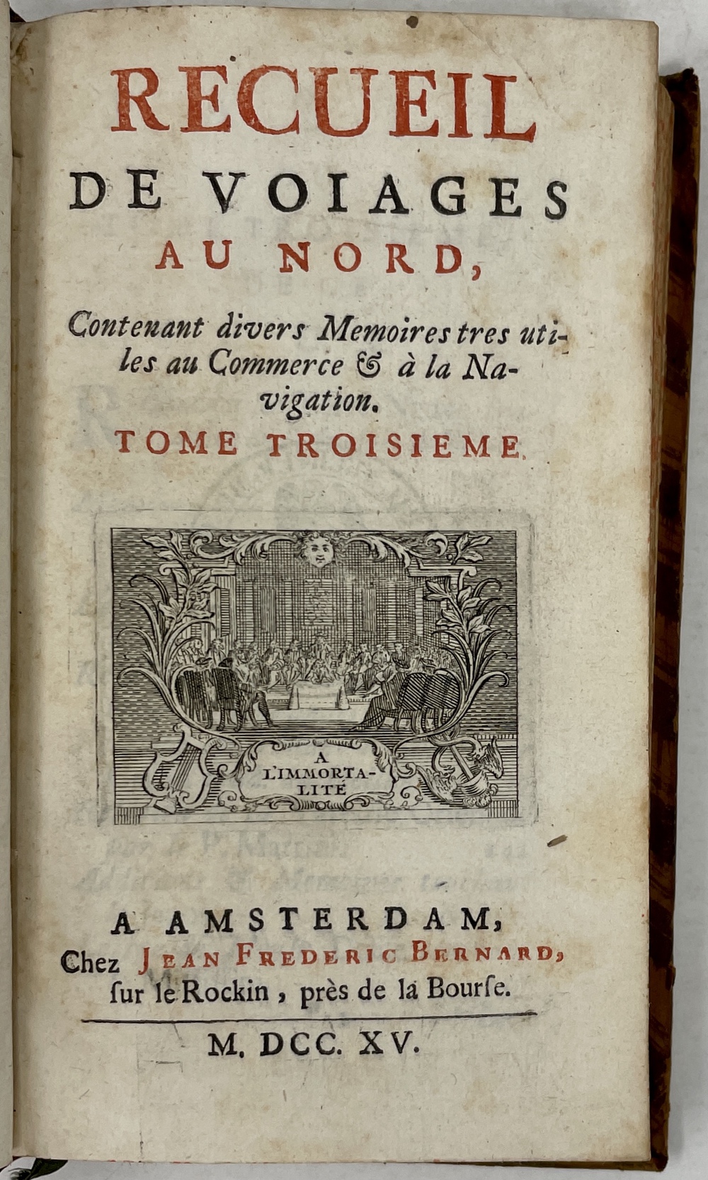 バーナードは、『偶像崇拝の国々の宗教文化と儀式(Cérémonies et coutumes religieuses de tous les peuples du monde. 1723-27)』の執筆者としても知られるように、世界各国の風習、文化に強い関心を持っていたものと思われます。また、1725年にはコメリン(Isaac Commelin, 1598 - 1676)の『東インド会社の起源と発展(Begin ende voortgangh van de Vereenighde Nederlantsche Geoctroyeerde Oost-Indische Compagnie, 2 vols. Amsterdam. 1644 / 1645 / 1646.)』のフランス語訳(Recueil des voiages qui ont servi à l'établissement et aux progrès de la Compagnie des Indes Orientales, formé dans les Provinces Unies des Pais-bas. 7 vols. Amsterdam, 1702-1707)の出版も行っています。バーナードが、ヨーロッパにとって特に未解明であった北方海域について、当時最新の知見を集成すべく刊行したのが本書『北方探検記』です。ユーラシア大陸を北東に向けて航海して直接アジアに到達しようとする北東航路、またアメリカ大陸の北西を直接アジアに到達しようとする北西航路の開拓は、大航海時代の後発国であるオランダ、イギリス、フランスにとっての彼岸で、16世紀末以降、様々な試みがなされて続けていましたが、この北東航路と北西航路の実現のためには、ユーラシア大陸とアメリカ大陸の「北方」、ならびに両大陸の間に位置する海域の地理情報の把握が必要不可欠でした。バーナードによる『北方探検記集』はこうした情報を提供するために編纂されたものと思われ、刊行直後から好評を博し、多くの海賊版や異本、後年の続編が出されるなど、多くの人々に読まれたことがわかっています。本書は、1715年にアムステルダムで最初に3巻本として刊行され、1718年に続刊として第4巻から第6巻を刊行し、本書にあたる全6巻構成となりました。この企画は、それ以降も版を重ねると同時に第7巻以降も刊行され、最終的には構成を変更しながら全10巻にまで拡張されています。本書は、特に日本関係記事を多数収録している点において、注目に値すべき文献です。