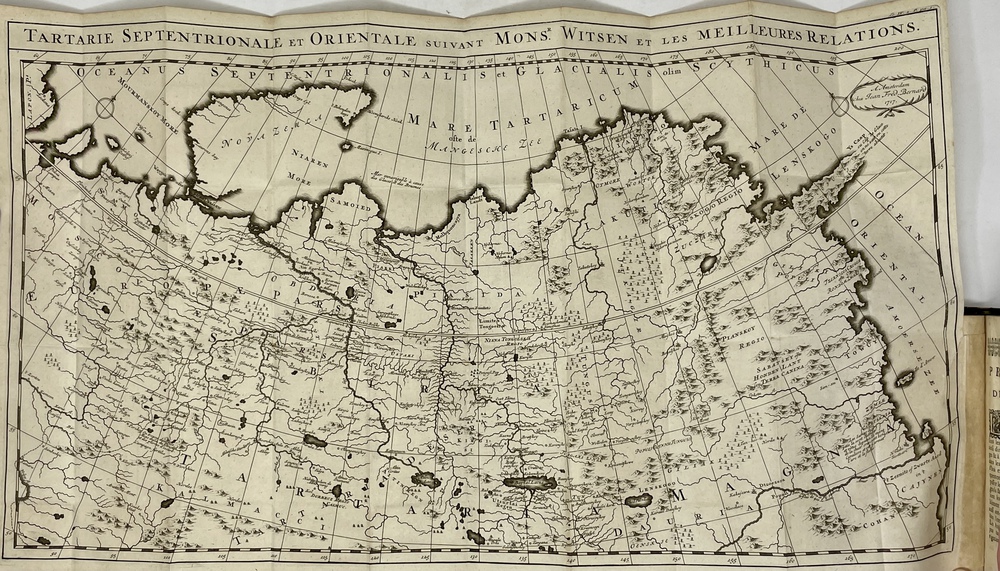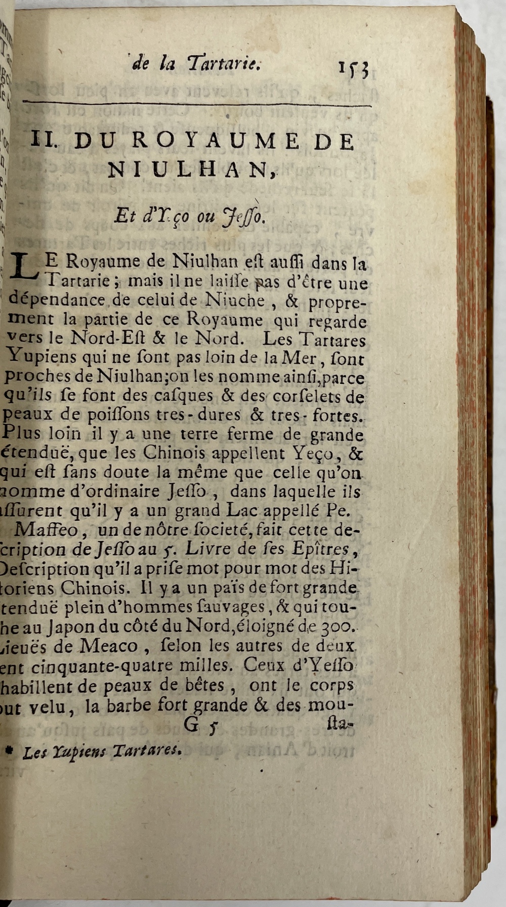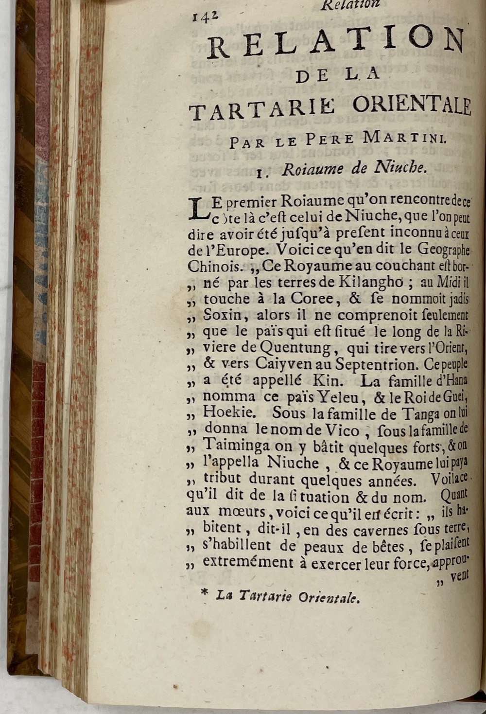 第3巻4を著したマルティニ(Martino Martini, 1614 – 1661)は、1642年から10年近くにわたって中国宣教に従事したイエズス会宣教師ですが、彼はさらに北方の韃靼と呼ばれる地域、そしてその海上を隔てた先にある蝦夷についての地理情報の収集にも尽力しており、ここに収録されている記事はまさにその成果を発表したものです。マルティニは明朝末期の1643年に杭州に到着して以来、各地を宣教師ながら移動を続け地理情報の収集と整理に努め、帰国後の1655年に出版した『中国新地図帳(Nous atlas Sinensis, Amsterdam, 1655)』は、同地についての詳細な地図情報をヨーロッパで初めて本格的に紹介した画期的な地図帳として高い評価を受けました。この地図帳に収録された日本図も同様に高い評価を受けており、ヨーロッパにおける、日本や蝦夷を含めた東アジア地域の地理情報の水準を高めることに大いに貢献したマルティニのテキストは大変重要なものと言えます。