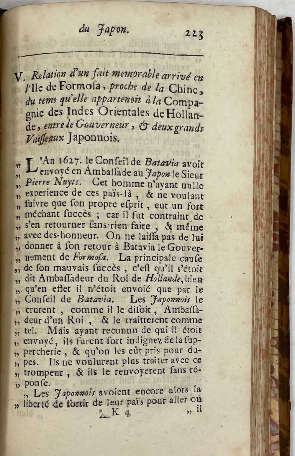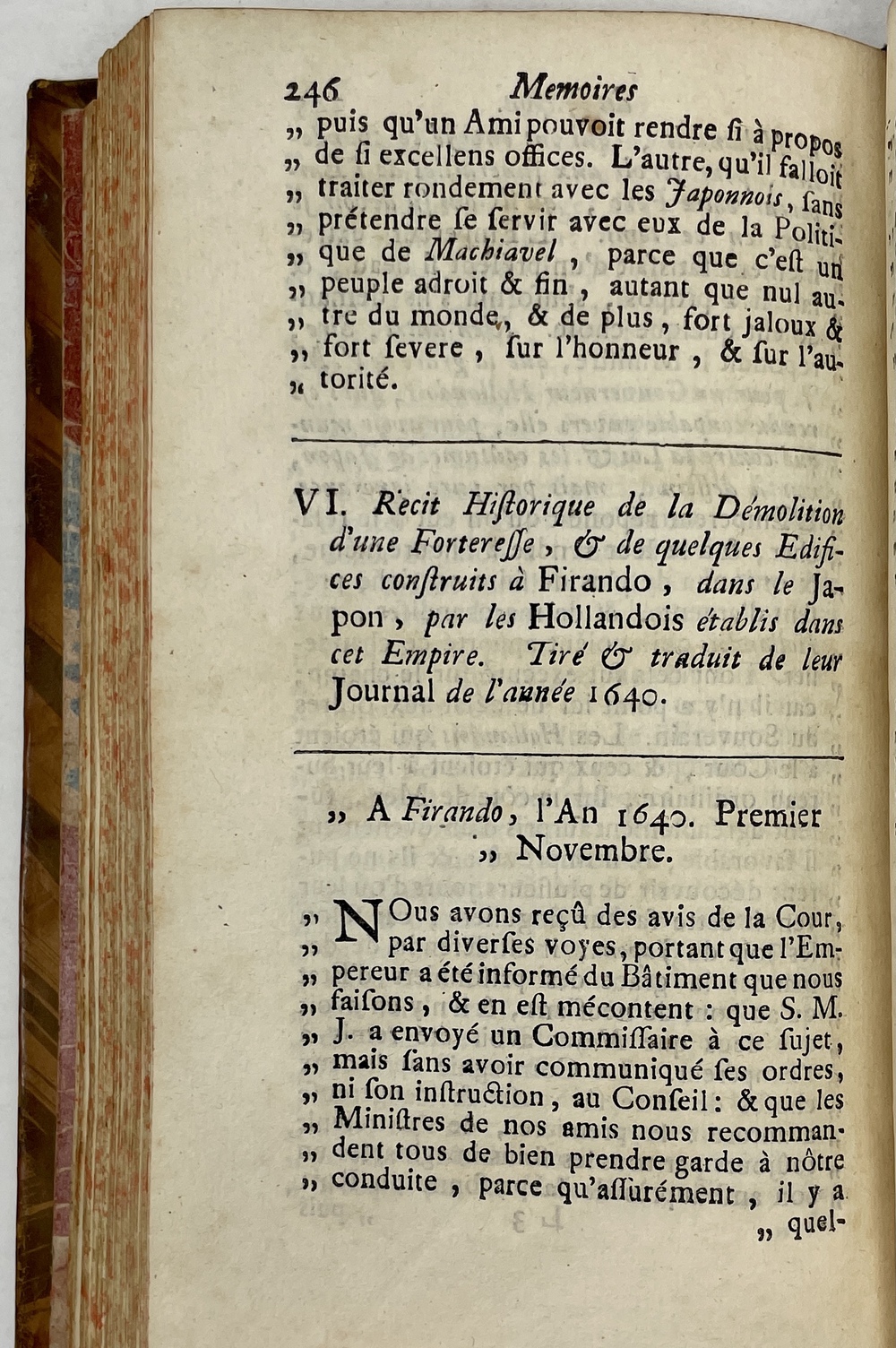 第3巻5から11までは「日本関係補遺」としてまとめられているものですが、いずれも非常に資料的価値が高いと思われる記事ばかりです。カロンは、離日後バタフィアの商務総監を務めるなどオランダ東インド会社の要人としてキャリアを重ねますが、会社との行き違いもあって1651年に帰国し会社を去ることになったところ、ルイ14世によってその絶頂期を迎えつつあったフランスの財務総監コルベール(Jean-Baptiste Colbert, 1619 - 1683)に請われて設立まもないフランス東インド会社に破格の待遇で迎えられることになりました。1661年にパリに赴いたカロンは、コルベールに対してフランスによるアジア貿易振興策を矢継ぎ早に提案しており、この時に作成したと思われる、フランスによる極東地域への使節派遣に向けた訓令書の草案が、7, 8であると思われます。9, 10, 11は、これらの草案を補足するべく、日本とヨーロッパとの交易の歴史を理解する上で重要と思われる事件に関連する資料をまとめたものと推察されるものです。ポルトガルが日本を追われることになった経緯を報告した公文書や、初期の日蘭貿易において深刻な問題をもたらした、台湾におけるオランダ東インド会社と日本の朱印船との間で生じた事件(オランダ東インド会社総督の名に因んでヌイツ事件と呼ばれる)の報告、そして平戸のオランダ商館が取り壊し命令を受けた際の記録を、平戸商館日記から翻訳する形で掲載しています。いずれもカロンが深く関与した事件であり、恐らくカロンが先の訓令書草案をコルベールに提出する際に合わせて提出したものではないかと思われます。