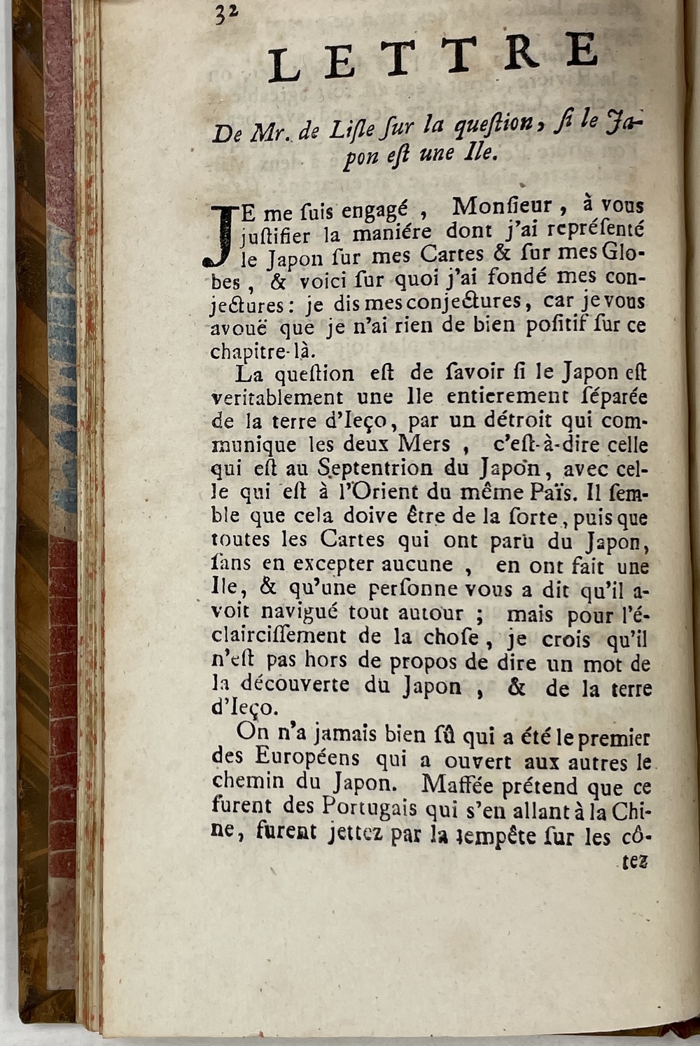 第3巻1の著者であるリール(Mr. de Lisle)についての詳細は不明ですが、この論考では、当時「日本」と呼ばれていた本州と、その北方にある蝦夷(現在の北海道)が繋がっているのか否か、また蝦夷がアジア、あるいはアメリカ大陸とつながっているのかどうかについて、それまでヨーロッパで刊行された日本図や記事を比較検討しながら論じたものです。リールは、イエズス会士フロイスの書簡や、本書に収録されているカロンの著作なども援用しながら考察を行なっており、北東航路の実現のために重要な位置を占めていた蝦夷近辺の地理情報をできるだけ多角的に整理しようと試みているようです。この論考は、『北方探検記』の編者であるバーナードの意図に最も沿った内容であることから、冒頭に置かれたものと思われます。