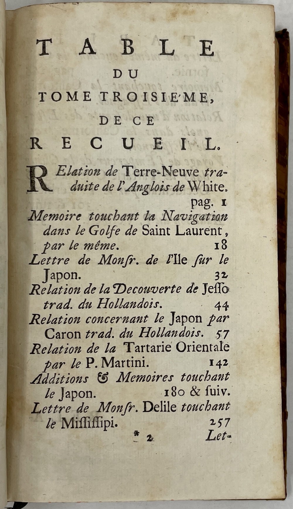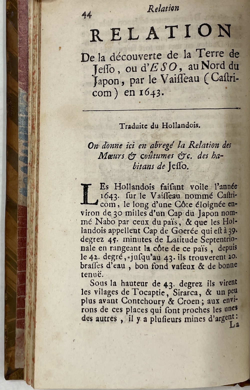 第3巻2は、オランダの航海士であるフリース(Maarten Gerrîsz. Vries, ? - 1647)が1643年に行った日本の北方海域の航海の記録を翻訳したものです。フリースの航海は、ヨーロッパ人による同海域の最初の航海となり、北海道東岸や択捉、得撫島などの測量情報をヨーロッパにもたらしたことで知られています。フリースがもたらした情報は、長きにわたって日本北方海域の貴重な情報としてヨーロッパにおいて影響力を与え、同地域の地図作成の際の最も権威ある情報として重宝されています。特にこの海域の最新情報を収集することが、編者バーナードの狙いだったとことに鑑みれば、この記事が2番目に掲載されていることも非常に合点がいくものです。