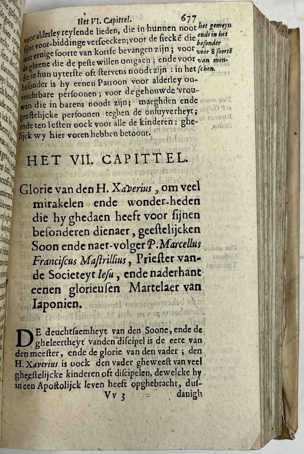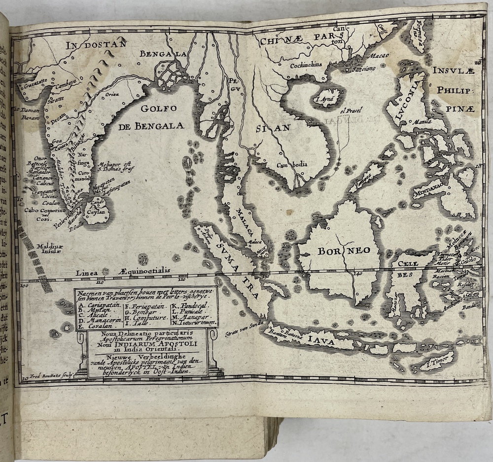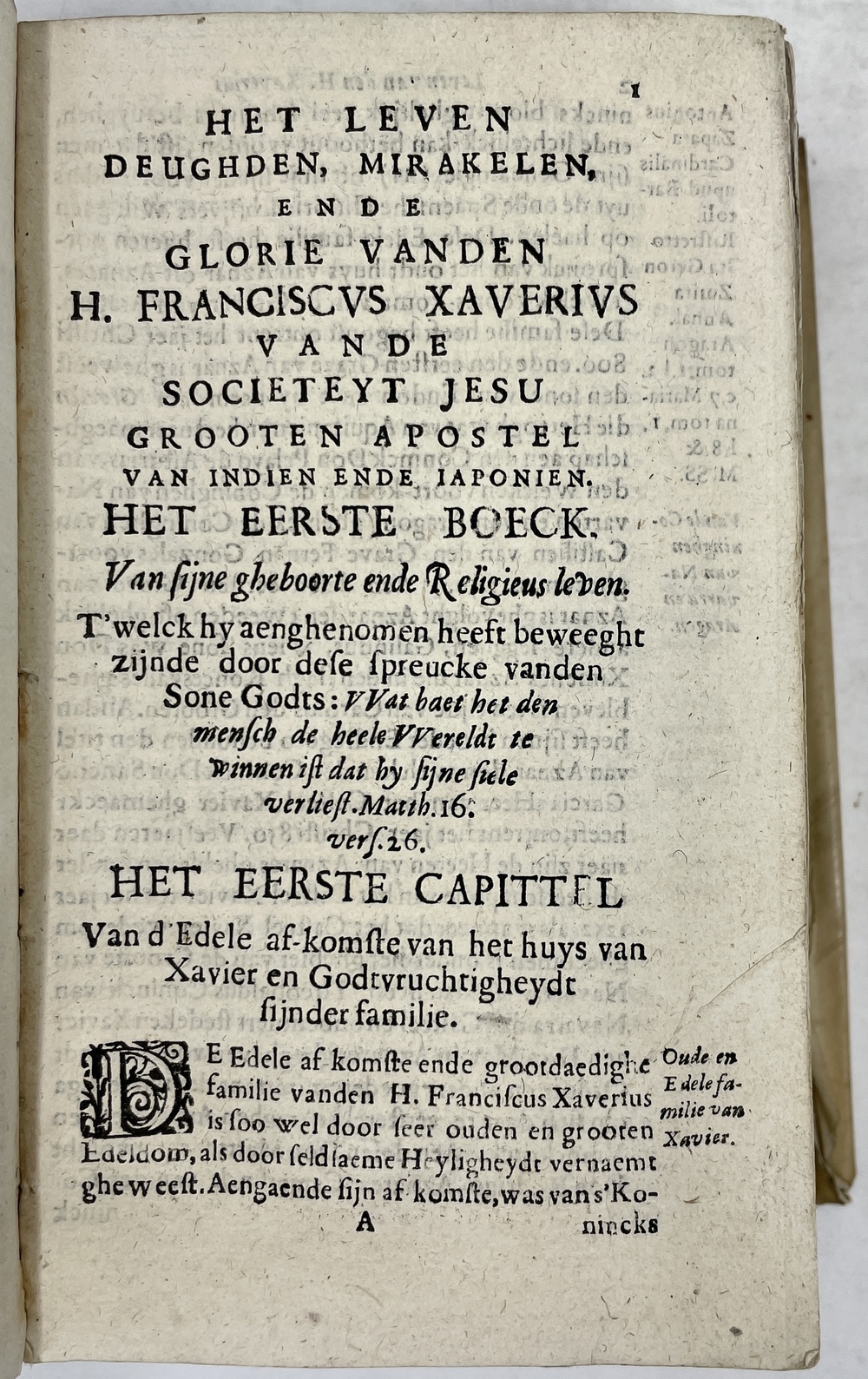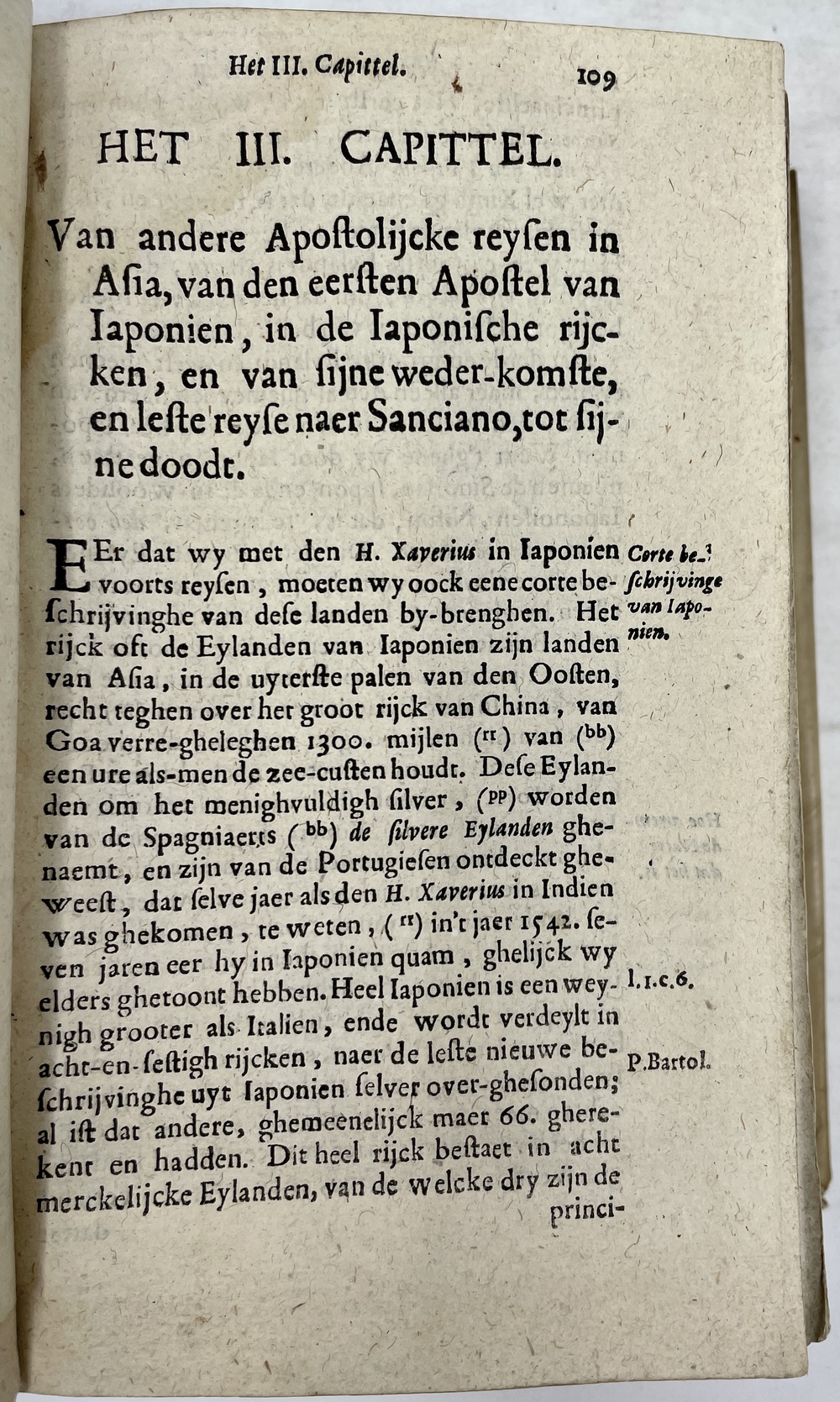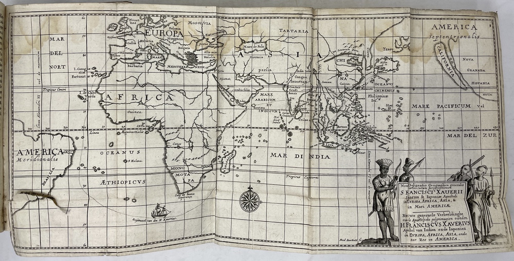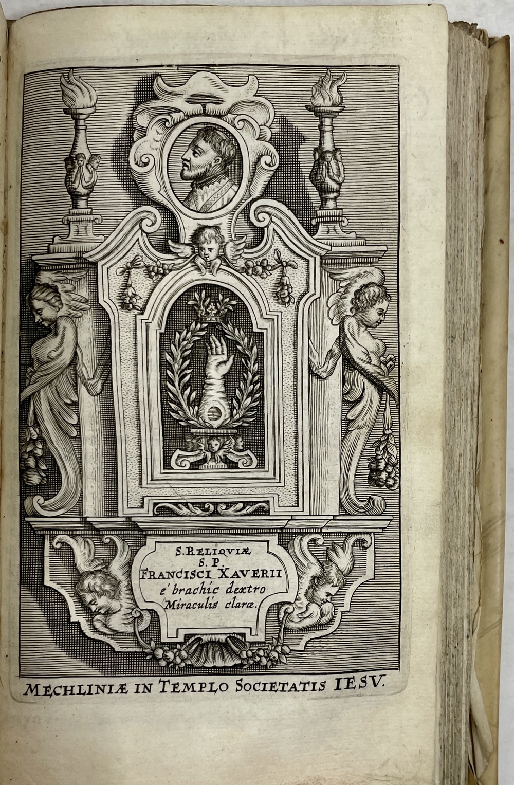 本書は全1,000ページを越える大部の著作で、ザビエルの生涯についての記述を中心に、彼にまつわるさまざまな事績、没後の影響といった後年の出来事も含めてあらゆるザビエルに関連する事象を網羅的に記した「ザビエル大全」ともいうべき作品です。ザビエル関連の著作としては珍しくオランダ語で書かれた作品で、1663年に低地地方におけるカソリック関係著作出版の中心地であったアントワープで刊行されています。オランダ語で書かれたザビエル伝としては最も充実した内容と分量を誇ると言ってよい本書には、日本についての記述を多数見ることができるだけでなく、折り込みの世界図と単独の日本図も収録されており、これらの地図は本書のために新たに作成されたもので本書は後年に再版されることがなかったため、本書でしか見ることができない大変貴重な図と言えることから、本書は日本関係欧文図書として大変重要な作品であると言えます。