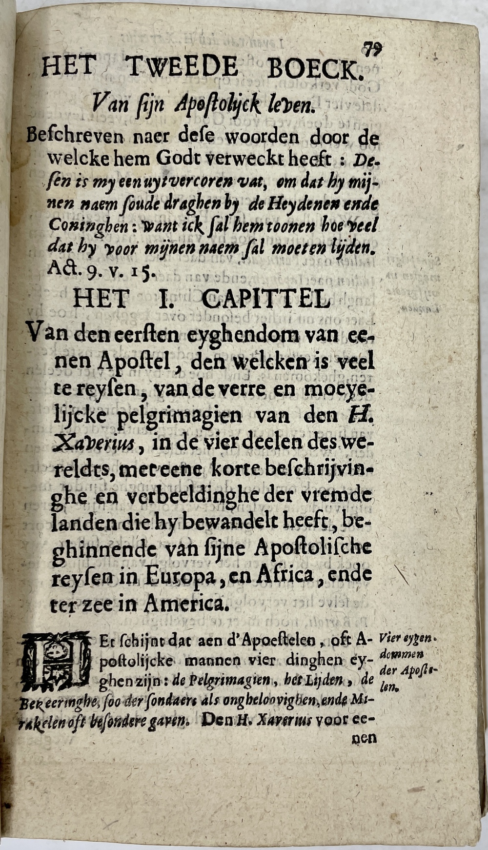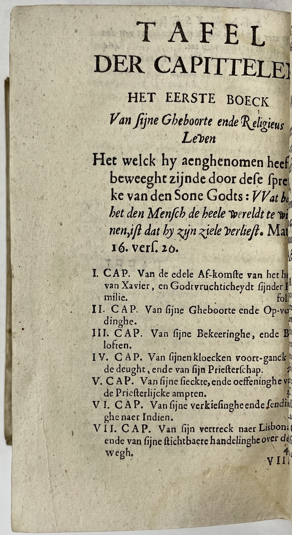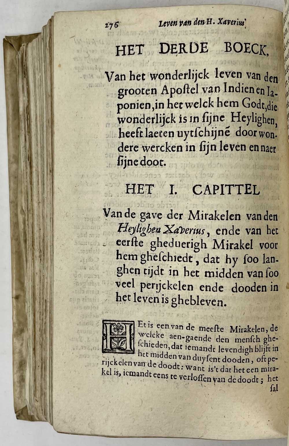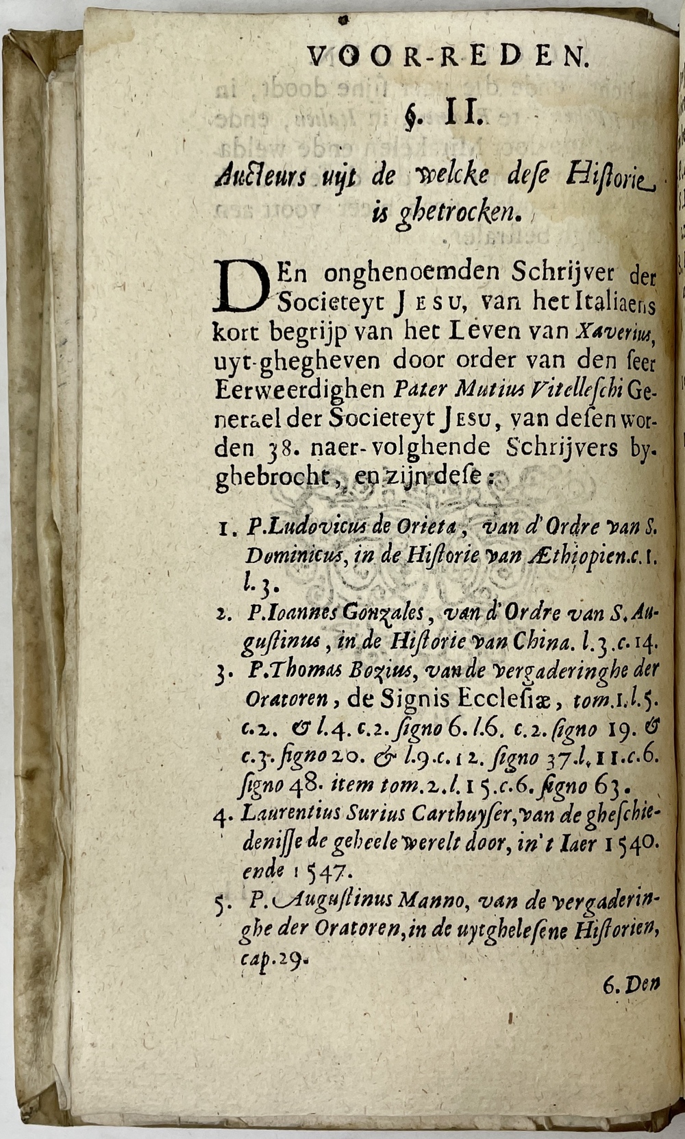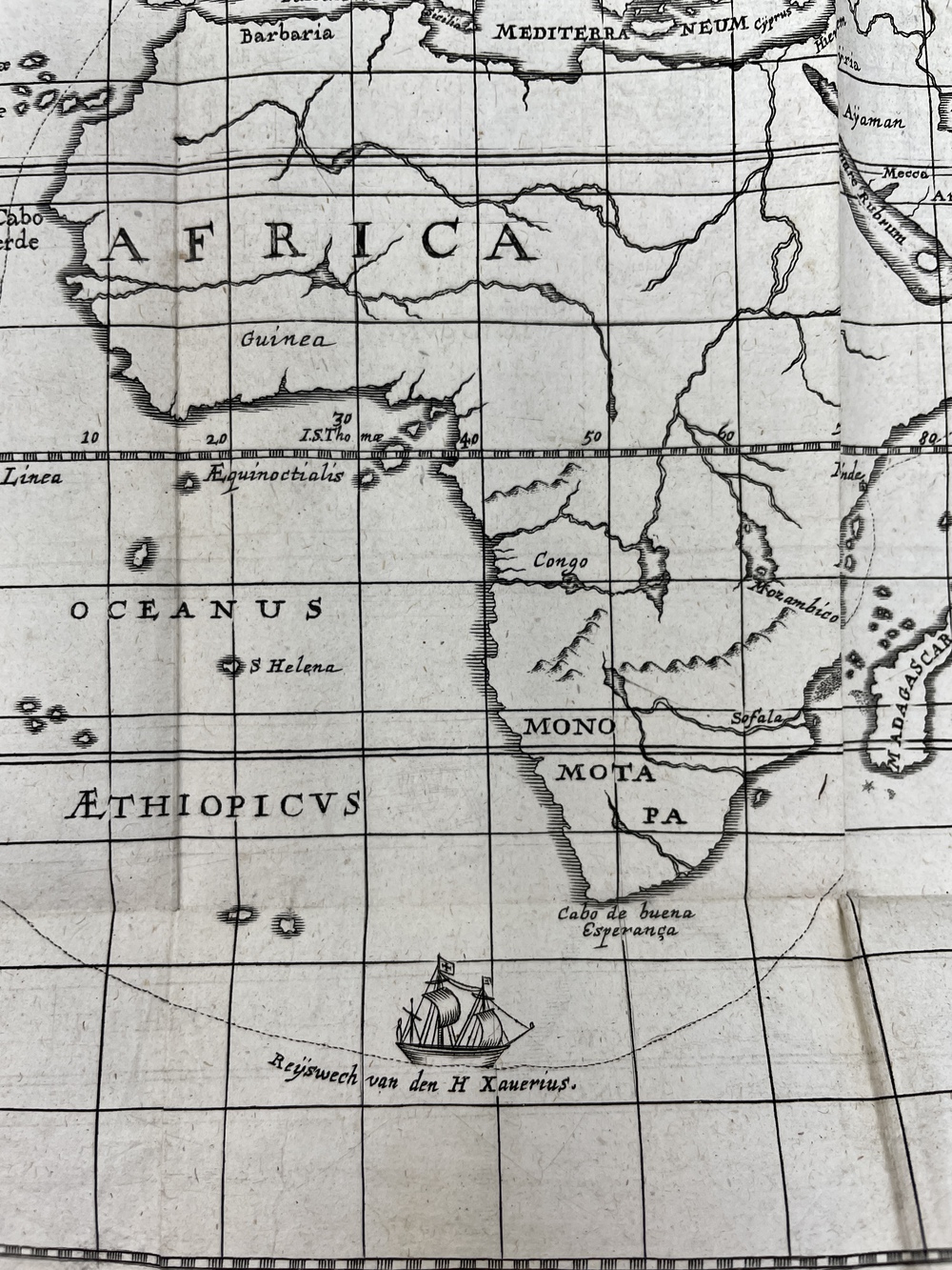 本書は全1,000ページを越える大部の著作で、ザビエルの生涯についての記述を中心に、彼にまつわるさまざまな事績、没後の影響といった後年の出来事も含めてあらゆるザビエルに関連する事象を網羅的に記した「ザビエル大全」ともいうべき作品です。ザビエル関連の著作としては珍しくオランダ語で書かれた作品で、1663年に低地地方におけるカソリック関係著作出版の中心地であったアントワープで刊行されています。オランダ語で書かれたザビエル伝としては最も充実した内容と分量を誇ると言ってよい本書には、日本についての記述を多数見ることができるだけでなく、折り込みの世界図と単独の日本図も収録されており、これらの地図は本書のために新たに作成されたもので本書は後年に再版されることがなかったため、本書でしか見ることができない大変貴重な図と言えることから、本書は日本関係欧文図書として大変重要な作品であると言えます。