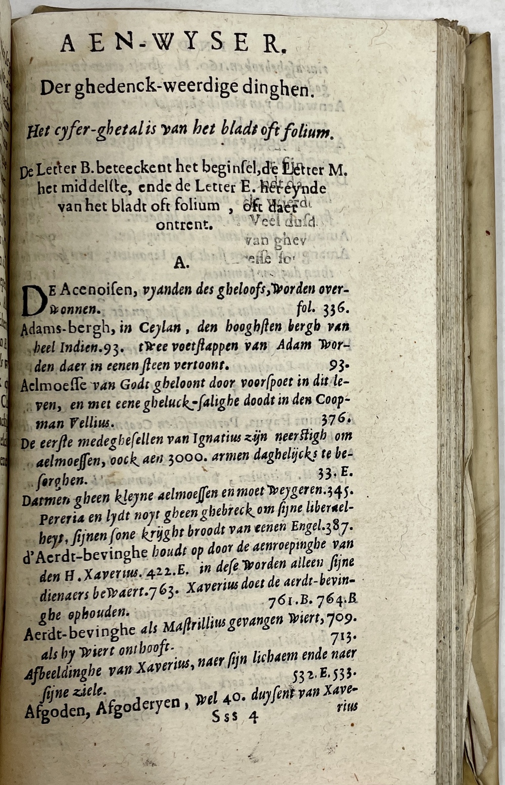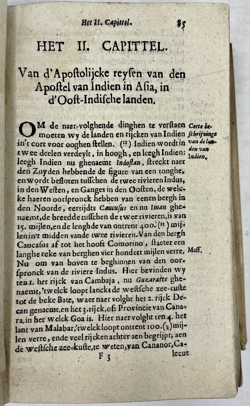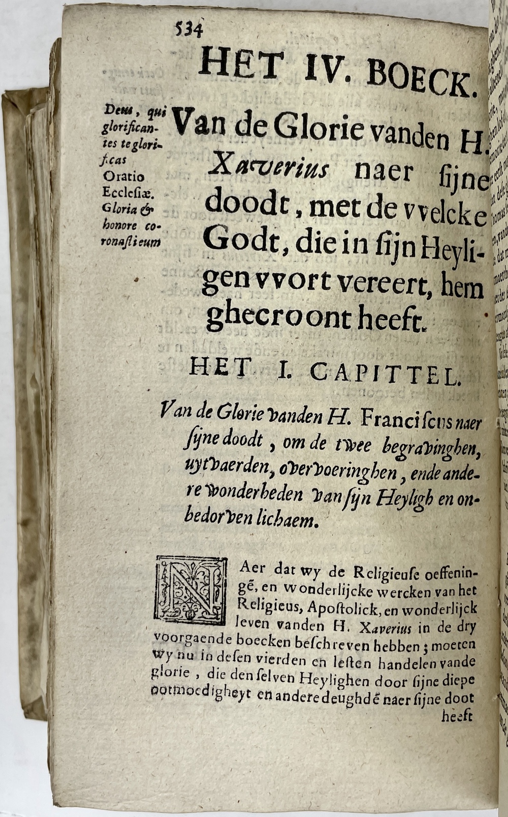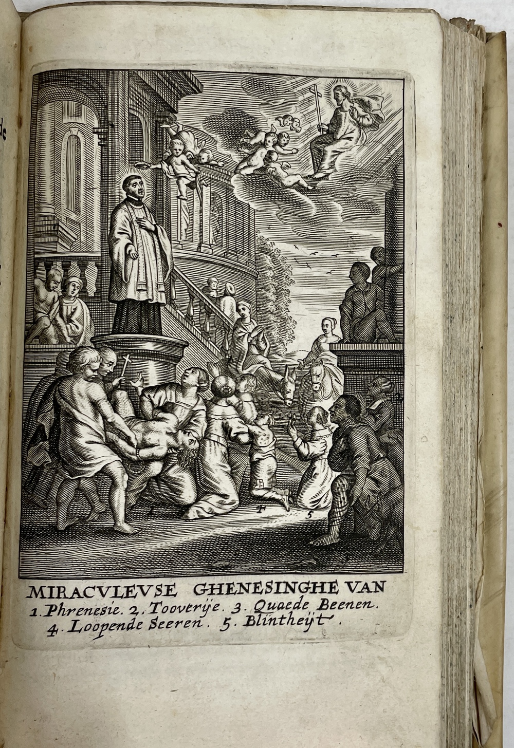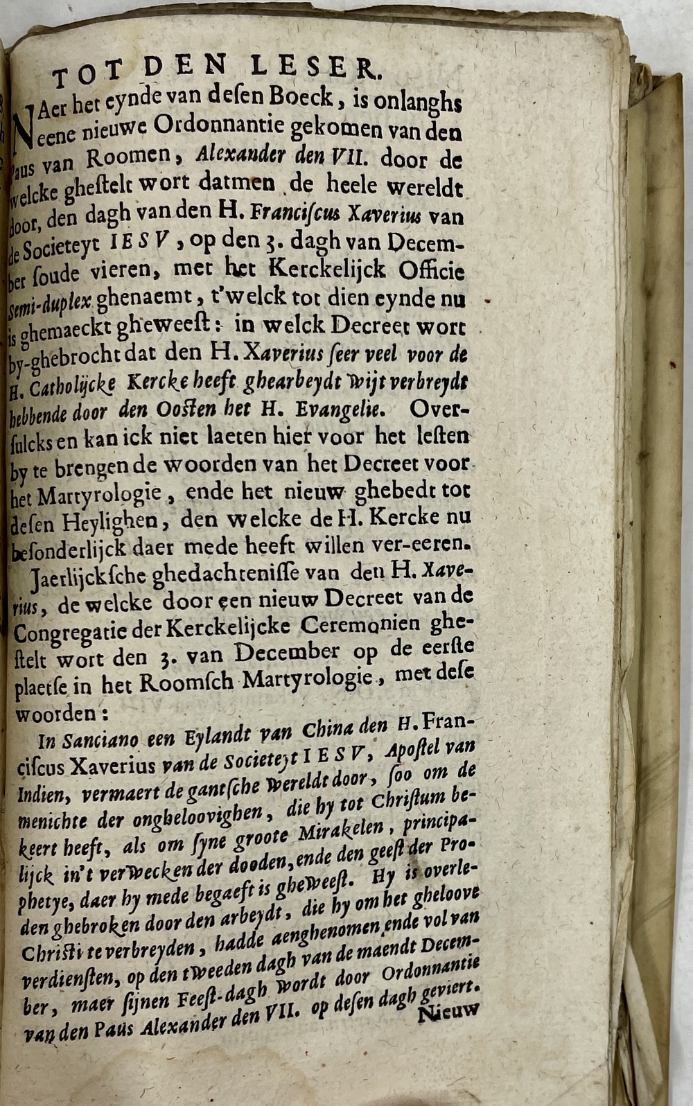 本書は全1,000ページを越える大部の著作で、ザビエルの生涯についての記述を中心に、彼にまつわるさまざまな事績、没後の影響といった後年の出来事も含めてあらゆるザビエルに関連する事象を網羅的に記した「ザビエル大全」ともいうべき作品です。ザビエル関連の著作としては珍しくオランダ語で書かれた作品で、1663年に低地地方におけるカソリック関係著作出版の中心地であったアントワープで刊行されています。オランダ語で書かれたザビエル伝としては最も充実した内容と分量を誇ると言ってよい本書には、日本についての記述を多数見ることができるだけでなく、折り込みの世界図と単独の日本図も収録されており、これらの地図は本書のために新たに作成されたもので本書は後年に再版されることがなかったため、本書でしか見ることができない大変貴重な図と言えることから、本書は日本関係欧文図書として大変重要な作品であると言えます。