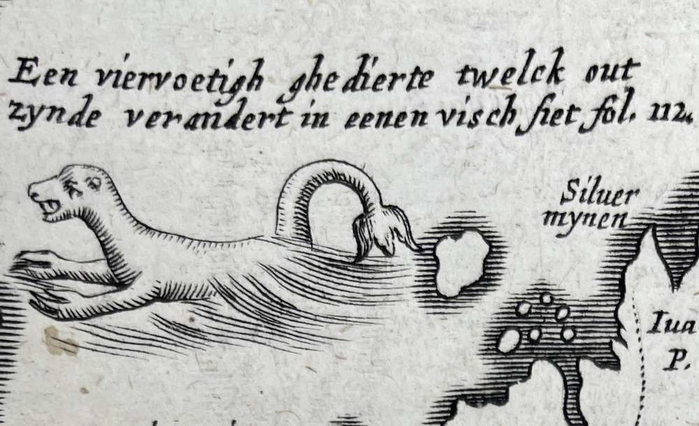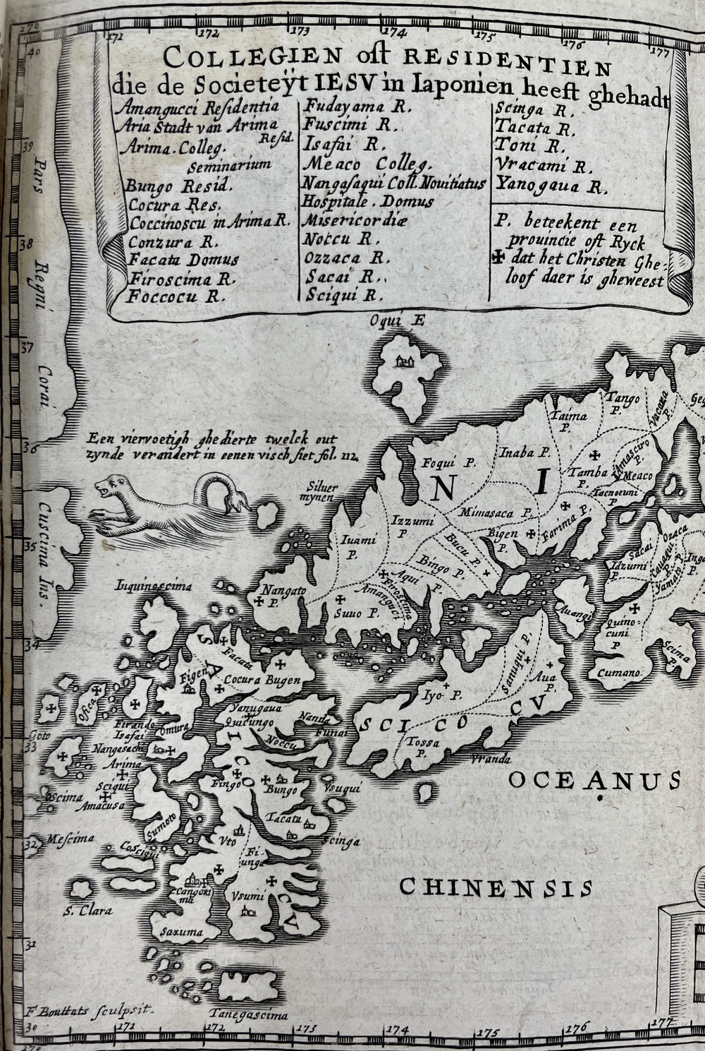 日本関係欧文図書として本書が重要なのは、本文中において、ザビエルの日本での布教活動や、彼に影響を受けて来日した宣教師の活動と関連して数多く日本について言及した記事が見られることに加えて、本書のために新たに制作された日本図、並びにアジア図が収録されている点にあります。本書に収録された日本図は、「日本への最初の使徒(ザビエル)の旅程に着目したはるか彼方の日本王国の最新地図(Nova Delineatio particularis Apostoricarum peregrinationum primi IAPONIÆ APOSTOLI in remotis Iaponiæ Regnis.以下同文のオランダ語訳も表記されている)」と題されたもので、日本国内の諸国を破線で区切って示しつつ、(かつて)教会施設が設けられていた地点を十字で描いた大変ユニークな日本図です。この図の原図となったのは、ジンナーロ(Bernardino Ginnaro, 1577 - 1644)の著作(Saverio Orientale ô vero Istorie de Cristiani Illustri dell’ Oriente. Napoli, 1641)に収録されていた日本図で、いわゆる「ブランクス / モレイラ」図の最初期の作例の一つに数えられている地図に基づいています。この日本図の上部には地図中に十字で描かれた国内の教会施設に付合する形で、各地の教会施設が設置されていた地名と施設についてまとめた一覧図を新たに設けており、往時のイエズス会の隆盛ぶりをより強調する地図となっています。また、九州の上部の海上には奇妙な犬のような怪獣が描かれていて、「魚へと姿を変える四つ足の動物」というオランダ語の説明文と「(詳細は)112ページ(を見よ)」と書かれています。この海獣はジンナーロの日本図にも描かれていたもので、実は山椒魚のことを描いたものです。山椒魚のことがヨーロッパに伝えられたのは、1566年10月20日付、志岐発のアルメイダ書簡のことで、アルメイダは五島を訪ねた際に見つけた奇妙な怪物のことを記しており、この「犬に似たれども手足短き一つの動物」は、年老いてから「漸次大きさ鰹のごとき魚に変ず」(村上直次郎訳 / 柳谷武夫編『イエズス会日本通信下巻(新異国叢書第2巻)』雄松堂書店、1969年、116ページ)と驚きと共に山椒魚のことを伝えています。本図に描かれた海獣を説明するテキストの指示通り本書の本文112ページを見てみますと、このアルメイダの報告に基づいて山椒魚のことが説明されていることを確認することができます。山椒魚は日本ではよく知られた生き物ですが、ヨーロッパには生息しておらず、アルメイダや当時のヨーロッパの人々にとってこの生き物は、魚と陸棲四足動物とが組み合わさったような全くもって奇怪な生き物として注目を集めたようです。