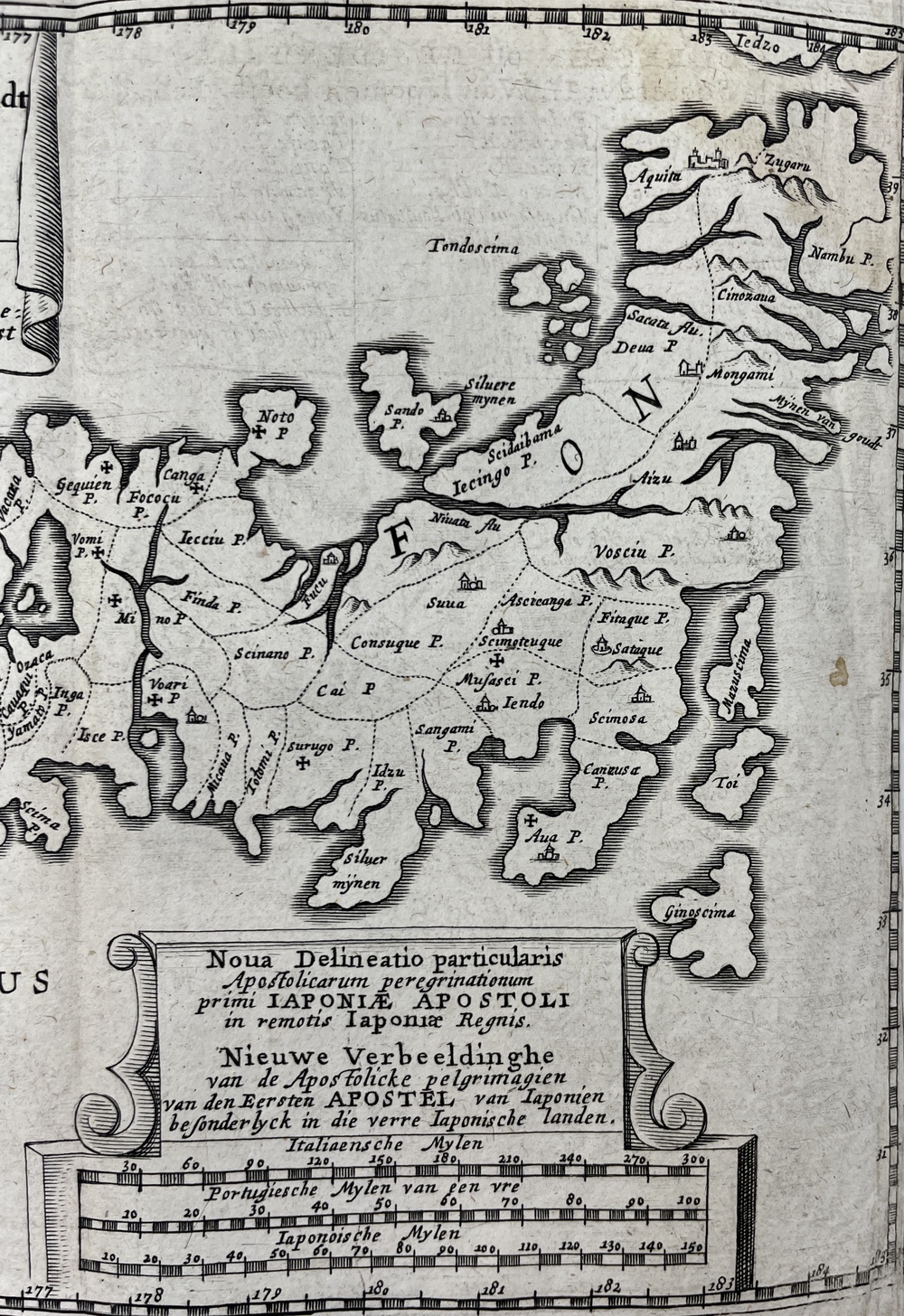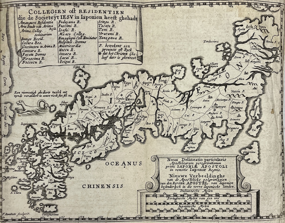本書はこのように充実しな日本関係記事と本書でしか見ることができない貴重な日本図や図版が収録されていることから、日本関係欧文図書として大変重要な作品であると考えられますが、イエズス会関係著作としては数少ないオランダ語で記されていることや、後年に再版されることもなかったためか、現存するものは極めて少ないようです。また数少ない現存本の中でも、地図や図版の収録位置や内容には相違があるようで、計7枚の地図と図版(さらに1枚のタイトルページ)を備えた本書は、現存本の中でも相対的に収録図版・地図が豊富であると言えることから、大変貴重な1冊であると考えられます。