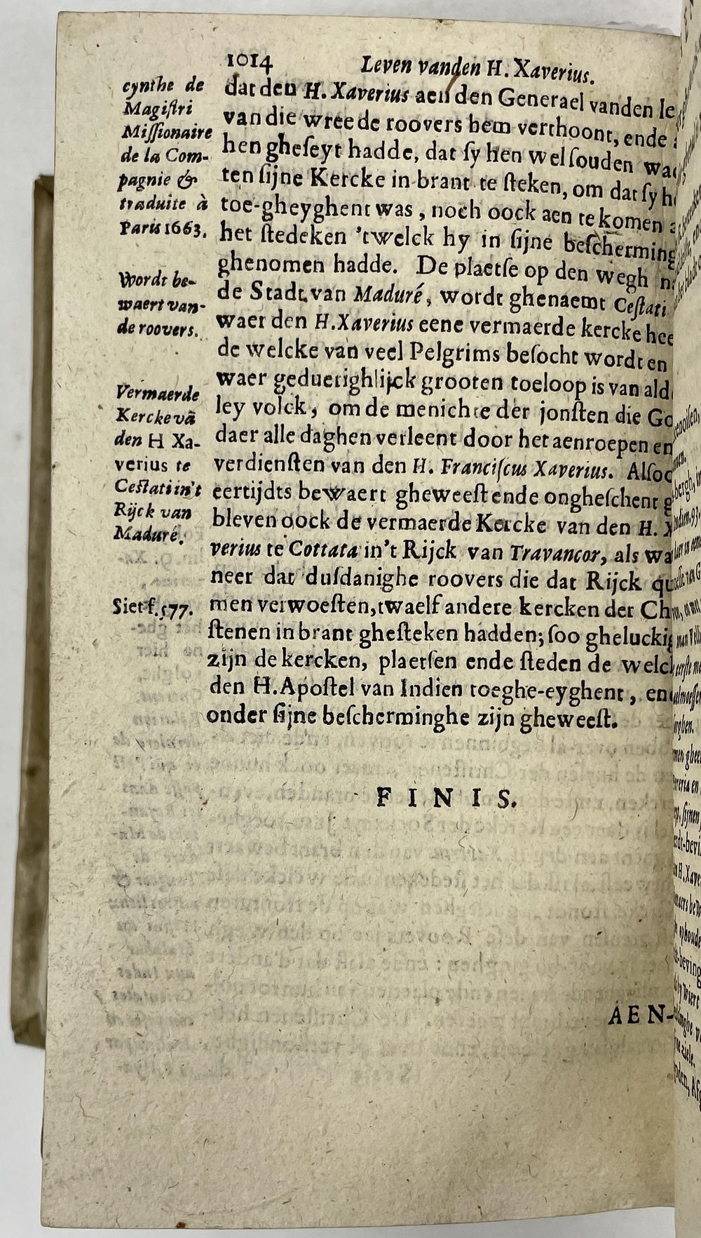本書の著者テーヌPhillipe François Taisne, 1627 - 1691)の詳細な経歴は定かではありませんが、ブリュッセル出身で人文学の教師を務めたり、従軍神父として活動していたことが知られているほか、本書をはじめとしたイエズス会関係者の伝記や神学関連のオランダ語著作を多数遺しています。本書中にはそのような記載はありませんが、Sommervogelによりますと、本書は1660年に刊行されたザビエルのオランダ語伝記(Kort verhael van het leven van den H. Franciscus Xaverius, Grooten Apostel van Indien ende Japonien,...Brussel, 1660.)の増補改訂版にあたるもので、さらに元々は1622年にボローニャで刊行されたイタリア語のザビエルの伝記(Francesco Scorzia. Ristretto della santa dell’Apostolo dell’Indie S. Francesco Xaverio della Compagnia di Giesù. Bologna, [1622].)を底本とした翻訳著作であるとのことです。ただし、このイタリア語のザビエル伝が176ページの著作であることに鑑みれば、本書はほとんどテーヌによって書き改めた独立した著作としてみなすべき作品ではないかと思われます。