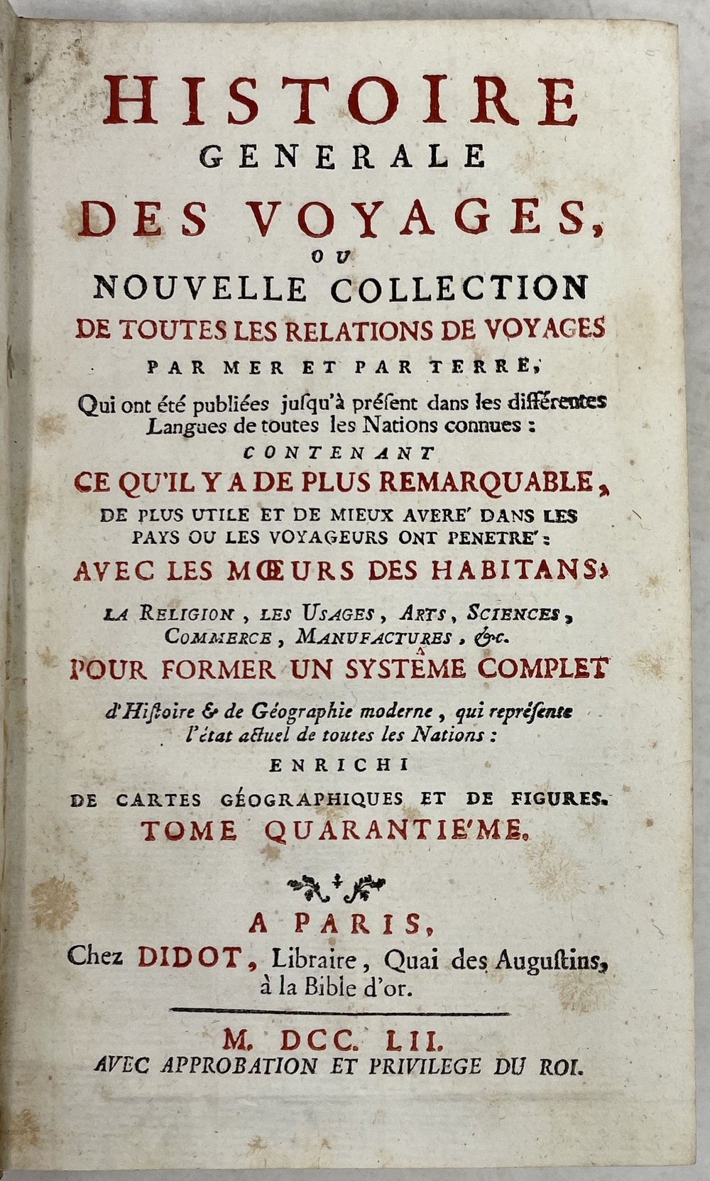 HISTOIRE GENERALE DES VOYAGES, OU NOUVELLE COLLECTION DE TOUTES LES RELATIONS DE VOYAGES PAR MER ET PAR TERRE,…TOME QUARANTIE’ME.