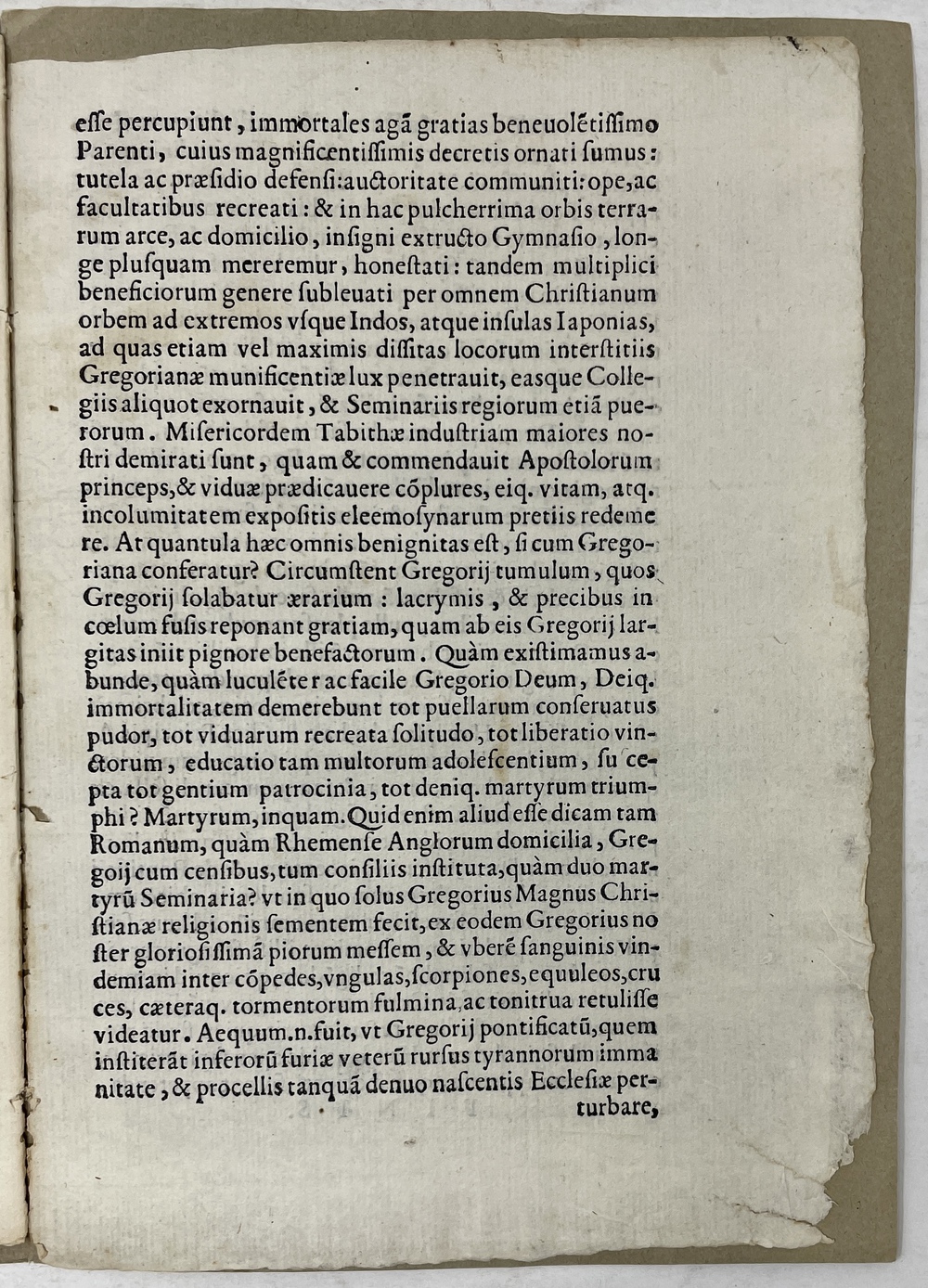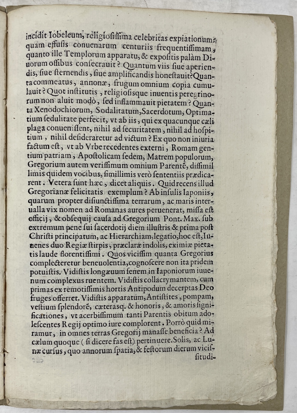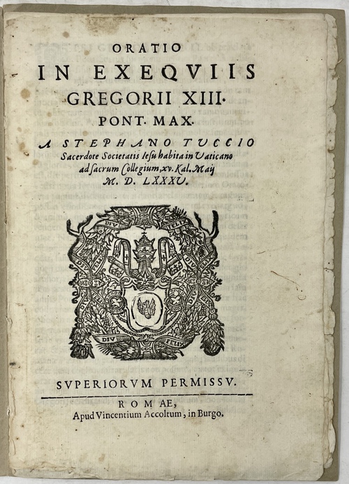 本書は、天正遣欧使節が謁見を果たした直後に崩御したグレゴリオ13世に対して捧げられた在位中の事績を讃える祈祷文です。教皇がなし得た多くの事績の中にアジア宣教の支援と日本の使節来訪についても触れられています。本書が読み上げられたのは教皇が崩御したのちの5月15日付となっており、この時天正遣欧使節の一行はまだローマに滞在していましたので、あるいはこの祈祷文を目にする(耳にする)機会があったかもしれません。本書はおそらく同年中に刊行されたものと思われるもので、タイトルページには教皇の出身家であるブオンコンパーニ家の紋章で(邪悪の象徴である)尾を切られた竜が、教皇を意味する三重冠の下に描かれています。 グレゴリオ13世は、イタリアのボローニャ出身で同地の大学で法学の教鞭を執っていましたが、その優秀さが認められローマに招聘されました。得意とする教会法に関する実務をこなしながら枢機卿に選出され、カソリックの対抗宗教改革の基本方針を定めたトリエント公会議(1563年)にも出席しています。1572年に新教皇となり、グレゴリオ13世を名乗り、以降様々な教会改革を実行していきました。トリエント公会議の決議事項を基本方針とし、禁書目録の作成や、不在司教問題の改善策、教会法の整理、改訂、編纂を行い、中でも現在なお世界中で用いられている「グレゴリオ暦」の採用は、グレゴリオ13世による施策として最もよく知られているものでしょう。また、学問活動にも深い関心を寄せ、ヨーロッパ各地の神学校の整備にも尽力しています。 日本との関係でグレゴリオ13世が最も強く記憶されている出来事は、天正遣欧使節がローマを訪ねる最大の目的の一つであった教皇との謁見が行われたことでしょう。グレゴリオ13世はイエズス会の世界各地への宣教活動を積極的に支援し、彼らの東西インドにおける宣教活動権の承認や、日本において各種神学校を維持、設立するための資金提供、そして最晩年の1585年には日本における宣教活動の独占権をイエズス会に付与しています。天正遣欧使節の4人は、有馬のセミナリオで教育を受けていたこともあり、1585年3月に行われた使節との謁見では、当時の西欧諸国における大使級の待遇でもって行われました。この出来事は、当時のヨーロッパでも一大センセーションを巻き起こし、その様子を伝える書物が70以上も出現したと言われています。謁見の直後に教皇が崩御したこともあり、天正遣欧使節とグレゴリオ13世との謁見は、教皇治世最後のハイライトとしても深く記憶されることになりました。 本書の著者であるトゥッチ(Stephano or Etienne Tucci, 1540 - 1597)は、1540年 スペイン北部モンフォルテ出身の神学者で、イタリアシチリア島北部の街メッシーナに学んだあと、同地で修辞学を教えるようになり、パドヴァ、ローマで神学教授として教鞭をとりました。彼によるグレゴリオ13世に対する弔辞祈祷は、同種の代表的なものとして1585年にローマで複数刊行されただけでなく、パドヴァでも刊行され、また後年になっても繰り返し各種の文献に転載されたようです。いずれの版出会っても小著であるがゆえに現存数は決して多くないものと思われ、その点でも貴重な資料と言えそうです。本文わずか10ページほどの小著ですが、グレゴリオ13世崩御直後の事績に対する評価を理解する上で、天正遣欧使節と関連の極めて深い教皇の伝記的資料として利用できるものと思われます。 「グレゴリウス13世は、本名ウーゴ・ブオンコンパーニ。ボローニャ生まれのウーゴは、その地にあるヨーロッパ最古の大学で法学を修めた。早く教皇庁に招かれて、教会法に関わる業務に従事する。歴代の強行によって重用され、折から開催されたトリエント公会議にも参画。ヴァチカン官僚として辣腕をふるった。宗教上の達人というよりは、カトリック教会の制度的管理者の趣がまさるのは、危機の時代のあきらかな兆候である。1572年5月、先任の教皇ピウス5世の死去をうけて、教皇に選出される。ただちにとりくんだのは、トリエント公会議の決定を現実に移すことだった。聖職者たちの倫理と義務の正常化をもとめ、厳格な粛清を断行。会議の決議にもとづいて、教義に反する書籍の排除をめざし、禁書目録の制定を督促する。のちの批判もかまびすしい禁書目録はこうして誕生した。 あいついで取り組む改革のうちでも、とびきり重要な課題があった。長らくにわたってキリスト教会を悩ませてきた暦制度の精査である。すでにその時点で10日ほども天体運行の現実との誤差を生じていた暦の再検討を命じる。当時の最高の天文学者であったイエズス会修道士クリストフ・クラヴィウスほかを委員に任じて、解決法を模索した。 暦の変更というとてつもない措置は、教皇の権威を背景としないかぎり不可能であろう。さらに深まる混乱を防止すべく、教皇は決断をくだした。1572年10月5日を、同月15日に置き換え、また閏年の設定法にも微調整