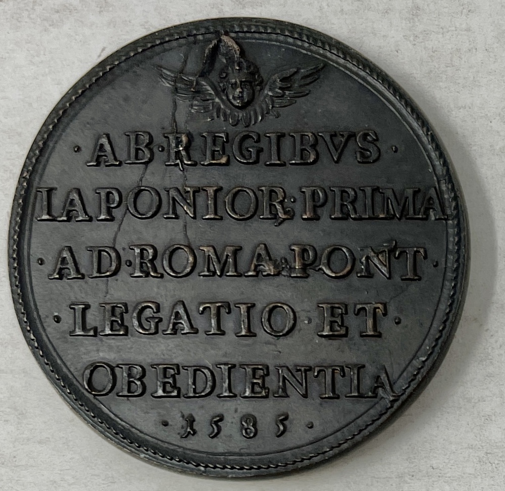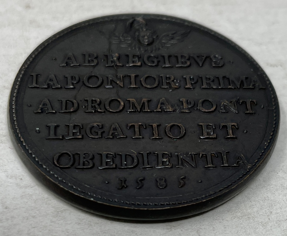 このメダルの表面には左を向いた教皇グレゴリオ13世の胸像が描かれています。裏面には、使節を記念したラテン語の文言が記されており、「日本の国々から教皇の座すローマへの初の使節団と恭順[が示された]1585年」(AB REGIBVS IAPONIOR PRIMA AD ROMA PONT LEGATIO ET OBEDIENTIA 1585) とあるのが確認できます。当時のローマでは、こうした教皇を記念するメダルを鋳造するのは、特別な勅許を得た職人だけに許されており、このメダルはロレンツォ・フラーニ(Lorenzo Fragni, 1548 - 1619)によって作成されたものです。
