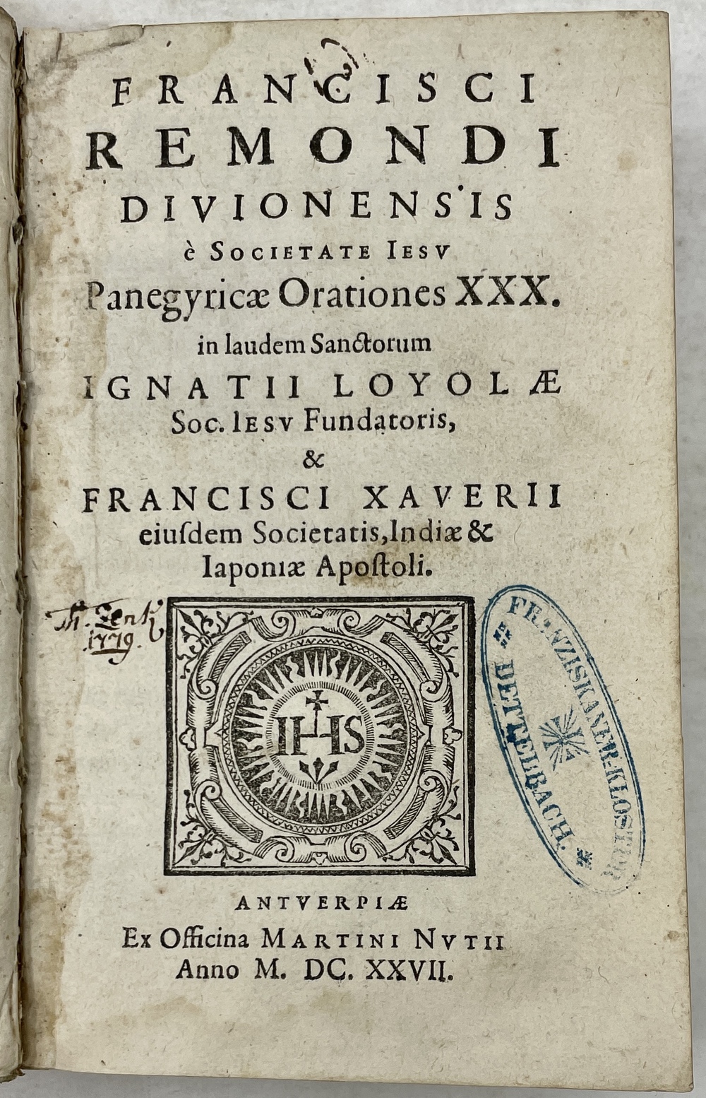 FRANCISCI REMONDI DIVIONENSIS è SOCIETATE IESV Panegyricæ Orationes XXX. IGNATII LOYOLÆ Soc. IESV Fundatoris, & FRANCISCI XAVERII eiusdem Societatis, Indiæ & Iaponiæ Apostoli.
