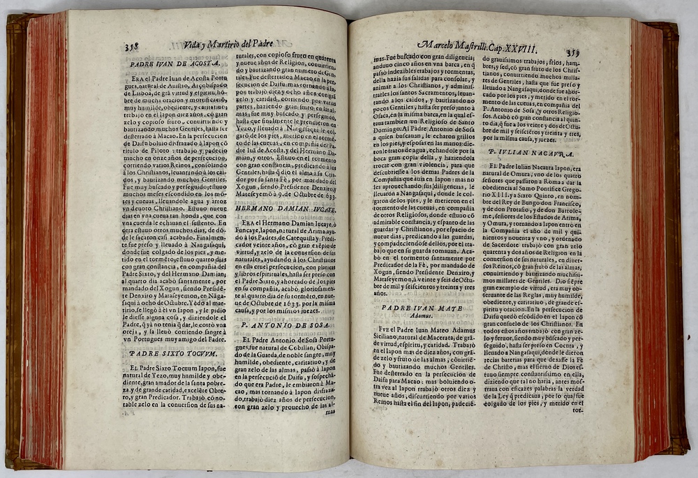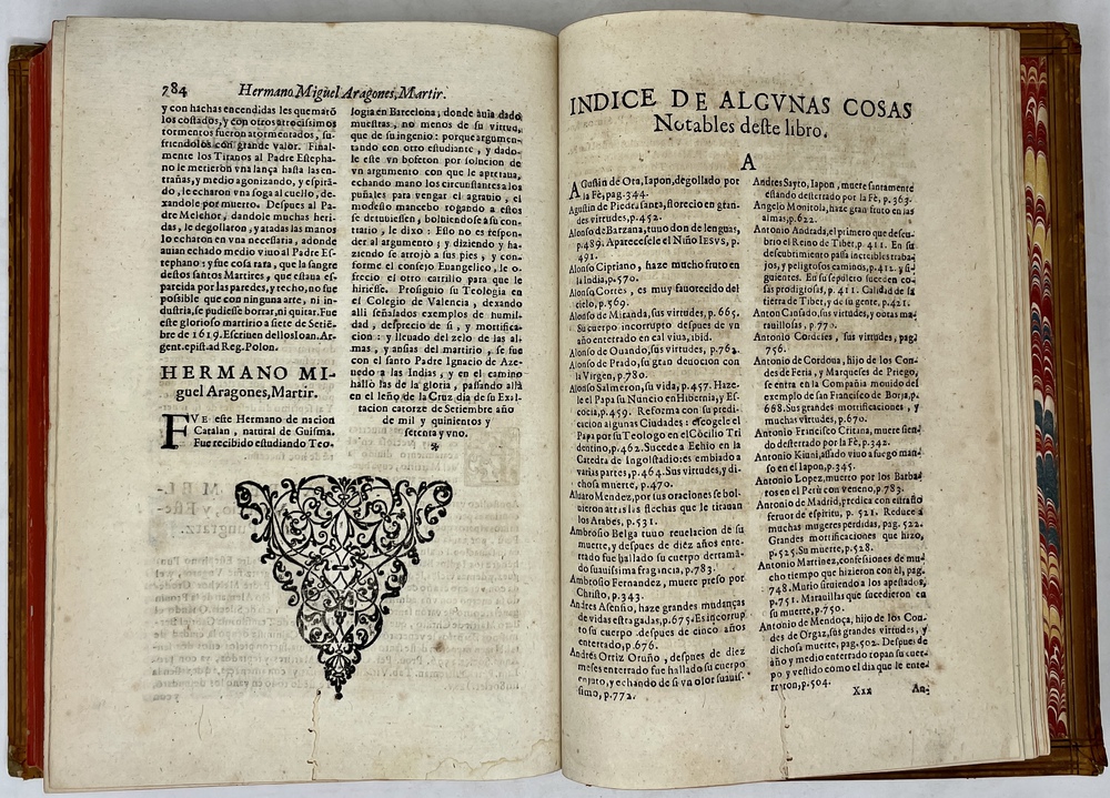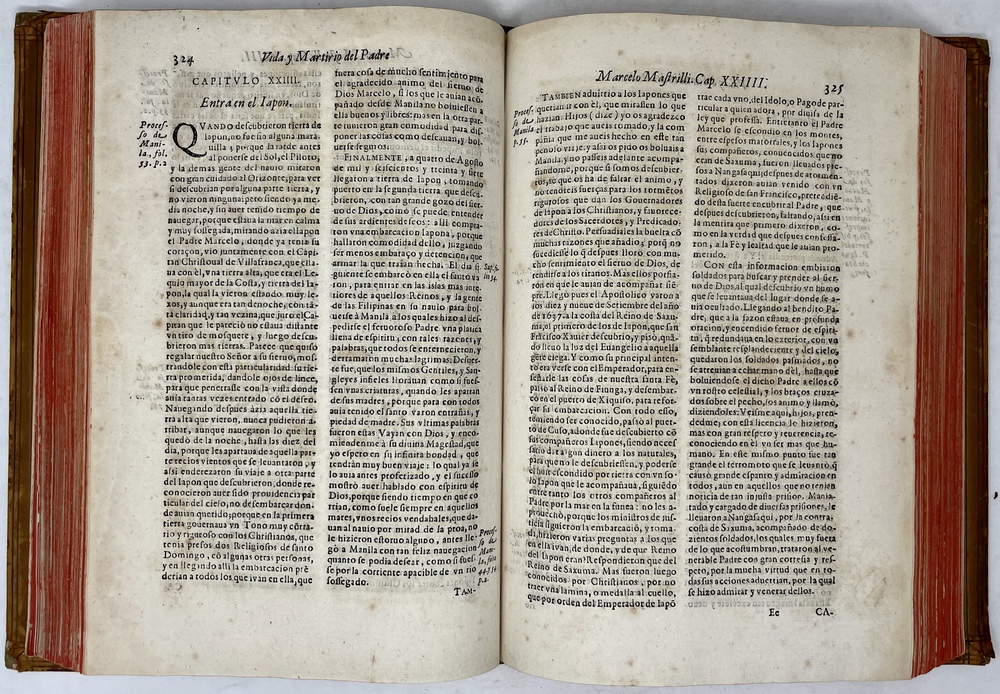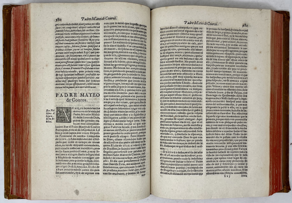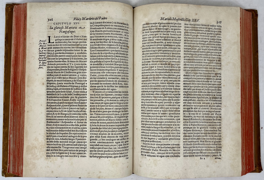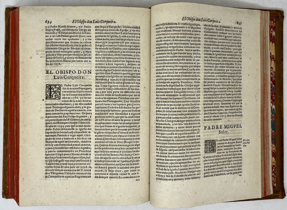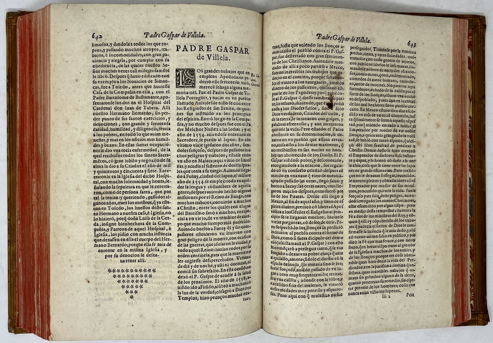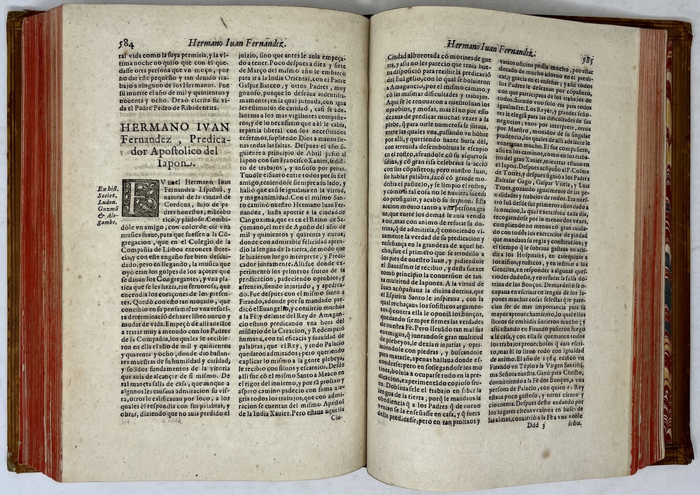装丁のヒンジ部分に補修(それほど秀逸でない)跡あるが、本体の状態は概ね良好な状態。小口は三方とも朱染。見返しに旧蔵者の蔵書票あり。 [Laures: 1645-1-438-297] [Sommervogel, Vol. V: 1746] [Roldán-Figueroa (2021): 278]