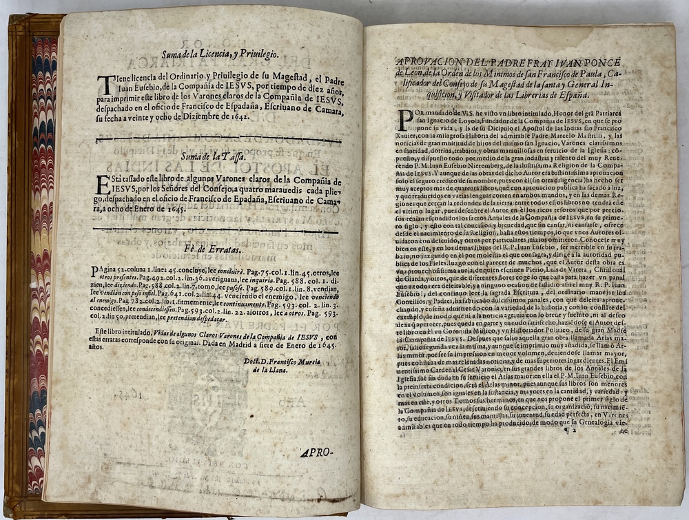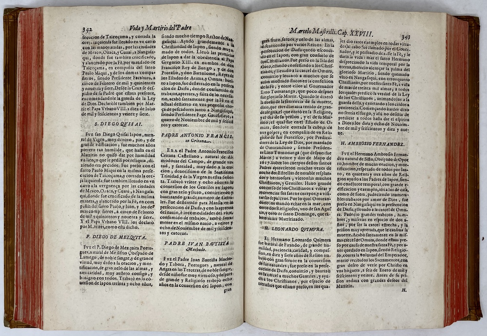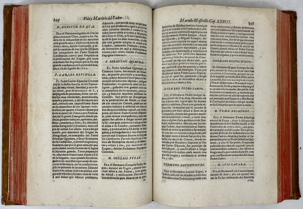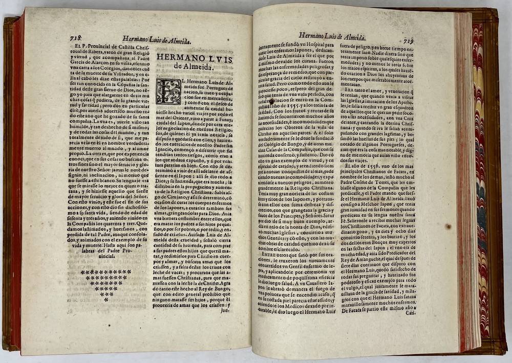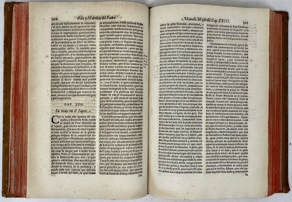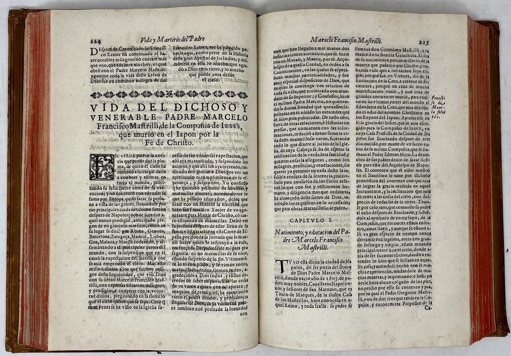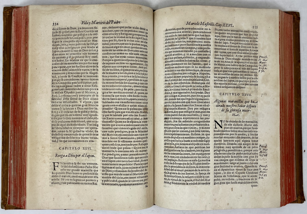 装丁のヒンジ部分に補修(それほど秀逸でない)跡あるが、本体の状態は概ね良好な状態。小口は三方とも朱染。見返しに旧蔵者の蔵書票あり。 [Laures: 1645-1-438-297] [Sommervogel, Vol. V: 1746] [Roldán-Figueroa (2021): 278]