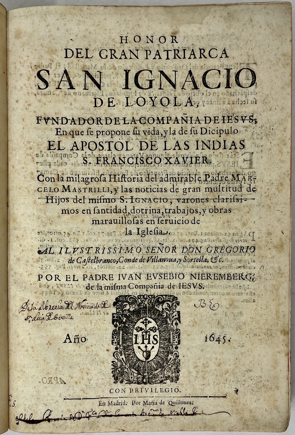 HONOR DEL GRAN PATRIARCA SAN IGNACIO DE LOYOLA, FVNDADORDELA COMPAÑÍA DE IESVS, En que se propone su vida, y la de su Dicipulo EL APOSTOL DE LAS INDIAS S. FRANCISCO XAVIER. Con la milagrosa Historia del admirable Padre MARCEL MASTRILLI, ...