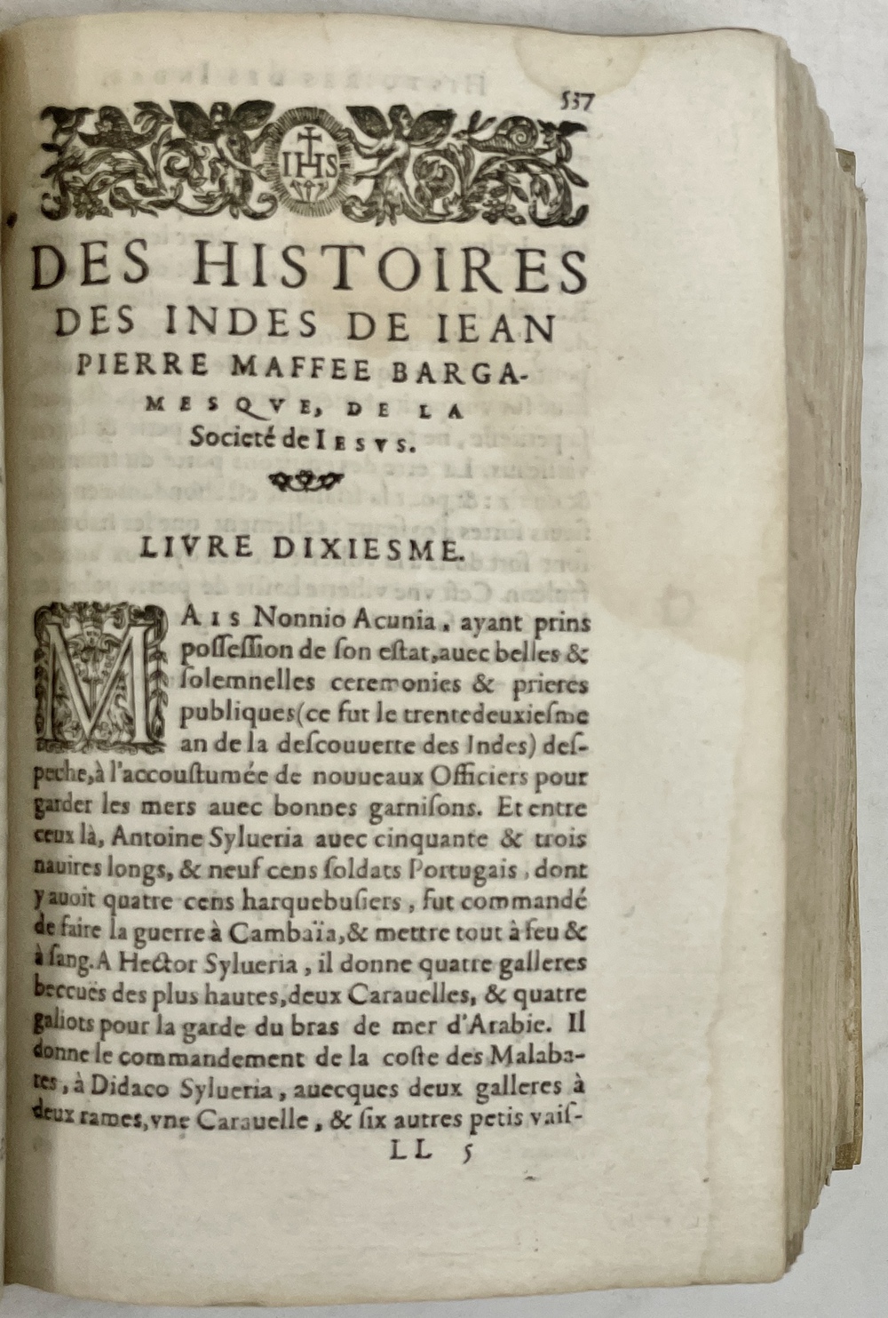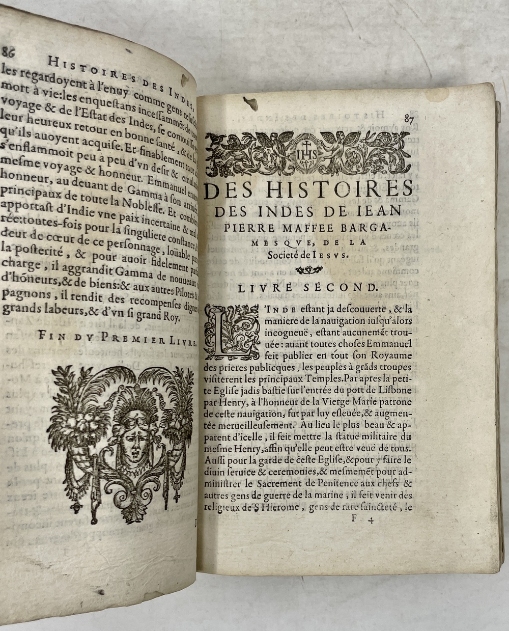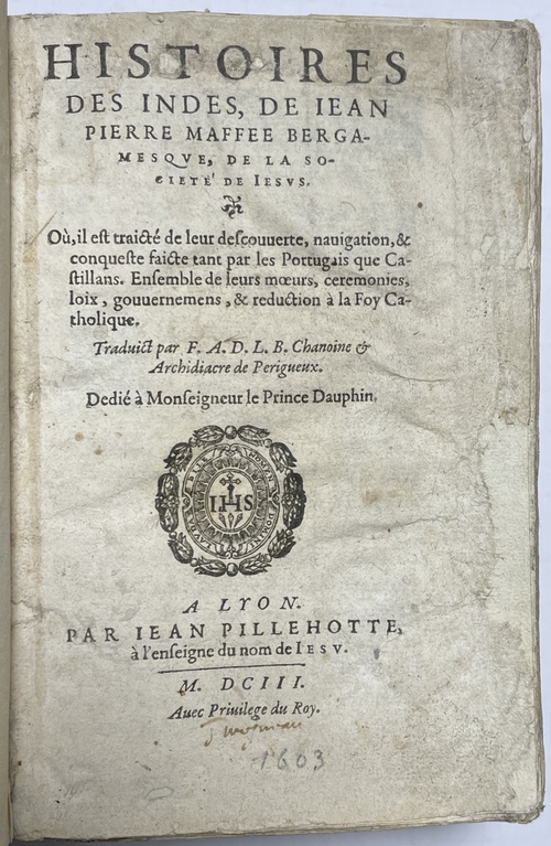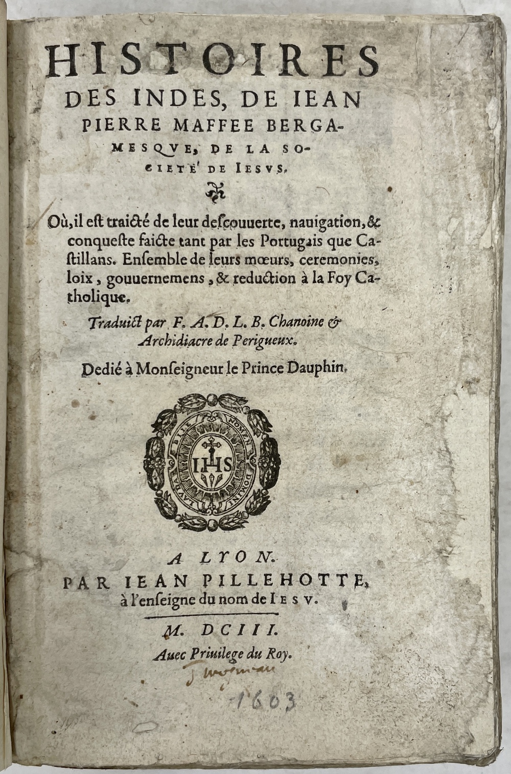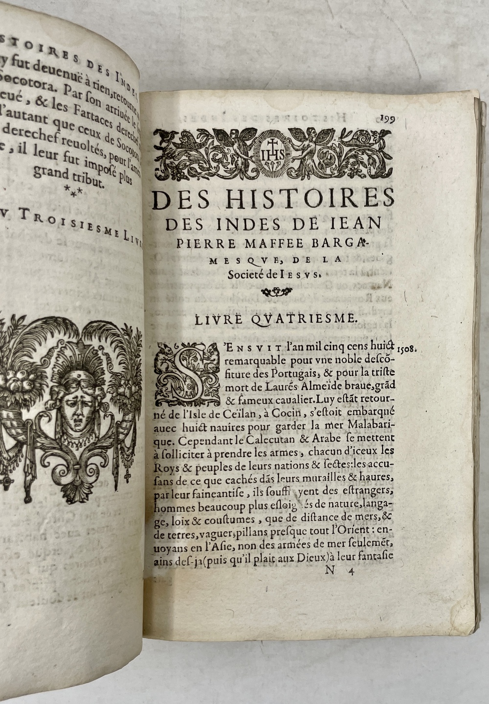 HISTOIRES DES INDES,DE IEAN PIERRE MAFFEE BERGAMESQVE,... Où est traicté de leur descouuerte, nauigation, & conqueste faicte tant par les Portugais que Castillans. Ensemble de leurs mœurs, ceremonies, loix, gouuernemens, & reduction à la Foy Catholique.
