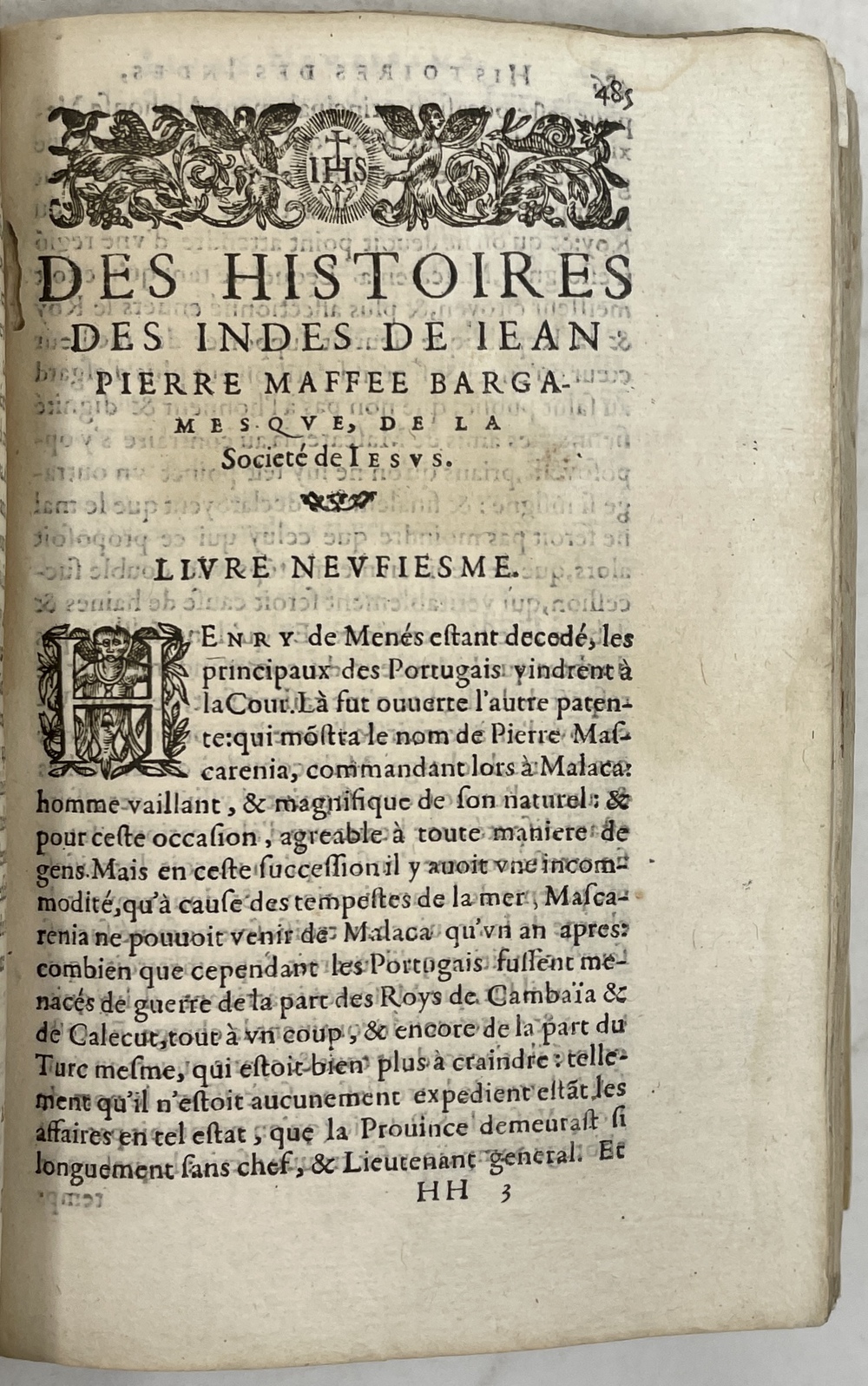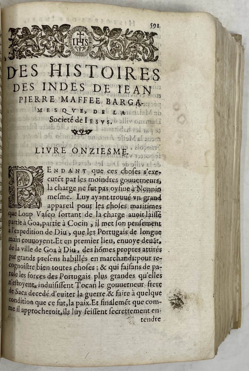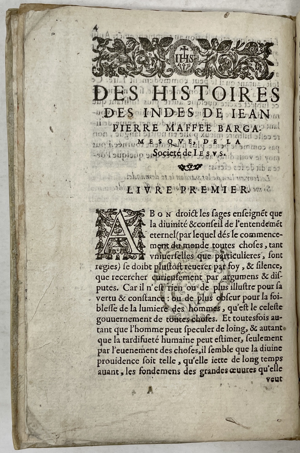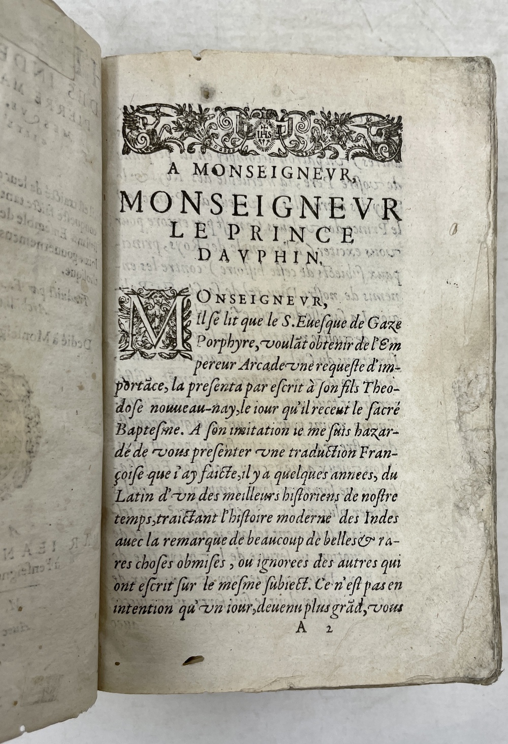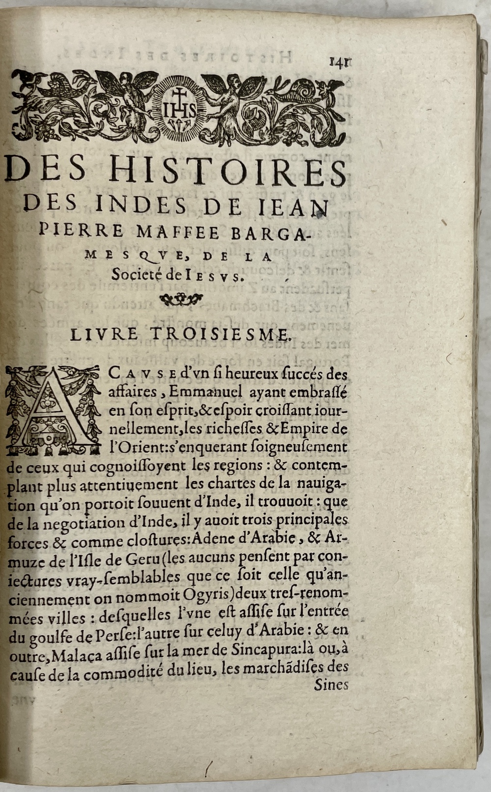 HISTOIRES DES INDES,DE IEAN PIERRE MAFFEE BERGAMESQVE,... Où est traicté de leur descouuerte, nauigation, & conqueste faicte tant par les Portugais que Castillans. Ensemble de leurs mœurs, ceremonies, loix, gouuernemens, & reduction à la Foy Catholique.