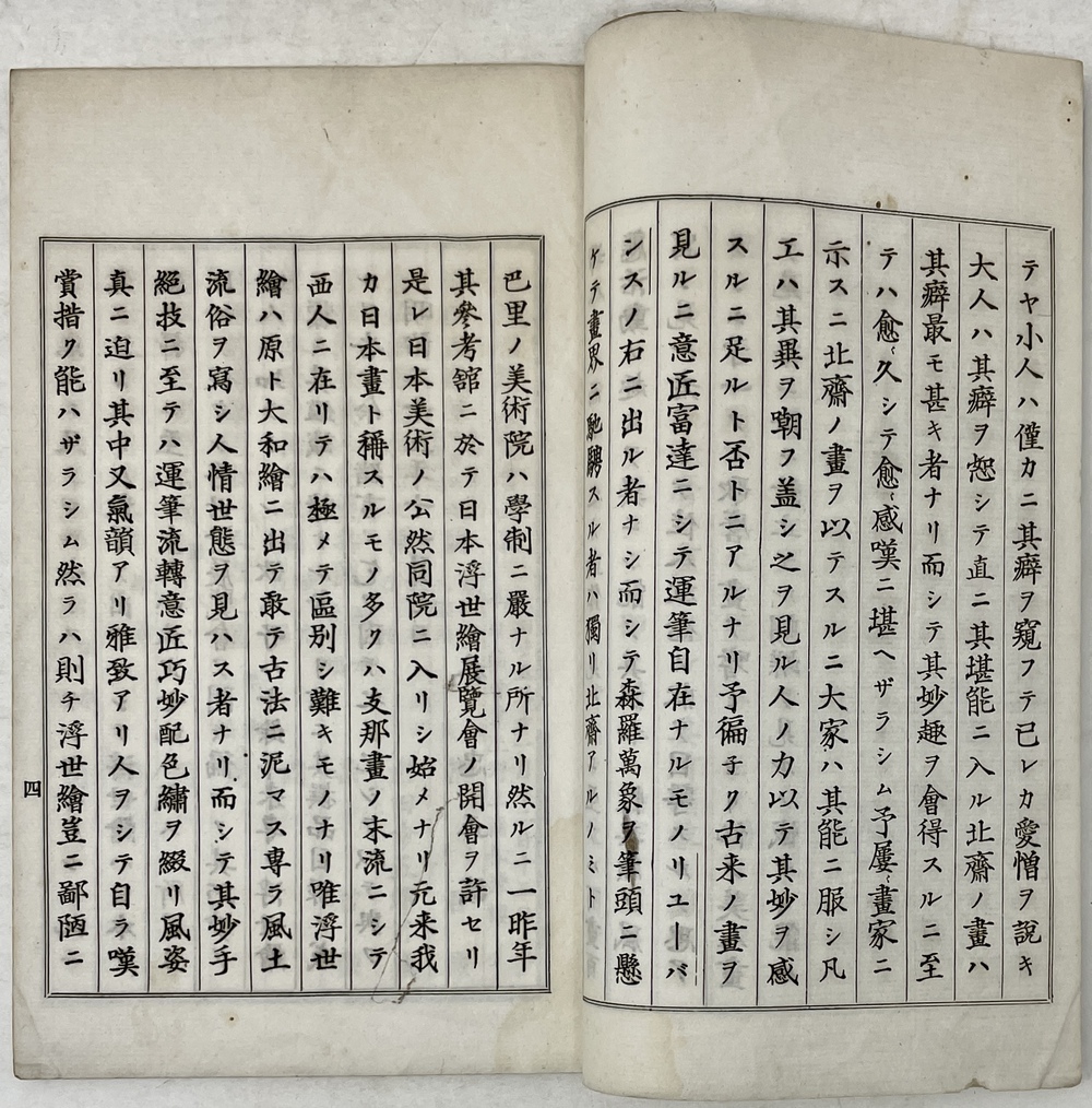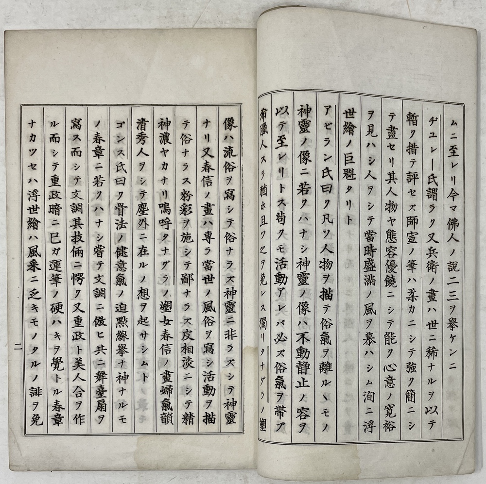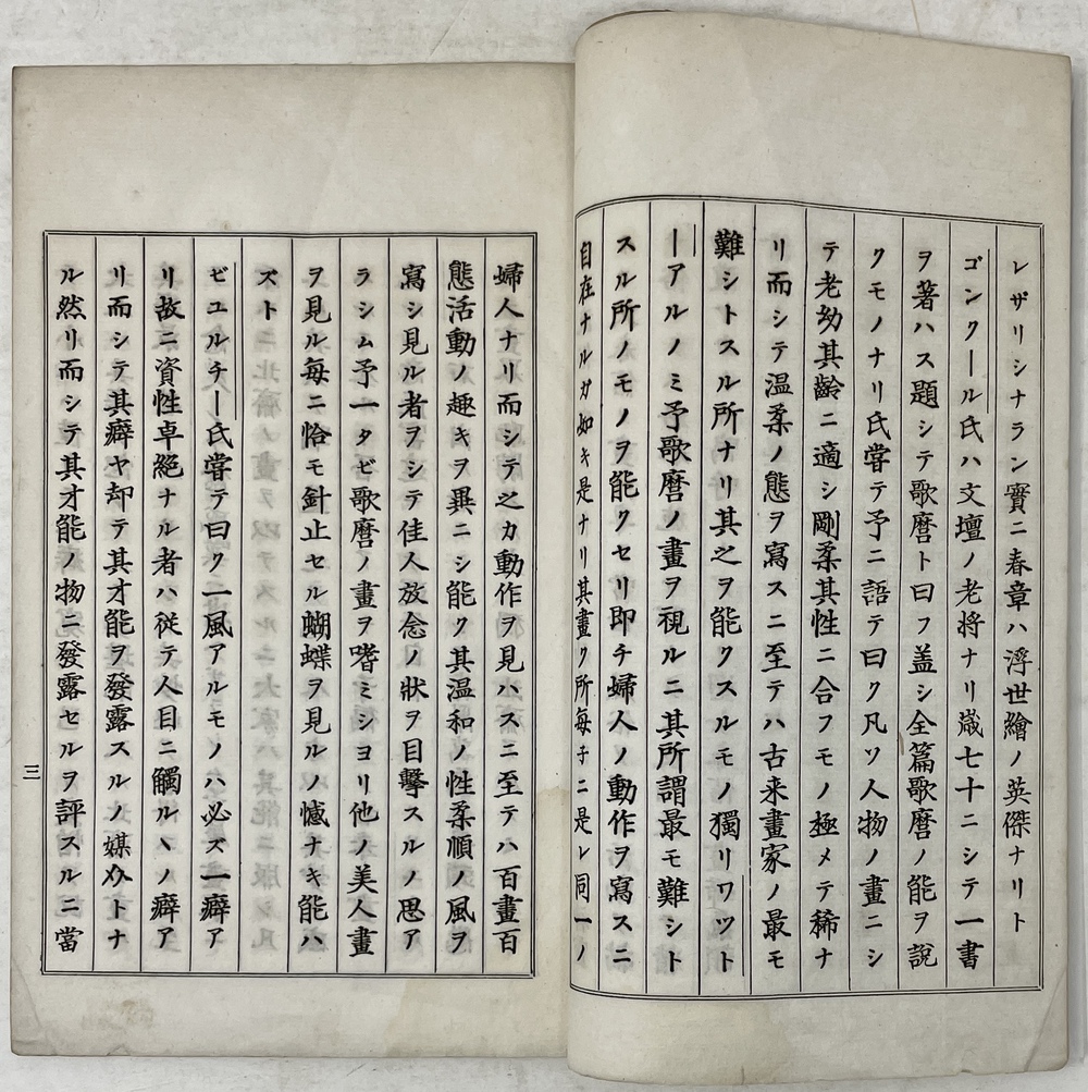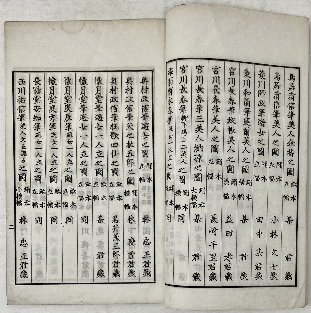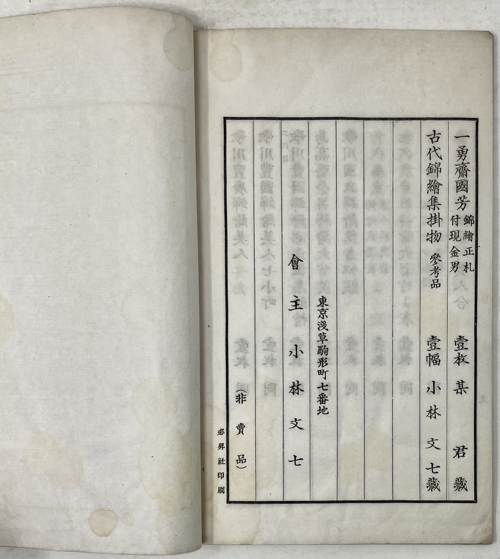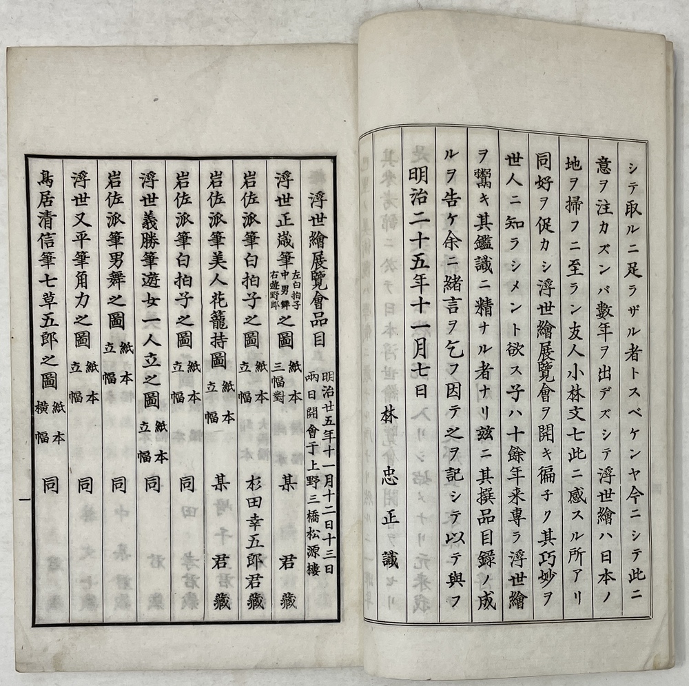 「東京での「浮世絵展」 明治25(1892)年、5月から帰国していた林は、9月に関西へ作品を求めに行った。同行したのは浮世絵の蒐集に協力している古本商の小林文七である。両家の子息であった文七は商売のことが判らず、山中商会の番頭が、文七のもとに送られて来て面倒を見ていた。林と山中の関係は、ここからも繋がりが生まれていたのであろう。文七はのちに、林が博覧会事務官長に就任のため美術商の仕事を離れたので、フェノロサの協力者となったが、彼自身も浮世絵の大収集家となった。 11月、小林文七は日本最初の「浮世絵展」を開催した。旅行中、2人は浮世絵の入手がもはや困難な現実に反して、日本人の浮世絵への蔑視、無視を嘆かずにはいられなかったのである。林はその「目録」に序文を書き、「フランスではいかに浮世絵が尊重され、その芸術性を高く評価しているか」を、ゴンクールやデュレ、アヴィランなどの著名な愛好家の名を挙げて説明し、「フランスを代表する国立美術学校で展覧会まで開かれている」事実に、「今、浮世絵の高い芸術性に目覚めなければ数年のうちに浮世絵は日本から失われるであろう」と警告している。」 (木々康子『林忠正:浮世絵を越えて日本美術のすべてを』ミネルヴァ書房、2009年、148-9ページより)