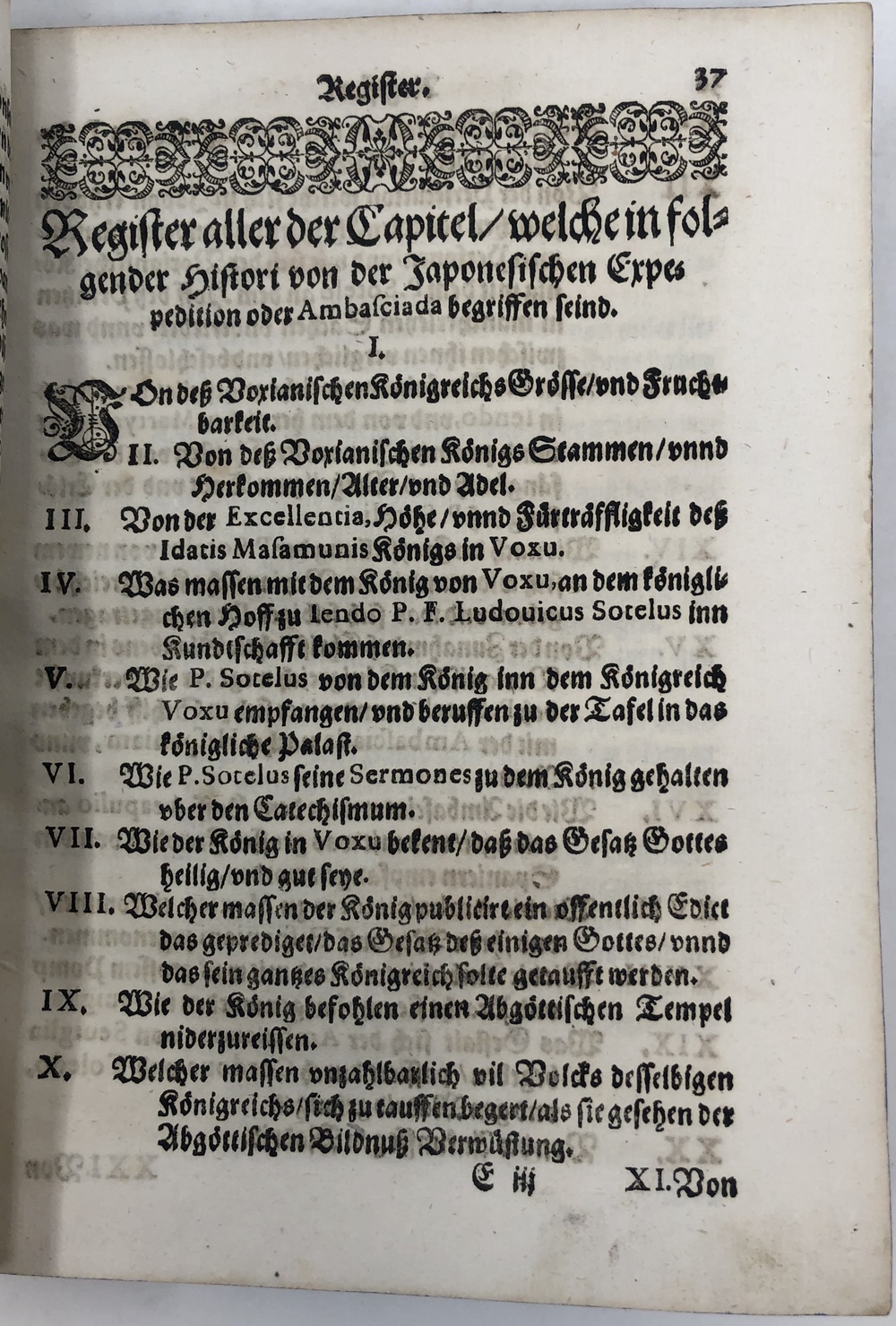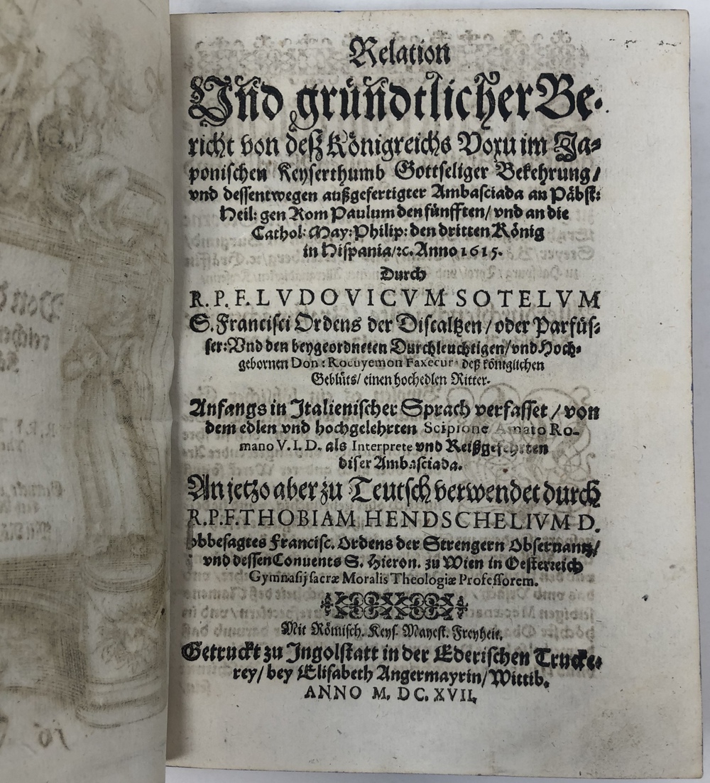 Relation Und gründtlicher Bericht von deß Königreichs Voxu im Japonischen Keyserthumb Gottseliger Bekehrung / und dessentwegen außgesertigter Ambasciada an Päbst: Heil: gen Rom Paulum den fünfften/ und an die Cathol: May: Philip:den dritten Köning...