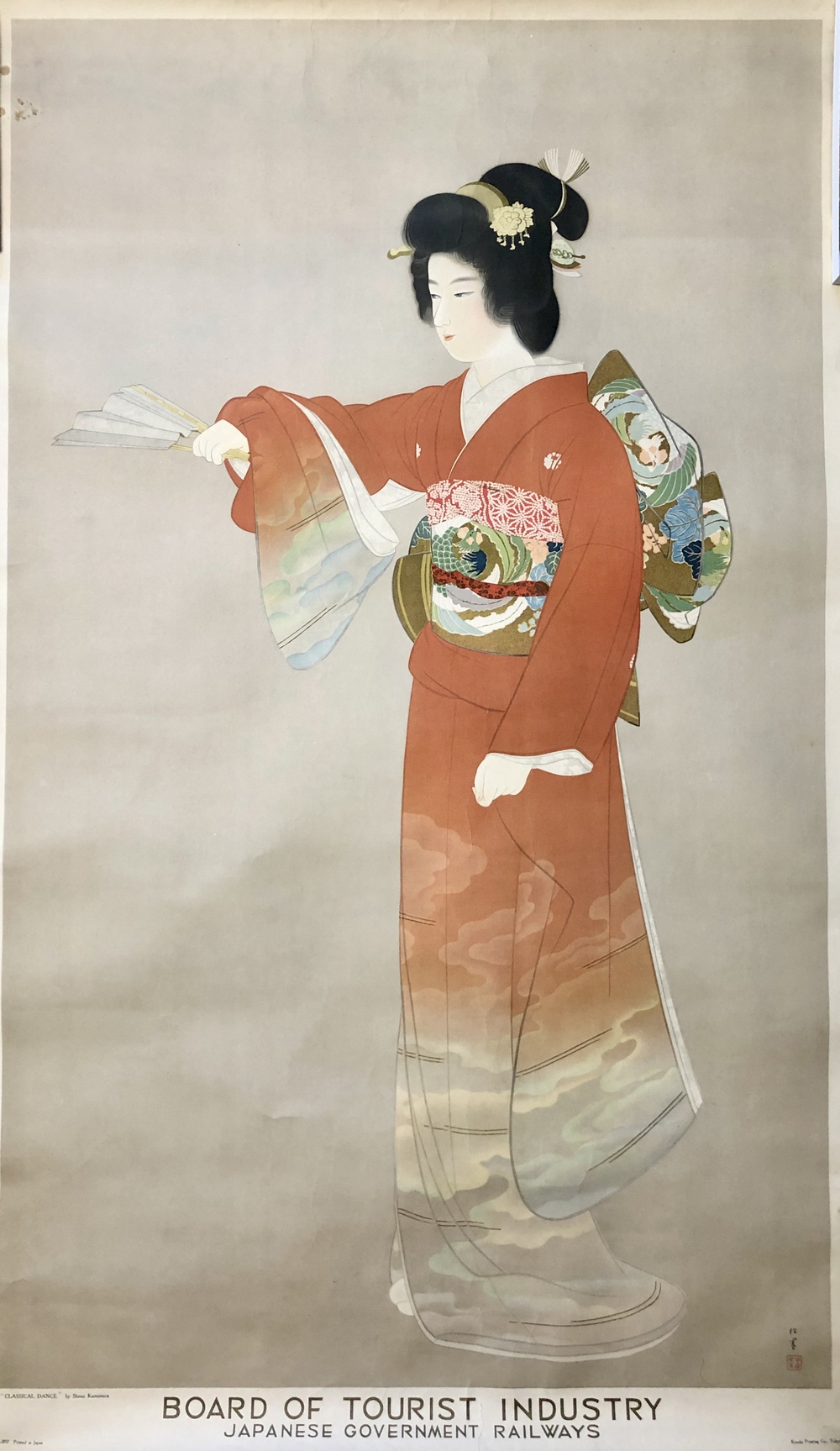ただいま解題準備中です。今しばらくお待ちくださいませ。 「1930年(昭和5)年4月、外客誘致の政府機関として鉄道省に国際観光局が新しく設置された。同局設立の目的は観光産業の振興であり、観光を通じた国際親善と外貨獲得にあった。 国際観光局はその初年度に富士山をバックに満開の桜の下で駕篭に乗る和装美人を描いた吉田発三郎の《Beautifu Japan(駕篭に乗れる美人)》を1万枚発行、その翌年には白黒のグラビア印刷のポスター6種(富士山、日光東照宮、鎌倉大仏、金閣寺、錦帯橋、弘前城)を発行し観光名所を前面に掲げた。その後、国際観光局は伊藤深水、川瀬巴水、上村松園、中村岳陵、堂本印象らを起用し、日本画独特の柔らかい色調や浮世絵を思わせる木版画を用いた観光宣伝用のポスターを制作した。国際観光局が制作したポスターの大部分は単に「JAPAN」と記されているだけで、しかも描かれているのは必ずしも観光名所というわけでもなく、外客誘致のための観光ポスターというよりも「美しい日本」というイメージづくりをねらって制作したものであったことがうかがえる。」 「国際観光局の第1号となるポスターのタイトルがまさしく「美しい日本(ビューティフル・ジャパン)」であったことが示すように、国際観光局がさまざまな印刷物を通じてめざしたのは、「美しい日本」というイメージを対外的に拡散し親日的なムードを醸成することにあった。その後の国際観光局のポスターには、富士山、日光東照宮、鎌倉大仏、金閣寺、錦帯橋、弘前城、大阪城、宮島、春日大社などといった日本の代表的な観光名所が、また、どこかの風景か特定することはできないものの神社の鳥居や五重塔などのように日本の観光イメージとしてこれまでにも繰り返されてきた記号的な題材が描かれてきた。だがその一方で、能楽「道成寺」の一場面を描いた伊東深水の《Japan(道成寺)》(1932年)、謡曲を舞う着物姿の日本女性の姿を描いた上村松園の《序の舞》(1936年)、日本が独特の柔らかい色調で山なみの背後に大きな日輪を描いた中村岳陵の《Japan(春山日輪)》(1939年)などのように観光ポスターとしての色彩がきわめて希薄なものも制作している。こうしたポスターの存在は、国際観光局による観光キャンペーンとは、外客誘致による外貨獲得だけでなく、観光宣伝を通じて「美しい日本」というイメージを国際社会に浸透させることで反日的な国際世論を是正し国際親善を推進するためのプロパガンダとして展開されていたことを示しているように思われる。 外国人のまなざしを意識しながら外客誘致のために作り出された日本の観光イメージには、版図を拡大し多民族国家としての成長をめざす帝国としての日本の姿を反映しながら、日本という国の輪郭線の更新にともなって新しく国土に組み込まれた地域の風物や観光資源も加えられていった。帝国としての日本の歩みを反映するかのように制作された日本の観光ポスターの存在は、それが外国人観光客を誘致するために、外国人観光客のまなざしだけを意識して作り出されたのではなく、日本人とその「共同体」に内在するひとびとのまなざしを意識しながら作り出されたものであった可能性をうかがわせる。そうした意味において、観光ポスターとは「美しい日本」というイメージを国際社会に浸透させるためだけでなく、日本人自身のために描かれた「自画像」だったともいえるだろう。「自画像」とは他者のまなざしを意識して作り出されたものでありながらも、同時に自分自身のまなざしを意識しながら描き出されるものでもあり、双方向的なまなざしのもとに成立するものといえる。つまり、国際観光局が作り出した観光ポスターには外客誘致という目的だけでなく、「共同体」への愛着や帰属意識を育み、ナショナリズムを強化するという作用をもたらすこともまた期待されていたに違いない。観光立国を通じて作り出された日本の観光イメージとは、帝国の内と外、自己と他者の両方に向けて発信された「自画像」であり、観光ポスターという形のプロパガンダとして眺めることができるだろう。」 (東京国立近代美術館編 / 木田拓也『ようこそ日本へ:1920-1930年代のツーリズムとデザイン』東京国立近代美術館、2016年、62頁、10頁より) 「1930年代から1940年代初頭、松園は作品を通して日本文化の特異性を様々な形で表現することに没頭していた。1936年の作品《序の舞》は、日本ファシズムを背景としていて、松園を含む美術家や知識人が「日本特有の文化」と理論づけていた能楽と幽玄の美学を追求した作品だ。1936年に描かれ、同年には文部省により購入された《序の舞》は、能楽という画題を介して日本の伝統にふれ、松園の作品の傾向をよく表す絵画と言ってよいだろう。作品の中の若い女性は鮮やかな赤い着物を纏い、姿勢を真っ直ぐ正して立っている。彼女の右手は前方に差し出され、その手には舞扇が握られている。女性は面や装束を着けずに