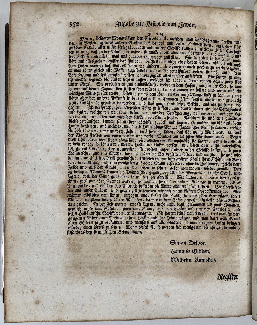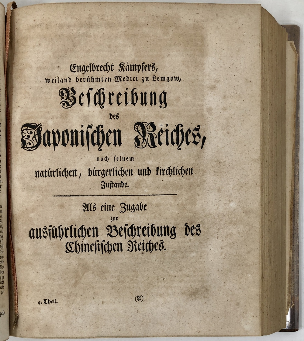 こうしたヨーロッパにおける中国誌研究の金字塔としての価値に加えて、日本関係欧文史料として本書が極めて重要なのは、第4巻の後半に600頁近くにわたってケンペル『日本誌』のドイツ語訳版が収録されていることです。これは、当然デュ・アルドによるフランス語原著にはなかったもので、ドイツ語訳版の訳者が本書のために新たに付け加えたものです。訳者の序文では、中国誌、韃靼誌と極めて関係が深い、日本誌についても読者の関心が高いであろうこと、にもかかわらず、不幸にもケンペル『日本誌』は、英語版、フランス語訳版、オランダ語訳版があるだけで、ケンペルの母語であったドイツ語版は未だ刊行されていない状況にあることに鑑み、本書に付録として収録することにした旨が記されています。よく知られているようにケンペル『日本誌』は、ケンペル自身によるドイツ語草稿をもとにして、没後に英訳されて出版されたもので、本来であれば英語版とドイツ語版とが同時に刊行される予定でしたが、不運によってそれが果たされず、正式なドイツ語版が刊行されたのは、英語版刊行から半世紀が経過した1777年から1779年にかけてのことです(ドイツ語版出版をめぐる不幸な歴史については、デレク・マサラ「『日本誌』史:ケンペル『日本誌』原稿の購入と出版」ベアトリス・M・ボダルト=ベイリー他編 / 中直一、小林早百合訳『遥かなる目的地:ケンペルと徳川日本の出会い大阪大学出版会、1999年所収に詳しい)。従って、18世紀ヨーロッパにおける日本観に決定的な影響を与えたことで知られるケンペル『日本誌』は、ドイツ語圏に関しては、本書が長きにわたって実質的にドイツ語訳版としての大きな役割を果たすことになりました。