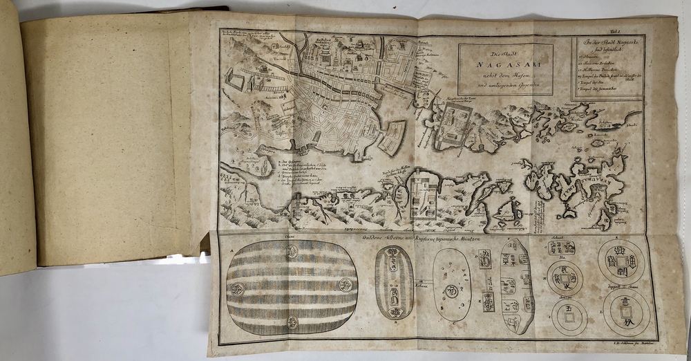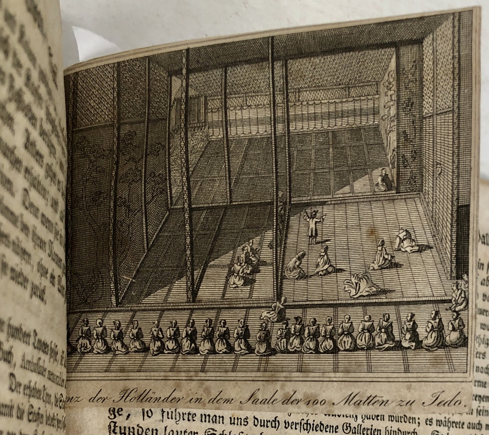 また、もう一つの折り込み図版は、長崎港の様子と日本の貨幣(大判、小判など)を描いたものですが、おそらくこれらもケンペル『日本誌』から直接採用したのではなく、むしろそれらを定本とした類似の別の著作から採用しているのではないかと思われます。また文中に挟み込まれる形で収録されている非常に小さな図版は、将軍綱吉の命に応じて、ケンペルが歌と踊りを披露している場面を描いた非常に有名な図ですが、大きさが極端に小さく(英語版では両頁見開き大)、これが本来本書に収録されるべき図版であったのか、あるいは当時の所有者が何らかの別の著作に掲載されていた図版を独自に綴じ込んだものなのかは判然としません。店主自身、この小さな図版が収録されている他の書物を確認することができていませんので、この点はもう少し解明すべき余地がありますが、いずれにしても大変ユニークな図版と言えます。