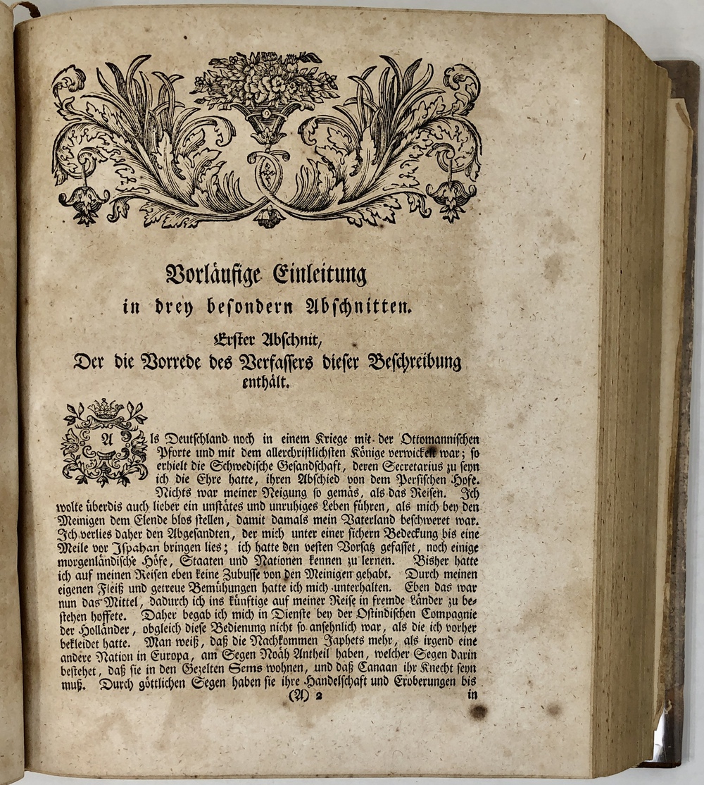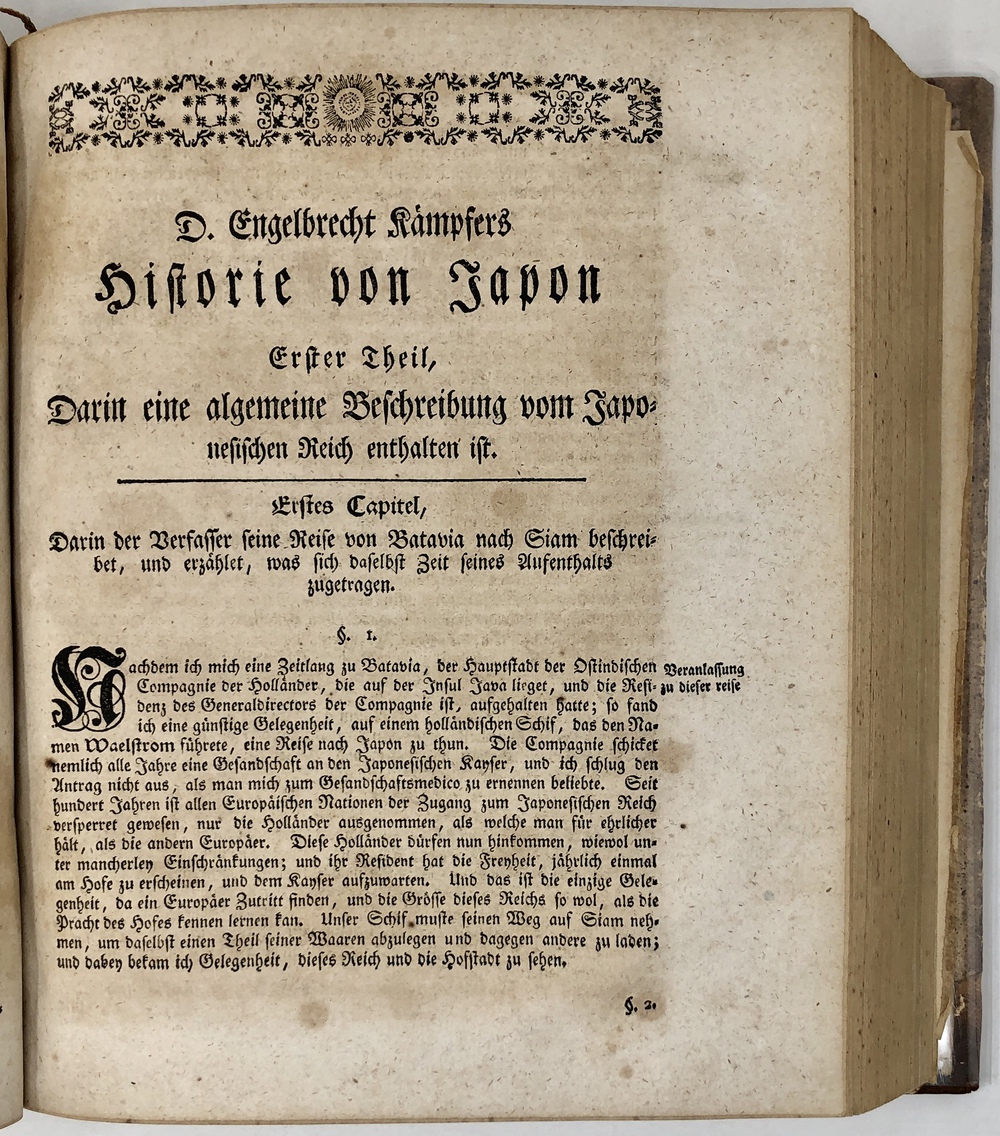 デュ・アルドの『中国誌』のドイツ語訳と同じく、本書に収録されているケンペルの『日本誌』も英語版原著の逐語訳ではないように見受けられますが、それでも600頁に迫る分量で構成されている本文は、抄訳というにはあまりにも巨大なものです。本書刊行後に、ドイツ語のさまざまな書物でケンペル『日本誌』の紹介や一部抜粋がなされるようになり、こうした書物が流布することでケンペル『日本誌』の影響が広がっていったことが知られています。こうした広がりも、本書における完訳ではないとはいえ極めて浩瀚なドイツ語訳が存在したからこそ可能になったもので、もし本書がなければ、ドイツ語圏におけるケンペル『日本誌』の伝搬は遥かに貧弱なものになってしまっていたのではないかと考えられます。その意味において、18世紀ドイツ語圏における日本観の形成において、本書の果たした役割は非常に大きなものといえます。本書のテキストが原著英語版と比べてどのような特徴を持っているのか、あるいは相違点がどのようなところにあるのかを調べるためには、両版を精査に照合して検証する必要があると思われますが、これもまた非常に興味深い重要な研究テーマと思われます。