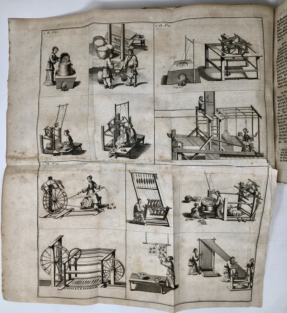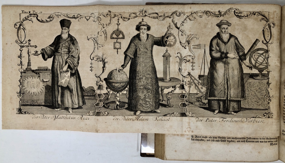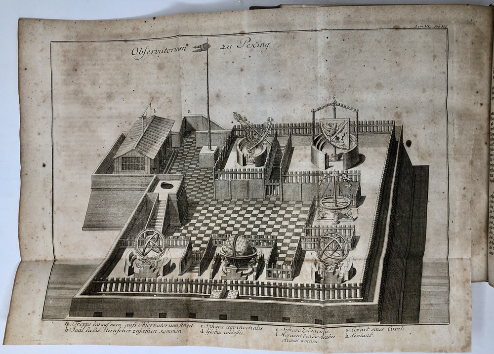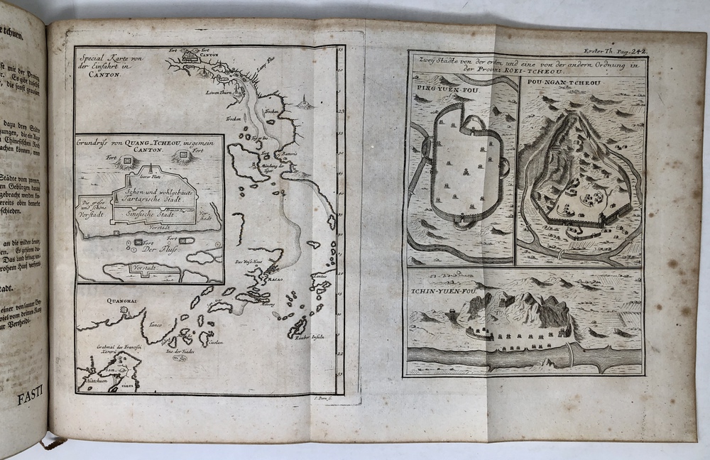 本書ドイツ語訳版は、原著全ての逐語訳ではなく、テキストや図版の一部を省略しているように見受けられますが、それでも四つ折り版の比較的大きな判型の書物で全4巻という非常に大部の作品となっています。全4巻のうち、第1巻から第3巻までが中国誌に当てられていて、第4巻の前半が韃靼誌となっています。省略があるとはいえ、非常に数多くの折り込み図版も収録されており、大変コストをかけた出版物であることがわかります。