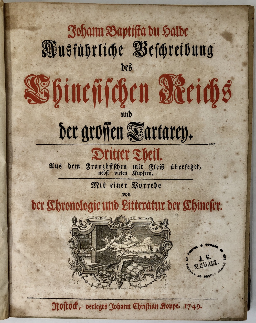 デュ・アルド自身は中国に実際に赴くことはありませんでしたが、16世紀末から18世紀に至るまでのイエズス会による世界各地の宣教活動を全36巻に編纂した『イエズス会士による外国宣教に関する強化的で興味深い報告書集』(Lettres édifiantes et curieuses écrites des missions étrangères, par quelques missionnaires de la Compagnie de Jésus. 34 vols. 1702-76)の編纂作業を通じて、中国をはじめとした東アジアに強く関心を持つようになったと言われています。そのデュ・アルドがイエズス会士がもたらしたあらゆる中国に関する事項を纏め上げ、包括的な『中華帝国誌』として刊行した作品が、本書の原著となったフランス語版です。この著作は全4巻で構成されていて、中国の概説に始まり、歴代王朝史、王朝の内部と統治機構、主要な産業や農業、漁業、人びとの文化と風習、流通と経済状況、諸学問、宗教、産物について韃靼誌も含めて網羅的に論じ、また数多くの図版や地図も収録して、18世紀のヨーロッパにおける中国研究の金字塔となりました。初版刊行の翌年(1736年)に再版(海賊版)が刊行されただけでなく、英訳(1736年)、ロシア語訳(1774年−1777年)など各国語にも翻訳されるほどの大きな反響を呼び、本書であるドイツ語訳版は、1747年から1749年にかけて刊行されています。