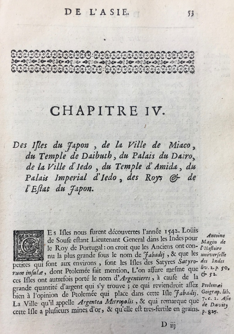 DE L’ASIE. CHAPITRE PREMIER. De l’ Asie ancienne & modern en general. [with] DE L’ASIE. CHAPITRE IV. Des Isles du Japon, de la Ville de Miaco, du Temple de Daibuth, du Palais du Dairo, de la Ville d’ Iedo, du Temple d’ Amida, du Palais Imperial d’ Iedo,