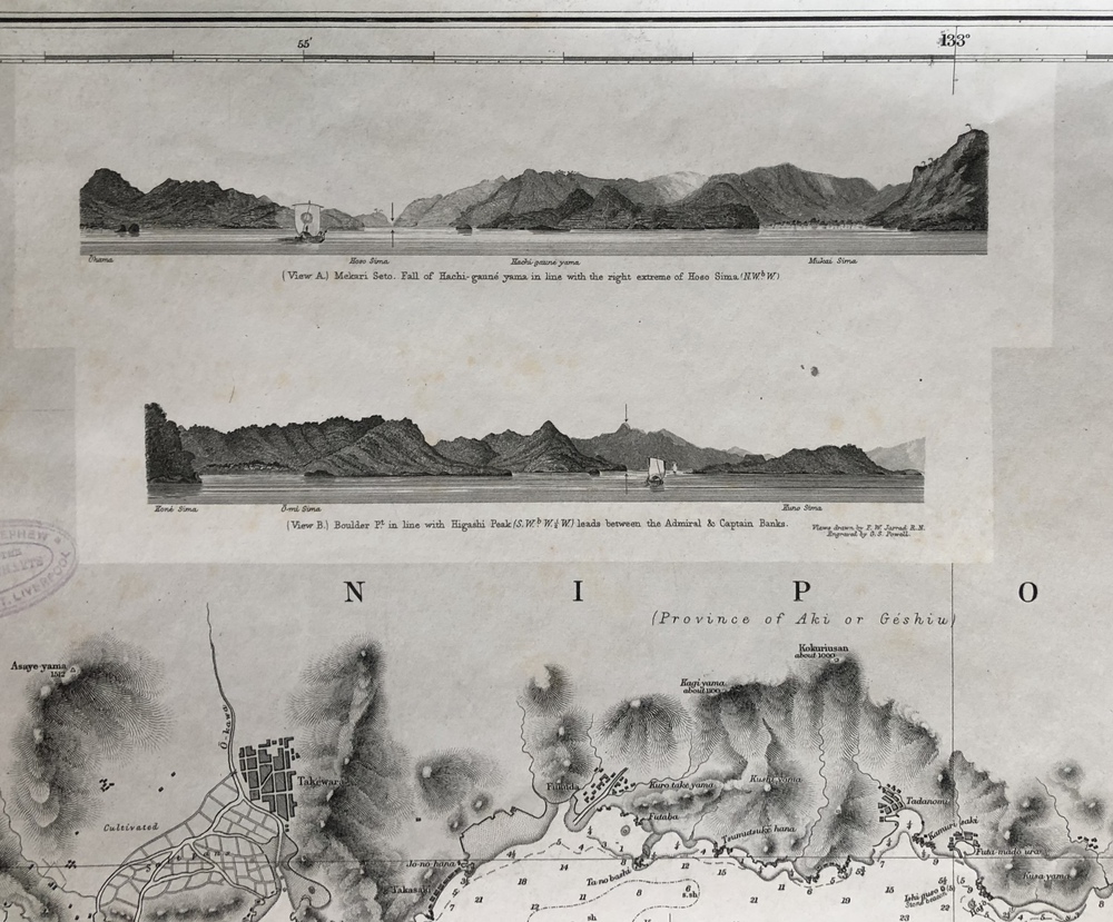 江戸幕府そのものが消滅することにより、残念ながらオランダ経由での近代測量技術と海図作成術については、一旦その継承が途絶えてしまいますが、明治政府も1871年に兵部省内に海軍部を設立すると同時に、水路業務の重要性を認識するようになります。当時は日本自前の海図がなかったことから、条約を締結した欧米各国が日本近海の測量を精力的に行っており、貿易、軍事上必須となる日本近海の海図を出版していましたが、中でもイギリスは当時最強の海軍力を有していたこともあり、最も広範囲にわたって測量と海図作成を行っていました。