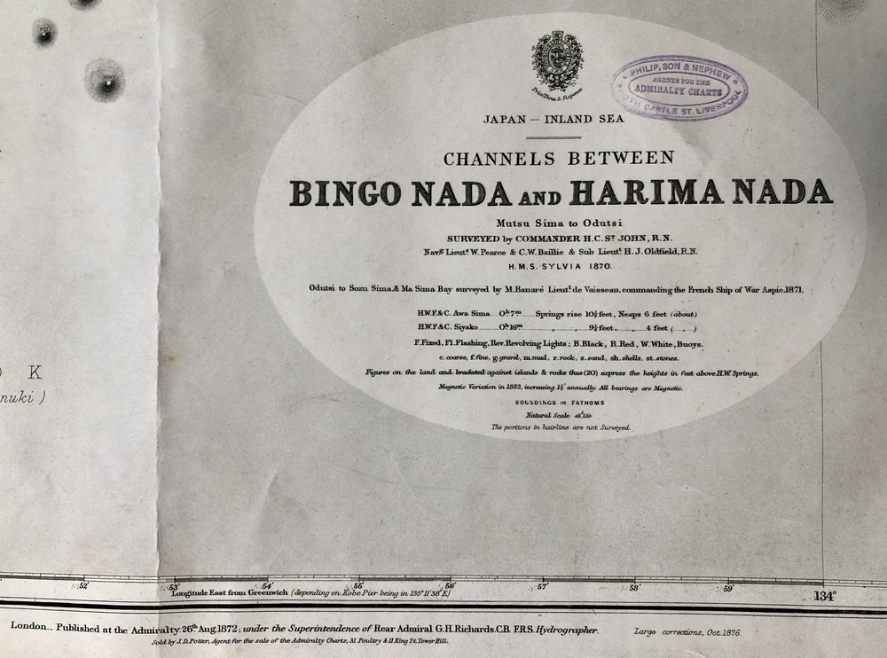 「1870年のセント・ジョン中佐のシルヴィア号調査に基づく備後灘と播磨灘間の水路(いわゆる塩飽諸島近海図)」1872年初版 1876年改訂