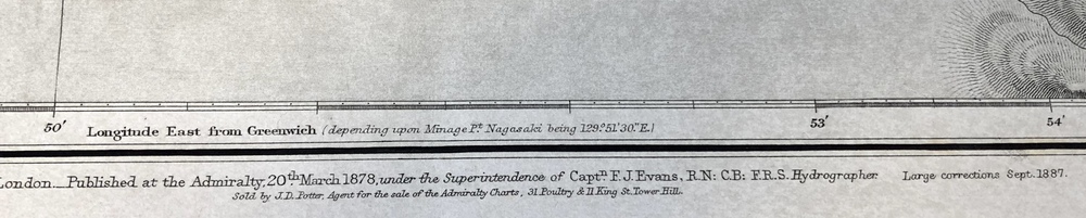 また、④は、言うまでもなく最重要の海難所である関門海峡を描いたもので、1872年から1875年にかけて入念に調査がシルヴィア号によって行われています。この図がユニークなのは、シルヴィア号の調査の10年後に水路測量に関する技術を蓄積しつつあった日本による、最初の本格的な全国測量計画である「全国海岸測量12カ年計画」に基づいて、肝付兼行少佐らが1885年に実施した測量成果を盛り込んで、改訂を加えている点です。「同海峡については、1881年版の英国海図があるが、重要な航路でもあり、また潮流現象もすこぶる複雑であるため改訂の変貌が必ずあると考えての測量(4月〜6月)であった。」(前掲書40頁)とあることから、肝付らによる日本の調査が英国水路部の海図に影響をもたらしたという点で、①から③とは逆の流れの情報移転を見ることができる興味深い海図です。