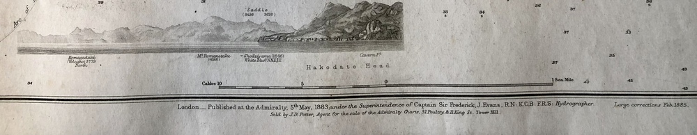 「1881年のホスキン大尉と海軍士官のフライングフィッシュ号調査に基づく函館湾」1883年初版 1885年改訂