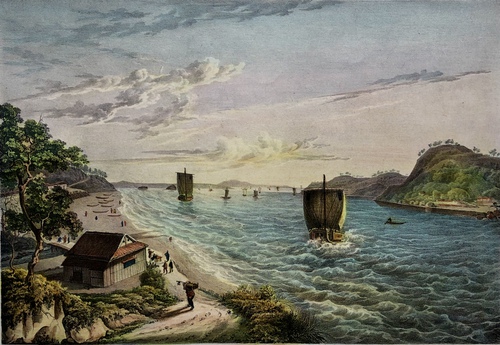 GEZIGT OP DE STRAAT ANSICHT DER STRASSE VAN DER CAPELLEN. Vue du détroit de Vander Capelle. (VOYAGE AU JAPON. PLANCEE 8)