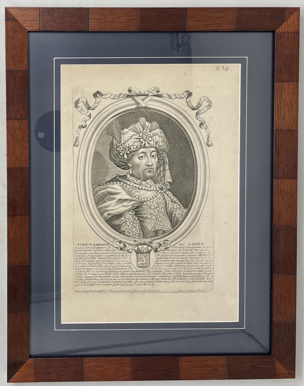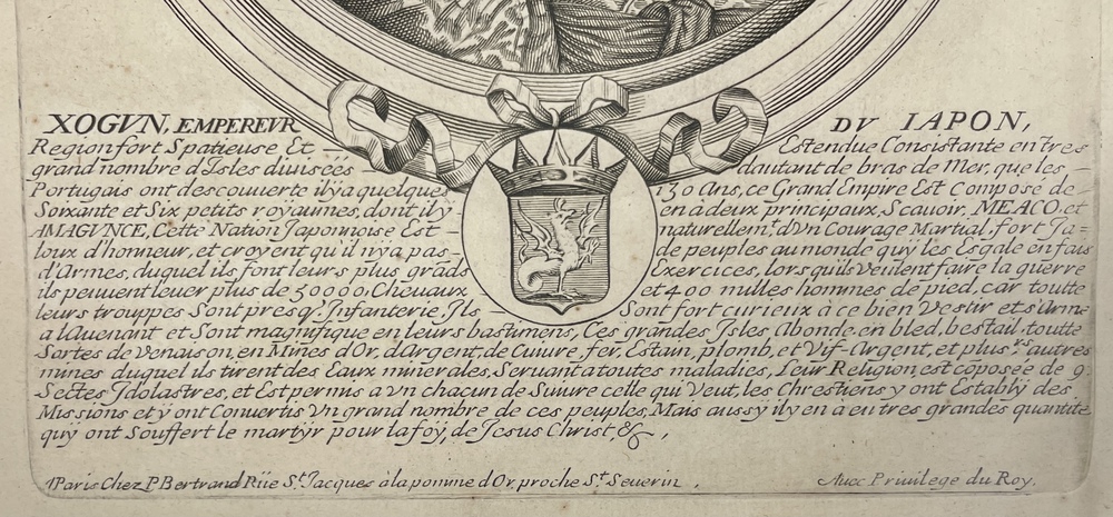このユニークな銅版画は、日本の将軍を想像で描いたもので、17世紀後半頃にパリで出版されたものです。描写自体は非常に精巧で写実的ですが、実際に日本の衣装とはかけ離れた姿で描かれていて、当時のヨーロッパにおける日本の君主像の一例を垣間見せてくれる作品です。本図が製作された17世紀のヨーロッパでは、日本の殉教者を描いた様々な銅版画作品が製作されていますが、本図は、そうした殉教事件を引き起こした迫害者である「暴君」としての日本の為政者を描いた同時代の作品として、非常に興味深い作品ということができます。 この図を描いたのは、ラルメッサン(一世、Nicolas de Larmessin I, 1632-1694)で、 ルイ14世をはじめとして本図を含めた世界の君主を描いた銅版画作品を制作したことで知られています。これらの君主を描いた銅版画作品は、何らかの書籍のために用意されたものではなく、当初から独立した個別の作品としてそれぞれ製作されたようで、全体でどれほどの作品が製作されたのかについては定かではありません。いずれの作品も非常に精巧で写実的な表現がなされていることが特徴で、版画作品としては高い評価を受けているようです。 ラルメッサンがなぜ「日本の将軍」を描こうとしたのかは不明ですが、図像の下部にびっしりと記されたテキストから推察すると、おそらくはイエズス会士らの日本報告書などを参照にして本図を製作しているようです。テキストでは、日本についての概説的な解説がなされていて、日本は「約130年前にポルトガル人が発見した」島国であるとされています。この記述から、この図版が製作されたのがおおよそ1670年代前後であることが推測できます。日本は66の小さな王国から構成されていて、それらのうちの主要な王国は「京都(Meaco)」と「山口(Imagunce)」であると説明されていて、江戸時代以降のオランダ人らによる日本情報ではなく、それ以前のイエズス会士らの日本報告を参照していることがうかがえます。日本の人々は名誉を重んじて、軍人として極めて勇敢で、幼い頃から武器とっているとして、強大な軍隊が存在することが強調されています。また、金、銀、銅、鉄、鈴、鉛等の鉱物資源が豊富に産出するとも紹介されています。日本の宗教については、9つの偶像崇拝の宗派があるが、宣教師によるキリスト教の改宗が行われ、その結果多くのキリスト教信者が生まれたが、その信仰のゆえに殉教を余儀なくされた人々が日本には数多くいるとしています。この短いながらも充実した記事からは、日本の将軍に対してラルメッサンがいかなる評価を有していたのかを具体的に伺うことはできませんが、文末にキリスト教の迫害と殉教者のことについて言及していることから、こうした迫害を行なった「将軍」を少なくとも肯定的には捉えていないのではないかと思われます。 秀吉や家康といった、キリスト教迫害期に強大な権力を獲得していった日本の為政者を銅版画作品で描く試みは、イタリア人クラッソ(Lorenzo Crasso, 1623 - 1691)が1683年にヴェネツィアで出版した『著名武将列伝 (elogii di capitani illustri scritti. Venice, 1683)』において描かれた秀吉、家康の図が代表的なものとして知られていますが、本図はこれに連なる同時代の優れた作品と考えることができます。本図とクラッソの作品に共通しているのは、キリスト教徒を迫害した残忍な為政者として「将軍」を描く一方で、その強大な権力と富を、西洋諸国の強大な君主に匹敵する存在として描く姿勢です。こうした描き方は、(それが作者の意図であったかどうかは別にして)結果的に、こうした強大な権力を有する「暴君」による迫害にもかかわらず、それに屈することなく信仰を貫いたキリスト教信者を間接的に称賛する効果をもたらしているとも言えます。その意味では、17世紀のヨーロッパで製作された日本の殉教者を描いた様々な銅版画作品と並んで、そうした迫害をもたらした側の為政者(「暴君」)を描いた同時代の銅版画作品として、大変興味深い作品と言えるでしょう。なお、クラッソの作品が書物として出版されているのに対して、本図は1枚ごとの単独の銅版画作品として製作されているため、その現存数は、かなり少ないのではないかと思われます。