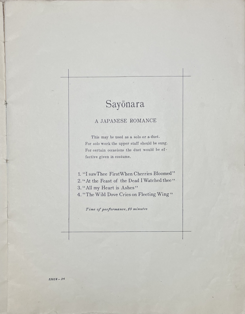 SAYŌ NARA. A JAPANESE ROMANCE FOR ONE OR TWO VOICES. FOUNDED UPON JAPANESE "MELODIES".