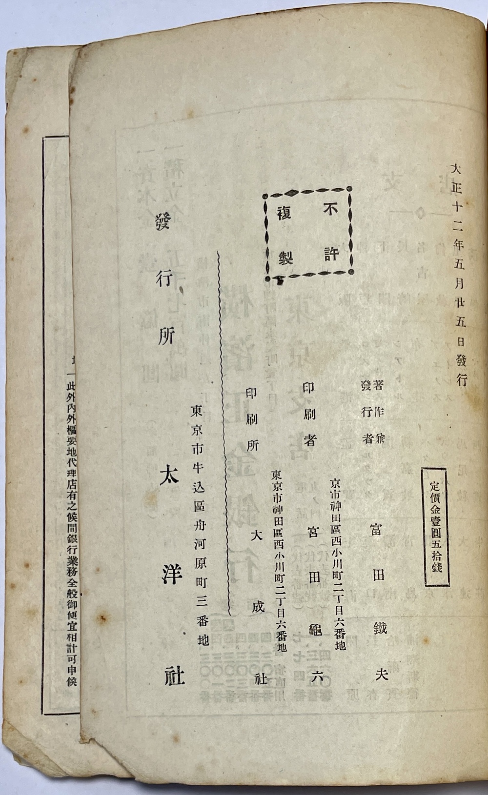 奥付と裏表紙の余白部分に欠損あり。全体的にシミとヤケが見られる。ホチキスによる簡易製本で金具のサビ、外れ箇所あり。[NCID: BA66263525]