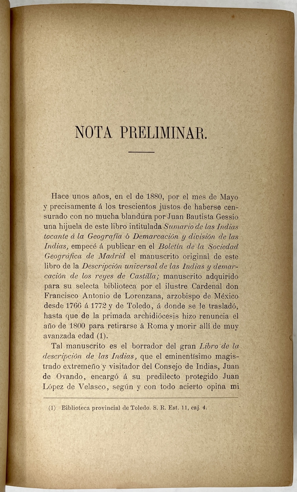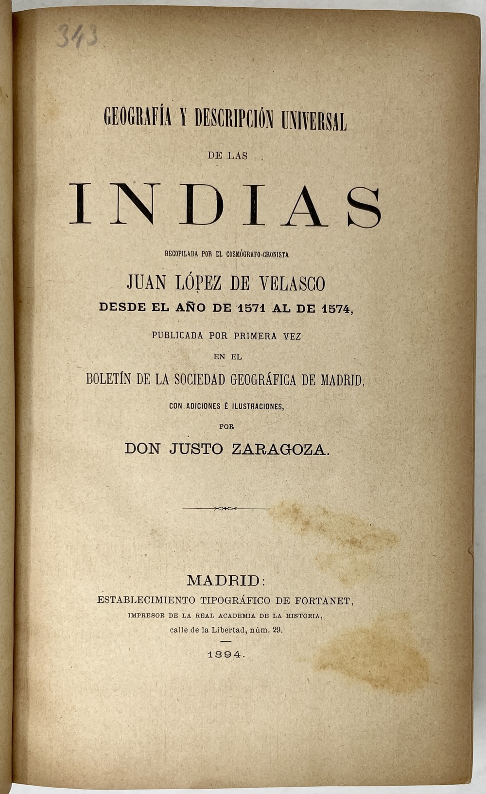 GEOGRAFÍA Y DESCRIPCIÓN UNIVERSAL DE LAS INDIAS RECOPILADA POR EL COSMÓGRAFO-CRONISTA JUAN LÓPEZ DE VELASCO DESDE ELAÑO DE 1571 AL DE 1574, PUBLICADA POR PRIMERA VEZ EN EL BOLETÍN DE LA SOCIEDAD GEOGRÁFICA DE MADRIDO,…