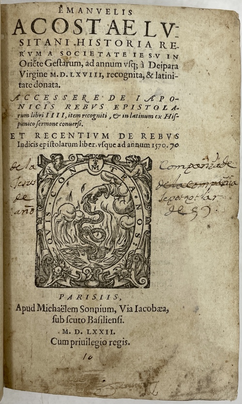 EMANVELIS ACOSTAE LVSITANI HISTORIA RERVM A SOCIETATE IESV IN Oriete Gestarum, ad annum vsq; a Deipara Virgine M.D. LXVIII, recognia, & latinitate donata. ACCESS ERE DE IAPONICIS REBVS EPISTOLArum libri IIII, item recogniti, & in latinum ex Hispanico serm