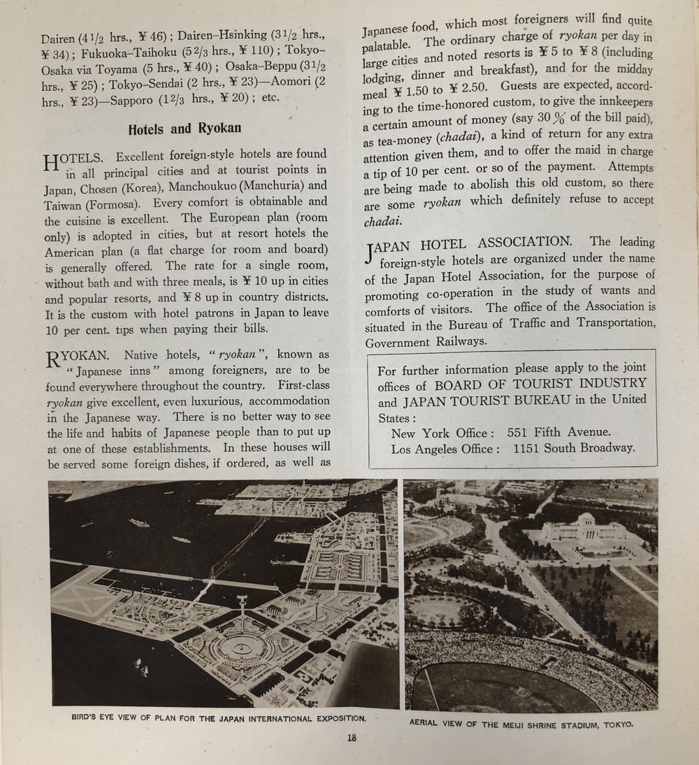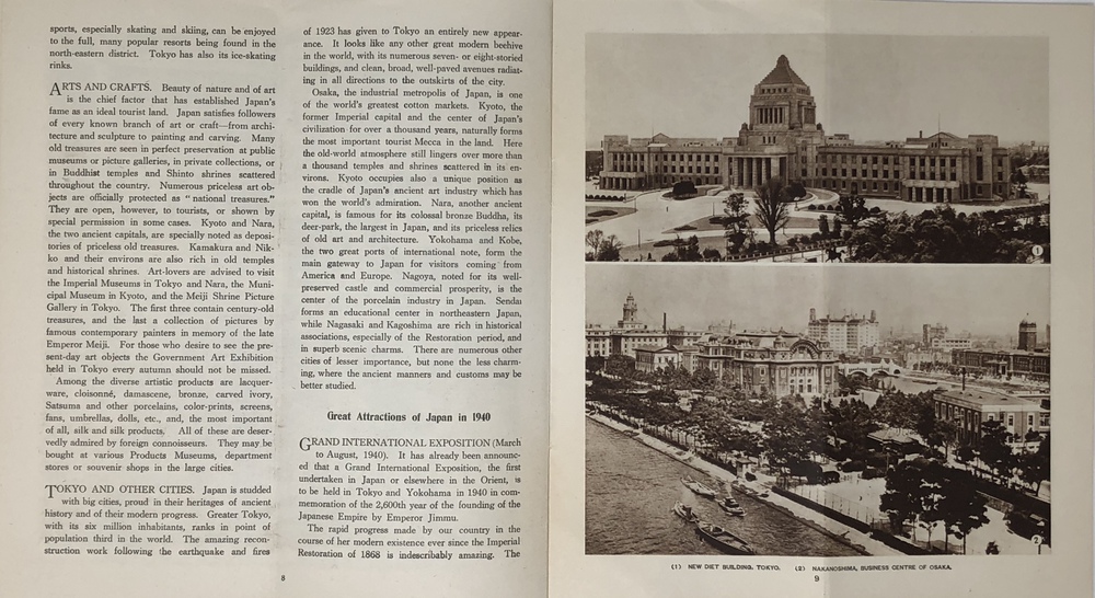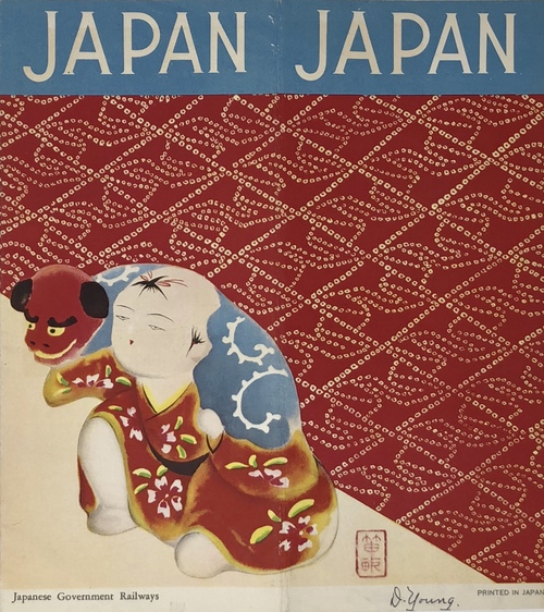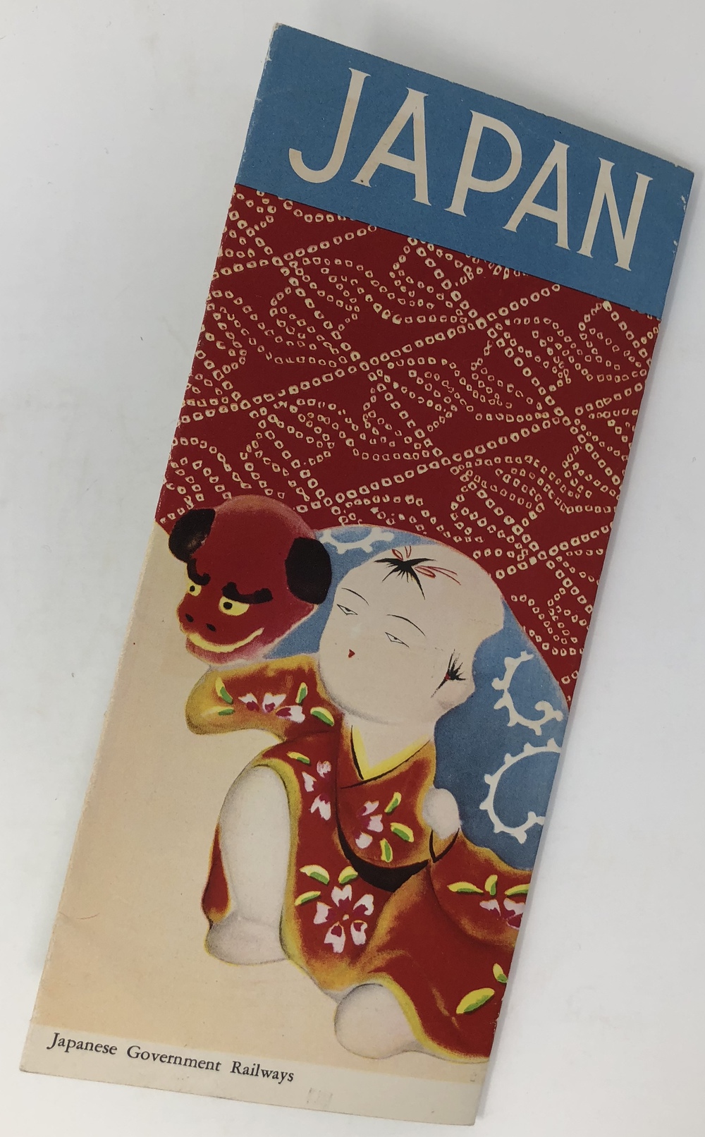 本書JAPANは1913年のビューローによる発刊から続く、当時を代表する英文ガイドブックで、特徴的なイラストを用いた表紙デザイン、中心部を折ることで持ち運びに便利な縦長の形状になるという共通点を継承して、鉄道省が発行するようになってからも刊行が続けられました。本書は、おそらく1937年ごろに刊行されたと思われるものです。 稚児と獅子舞を描いたカバーデザインで、製作者の落款がありますが、残念ながら店主には作者を特定できていません。同年代にビューローが観光していた英文の旅行案内が来日した観光客を対象とした実用的な情報を重視していたのに対して、本書は当初からの特徴である写真を多用したビジュアルな構成となっており、観光誘致を目的としていることがわかります。多くの写真は版を改めるごとにほぼ全て入れ替えられており、本書では完成して間もない国会議事堂(帝国議事堂)や1918年に完成した大阪中之島公会堂の写真などが収録されています。 また、本書では1940年に開催されるはずだった「幻の東京・横浜万博」と「東京オリンピック」に向けて、両イベントを海外に向けて広く発信することに重きが置かれていることが非常に特徴的です。皇紀2600年を世界的なイベントを同時開催することで内外で盛大に祝うことを狙ったもので、両イベントの概要や1940年の意義を強調するとともに、万博の東京会場予定図(掲載されている図が1937年7月まで計画されていた初期会場案であることから、本書が1936年後半から1937年前半に刊行されたことが推察できます)まで掲載しています。当時の国際観光政策にとって、1940年がいかに重要視されていたのかを物語るものですが、周知の通りいずれのイベントも開催されることはありませんでした。