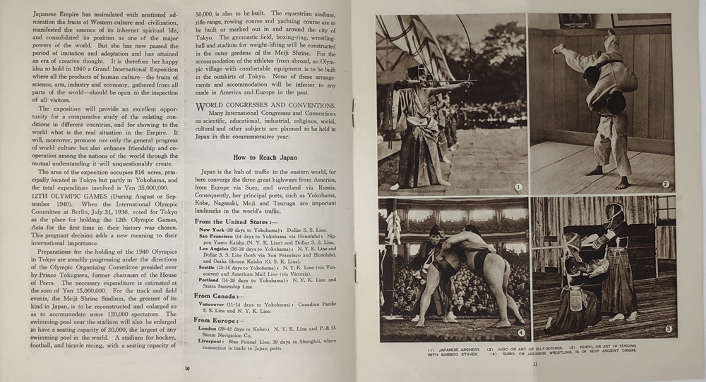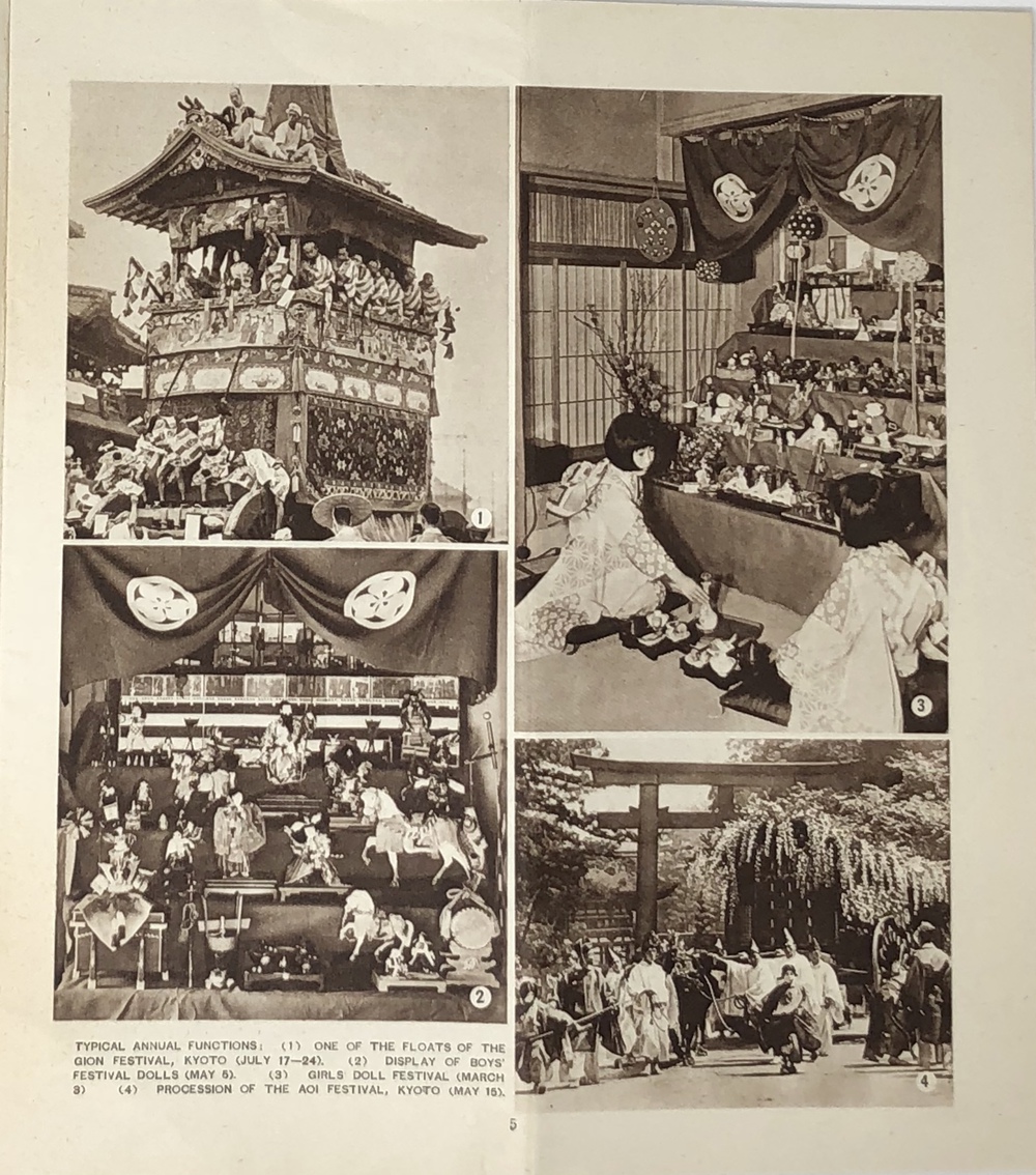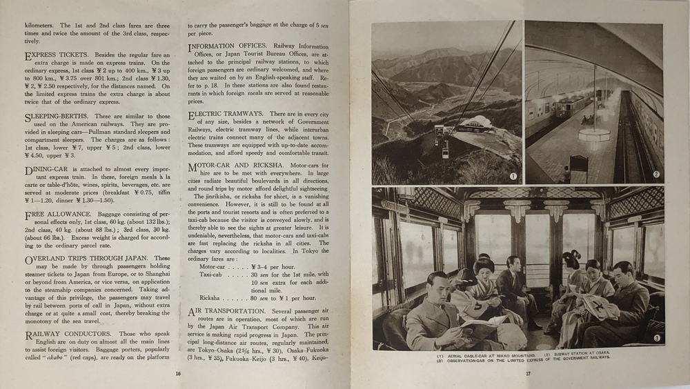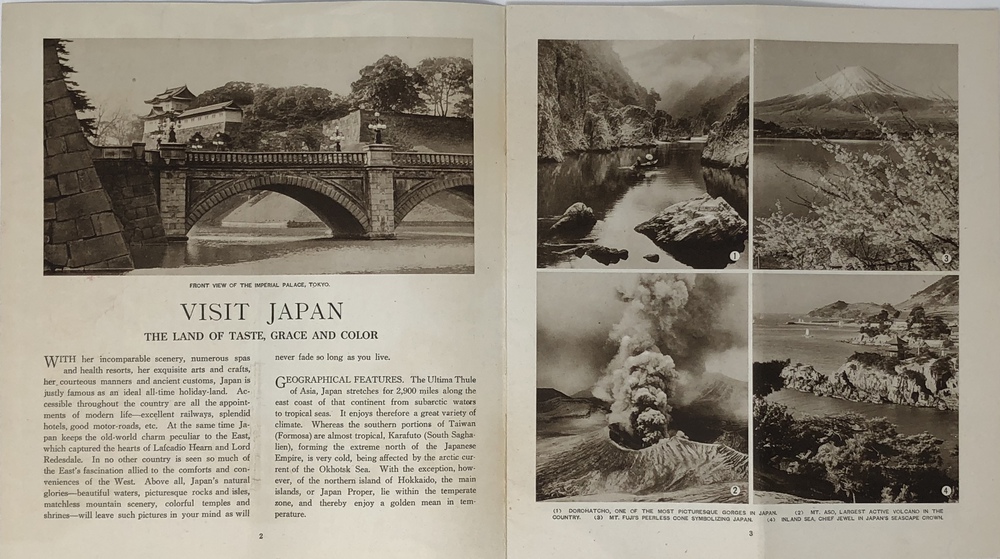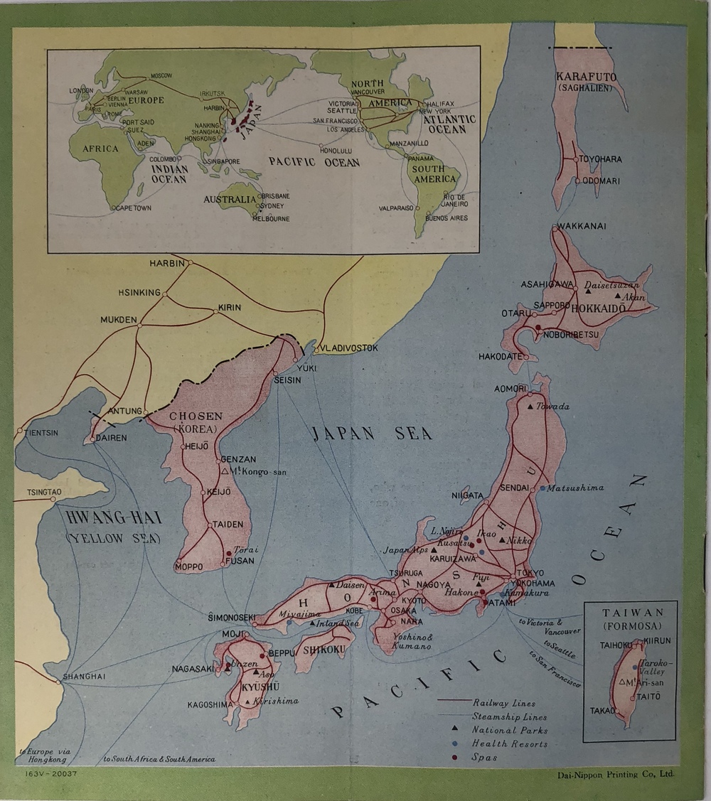 本書JAPANは1913年のビューローによる発刊から続く、当時を代表する英文ガイドブックで、特徴的なイラストを用いた表紙デザイン、中心部を折ることで持ち運びに便利な縦長の形状になるという共通点を継承して、鉄道省が発行するようになってからも刊行が続けられました。本書は、おそらく1937年ごろに刊行されたと思われるものです。 稚児と獅子舞を描いたカバーデザインで、製作者の落款がありますが、残念ながら店主には作者を特定できていません。同年代にビューローが観光していた英文の旅行案内が来日した観光客を対象とした実用的な情報を重視していたのに対して、本書は当初からの特徴である写真を多用したビジュアルな構成となっており、観光誘致を目的としていることがわかります。多くの写真は版を改めるごとにほぼ全て入れ替えられており、本書では完成して間もない国会議事堂(帝国議事堂)や1918年に完成した大阪中之島公会堂の写真などが収録されています。 また、本書では1940年に開催されるはずだった「幻の東京・横浜万博」と「東京オリンピック」に向けて、両イベントを海外に向けて広く発信することに重きが置かれていることが非常に特徴的です。皇紀2600年を世界的なイベントを同時開催することで内外で盛大に祝うことを狙ったもので、両イベントの概要や1940年の意義を強調するとともに、万博の東京会場予定図(掲載されている図が1937年7月まで計画されていた初期会場案であることから、本書が1936年後半から1937年前半に刊行されたことが推察できます)まで掲載しています。当時の国際観光政策にとって、1940年がいかに重要視されていたのかを物語るものですが、周知の通りいずれのイベントも開催されることはありませんでした。