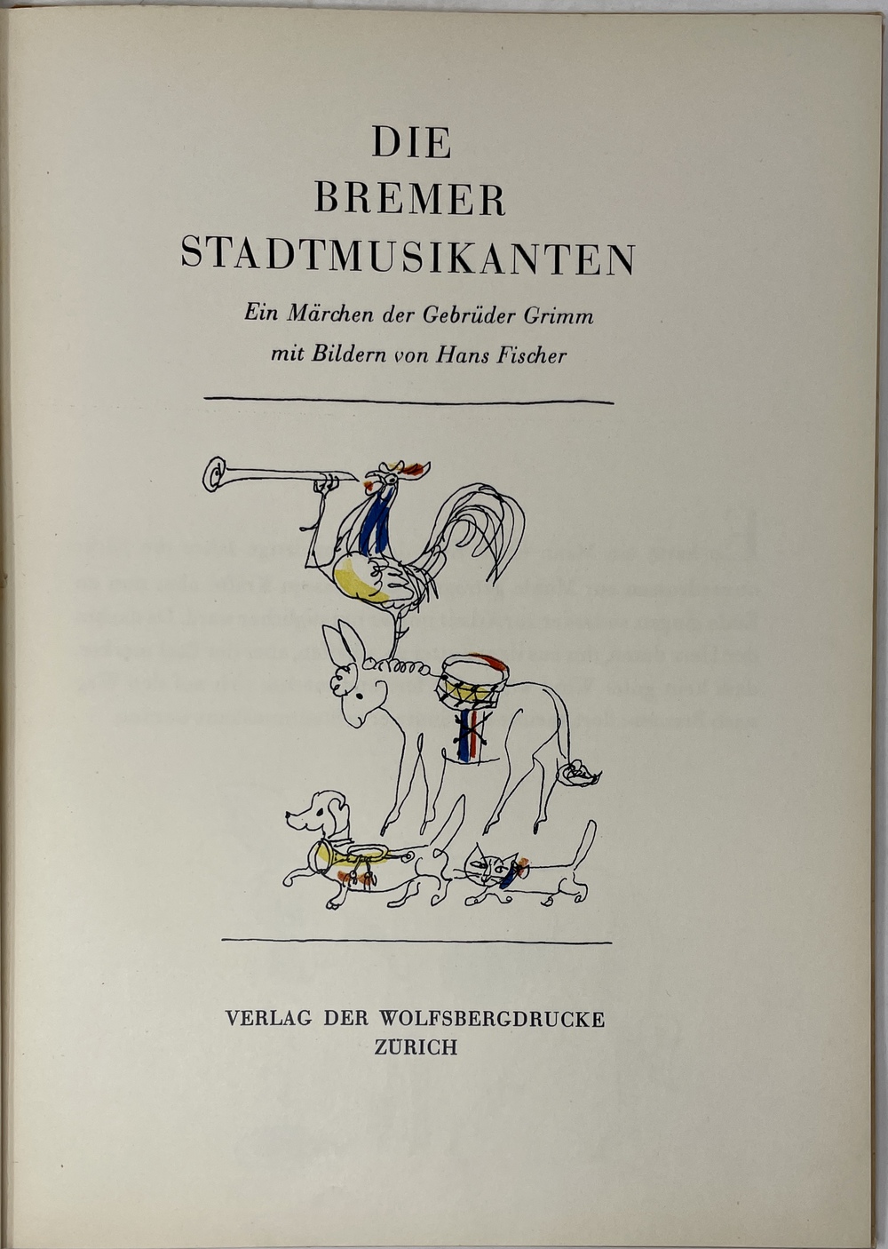 DIE BREMER STADTMUSIKANTEN. Ein Märchen der Gebrüder Grimm mit Bildern von Hans Fischer.