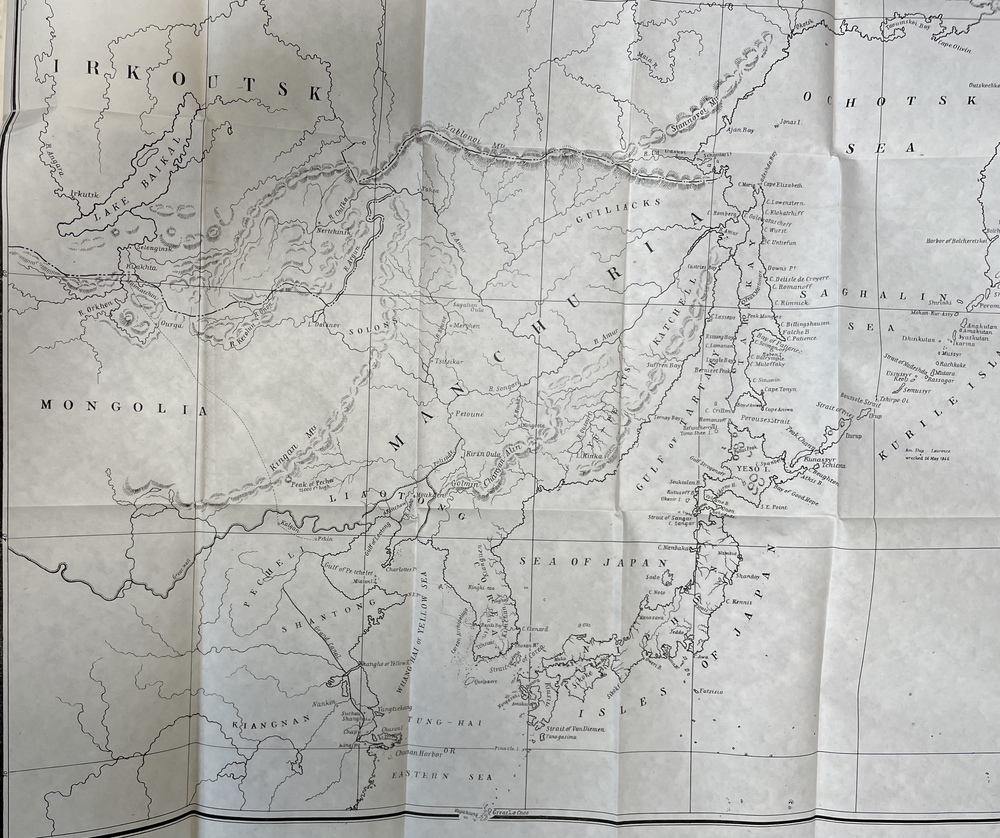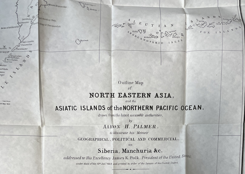 また、巻末にはパーマがこの提言のために製作した折り込みの大きな地図が収録されています。この地図は、日本や中国沿岸部を、アリューシャン列島などを中心に描いた太平洋図で、本書で論じられている地域の地理情報を一眼で理解することができる地図となっている非常にユニークな地図です。この地図は当時の議会関係者にとって非常に有益な情報なるとともに、パーマーの主張に対する理解を促進する上でも大いに役立ったことと思われます。