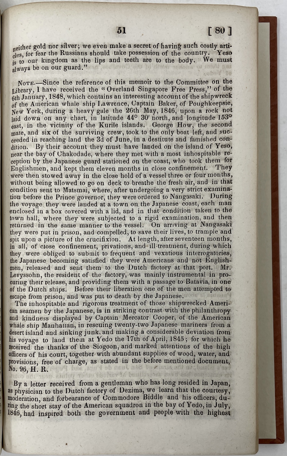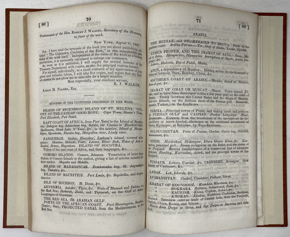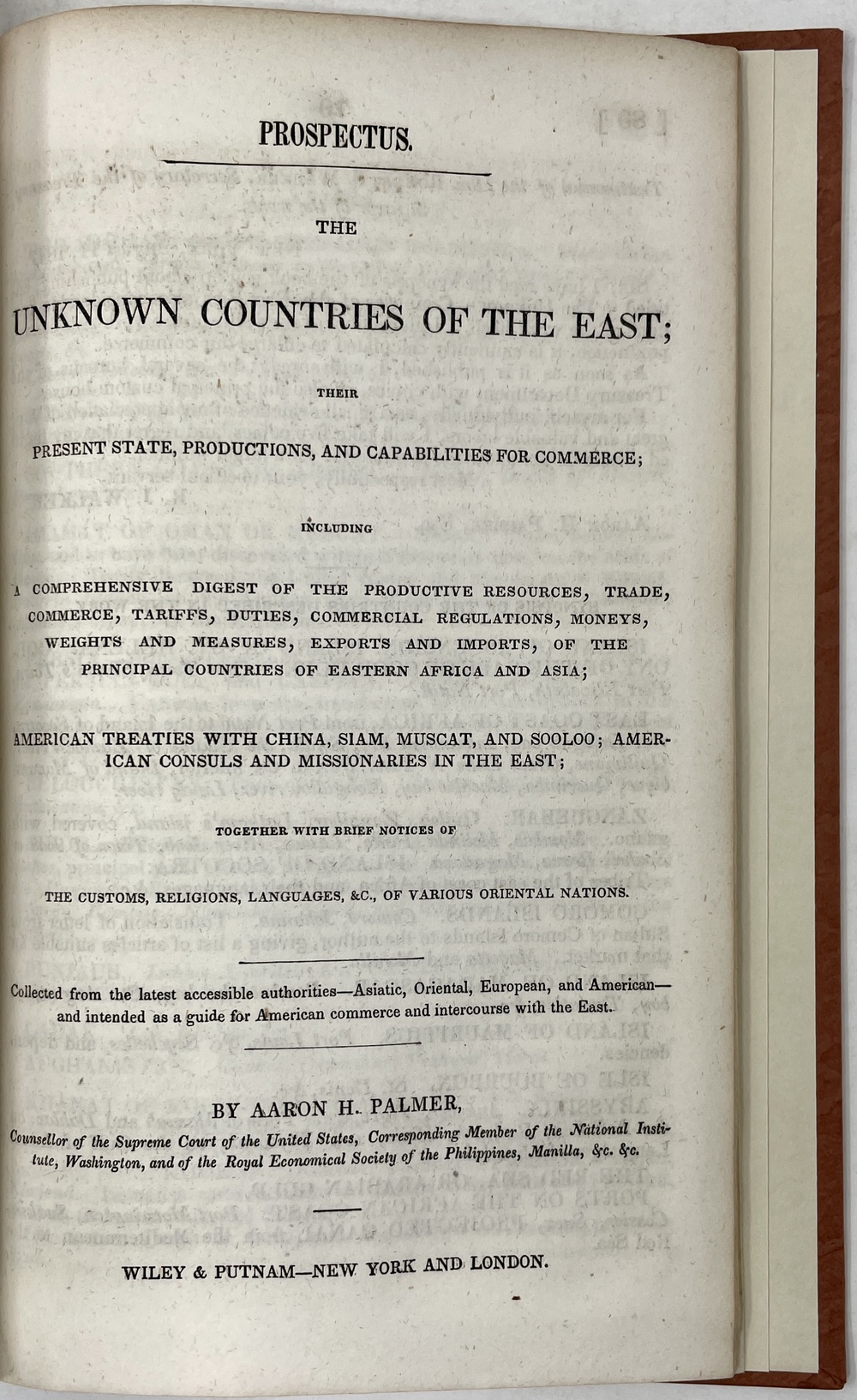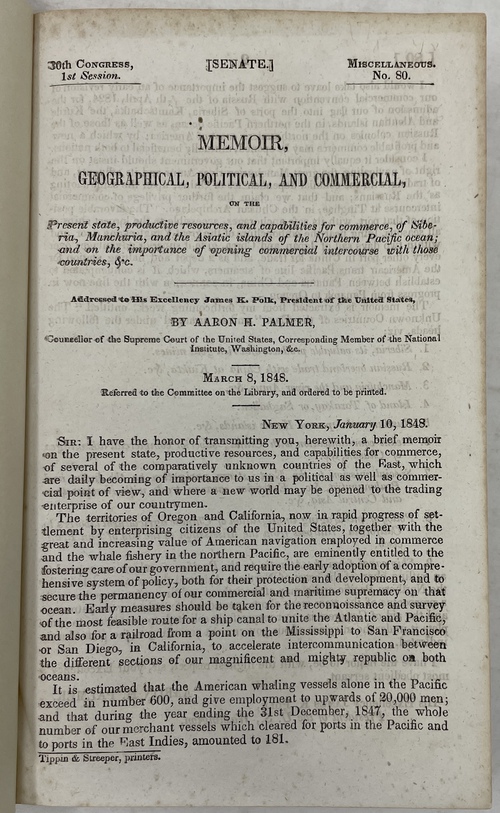 本書は、ペリー(Matthew Carlbarith Perry, 1794 -1858)による日本遠征隊の実現に向けて活躍したロビイストであったパーマー(Aaron Haight Palmer, 1785? - ?)によって書かれた、「東方の未知の国々 (The Unknown countries of the East)」とアメリカが通商関係をいち早く結ぶことを提言したもので、アメリカ議会の公式文書の一つとして1848年に刊行されたものです。