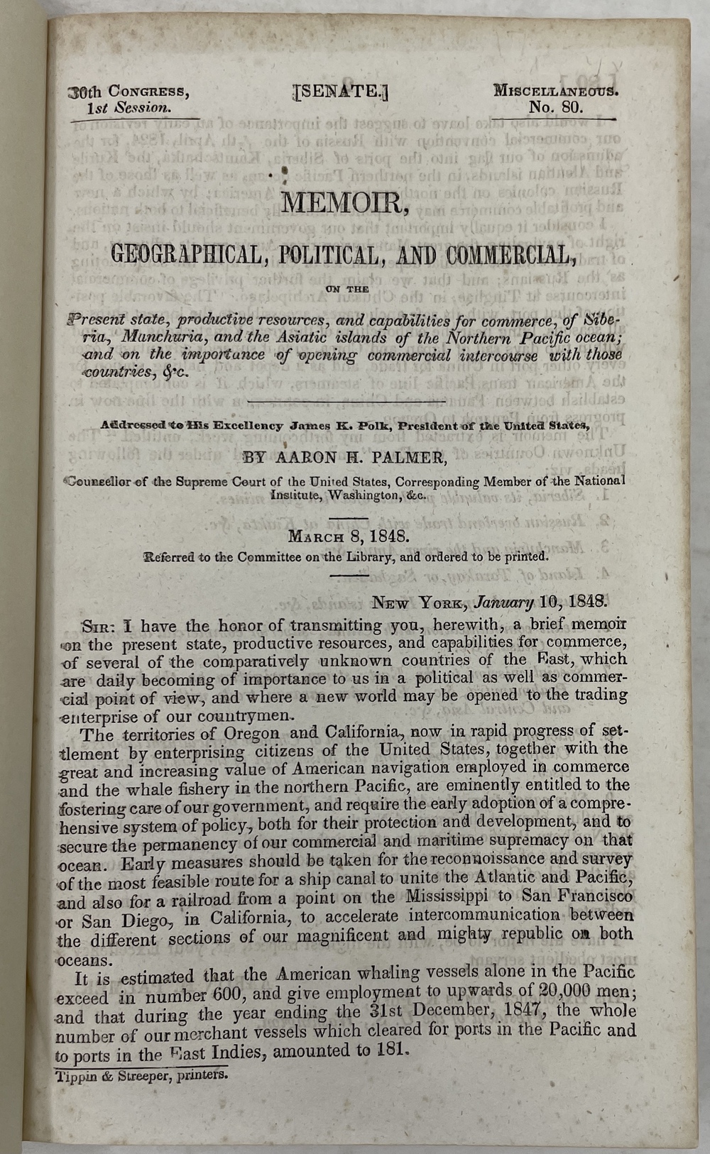 そのパーマーが、1848年1月10日付で大統領ポークに送った提言書(本書のこと:引用者注)が議会文書のなかに残されている。かなりの長文であるが、序文のパーマー自身の用紙をもとにまとめると、その最大の目的は、北太平洋諸地域の国々、地域と通商関係を結び、アメリカの商圏を拡大することにある。そして、この提言の背景には、パーマー自身が述べるように、オレゴン、カリフォルニアというアメリカ西部への入植者の急増という状況があった。また、彼は太平洋における捕鯨業の隆盛にも言及し、太平洋を往来する商船も含めて、同海域でのアメリカ人保護のための、「政府による包括的な体制の早期採用」を求めたのである。